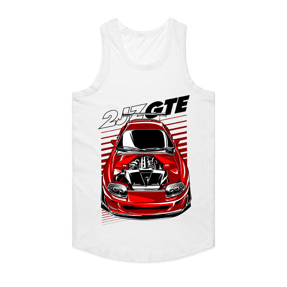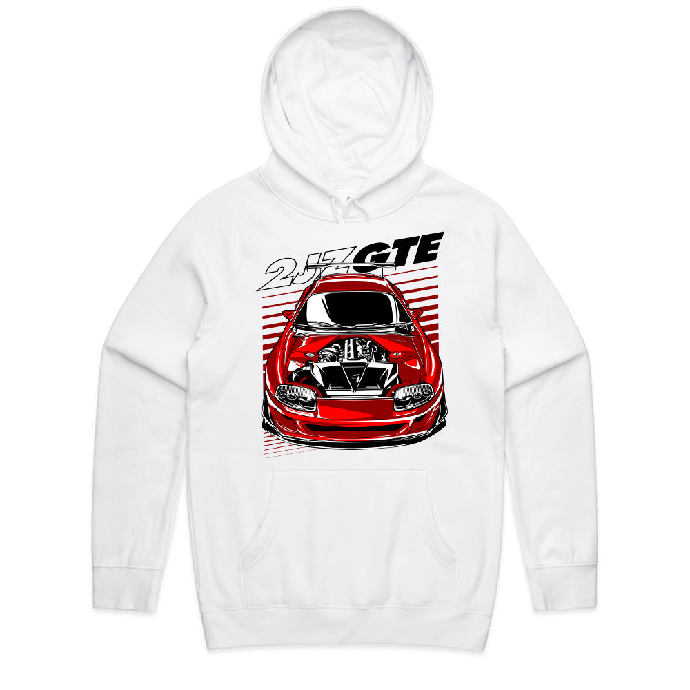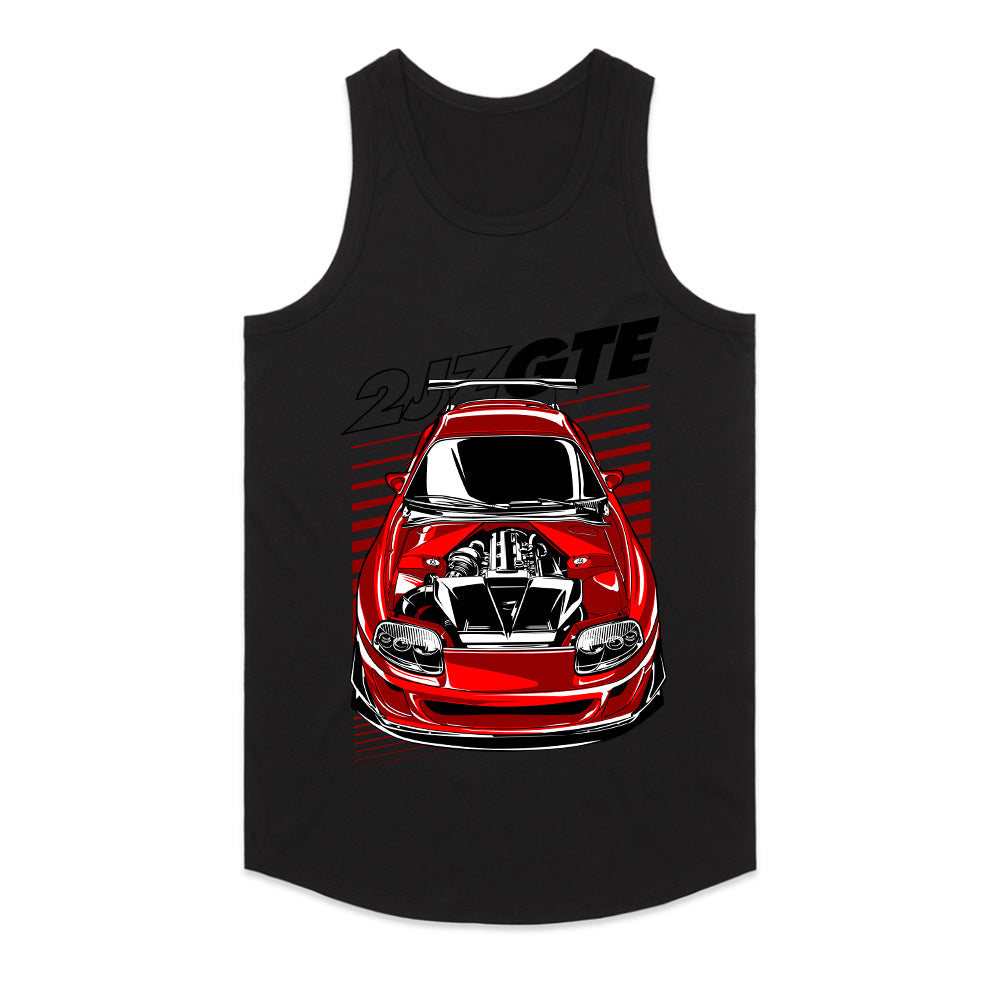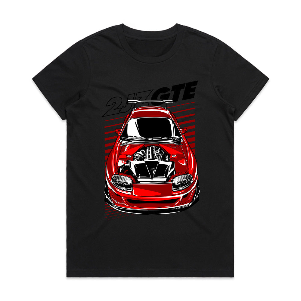 Rev up your JDM passion with this bold and aggressive Toyota Supra 2JZ-GTE T-shirt! Featuring a front-view illustration of a modified red Supra with an exposed 2JZ engine, this shirt is a must-have for car enthusiasts, tuners, and Supra lovers.