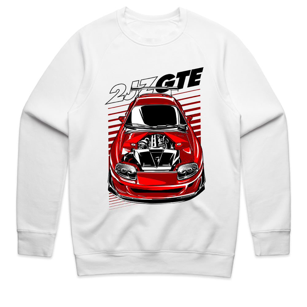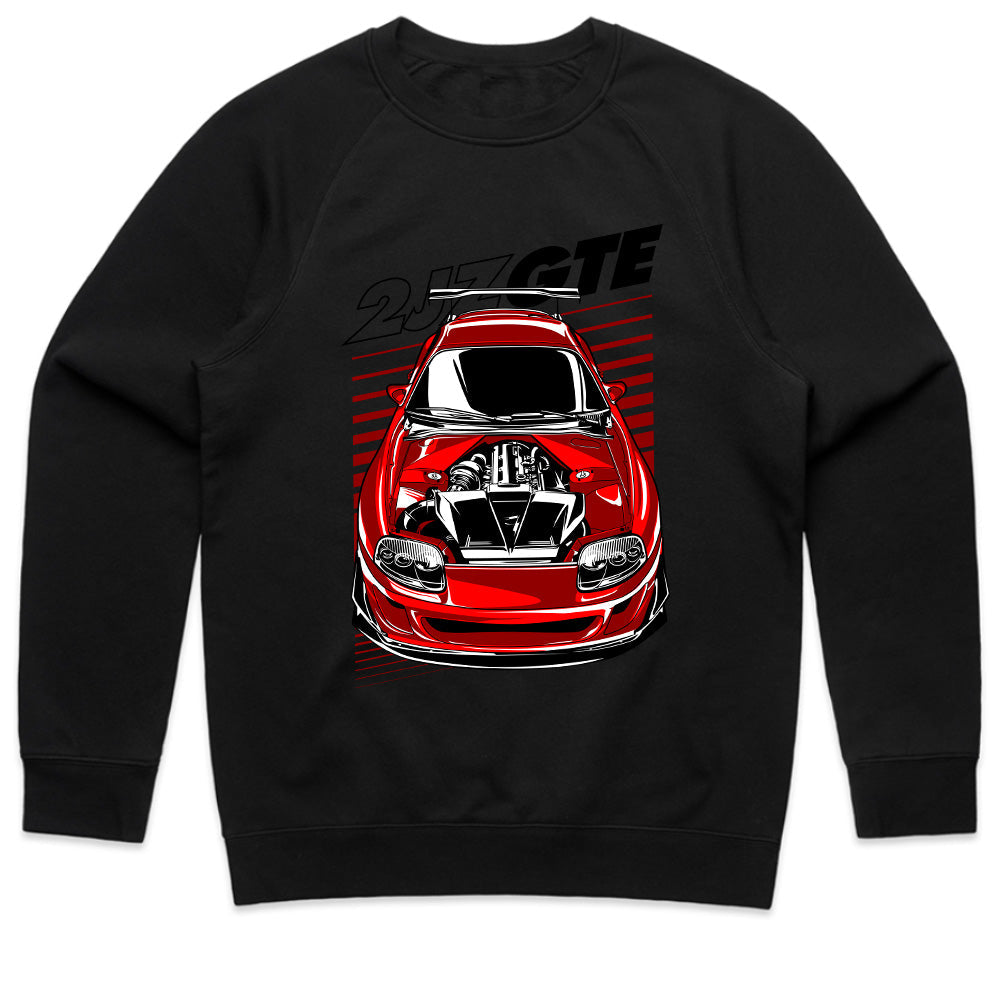 ✔ High-quality, detailed graphic of a legendary red Toyota Supra MK4 with an exposed 2JZ-GTE engine