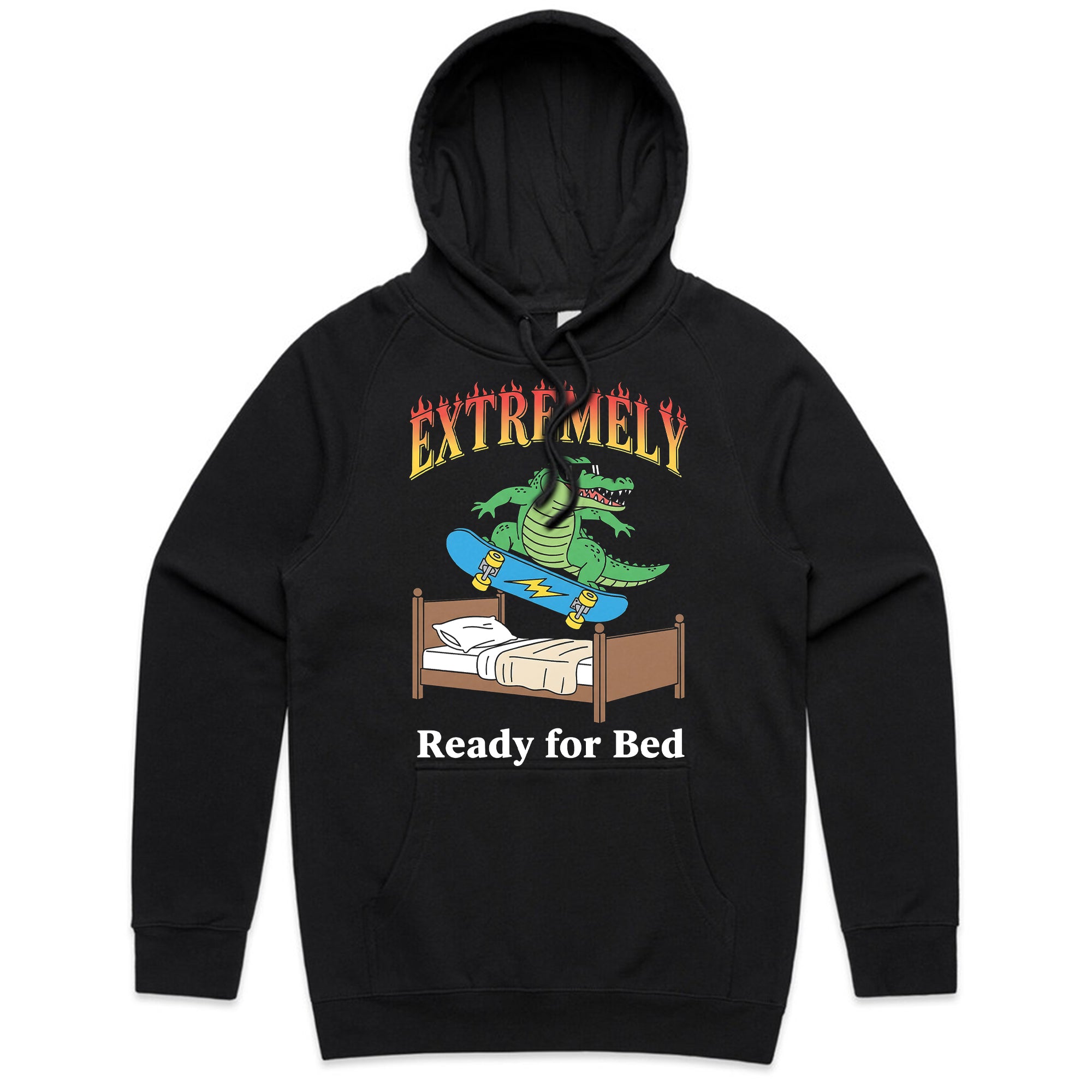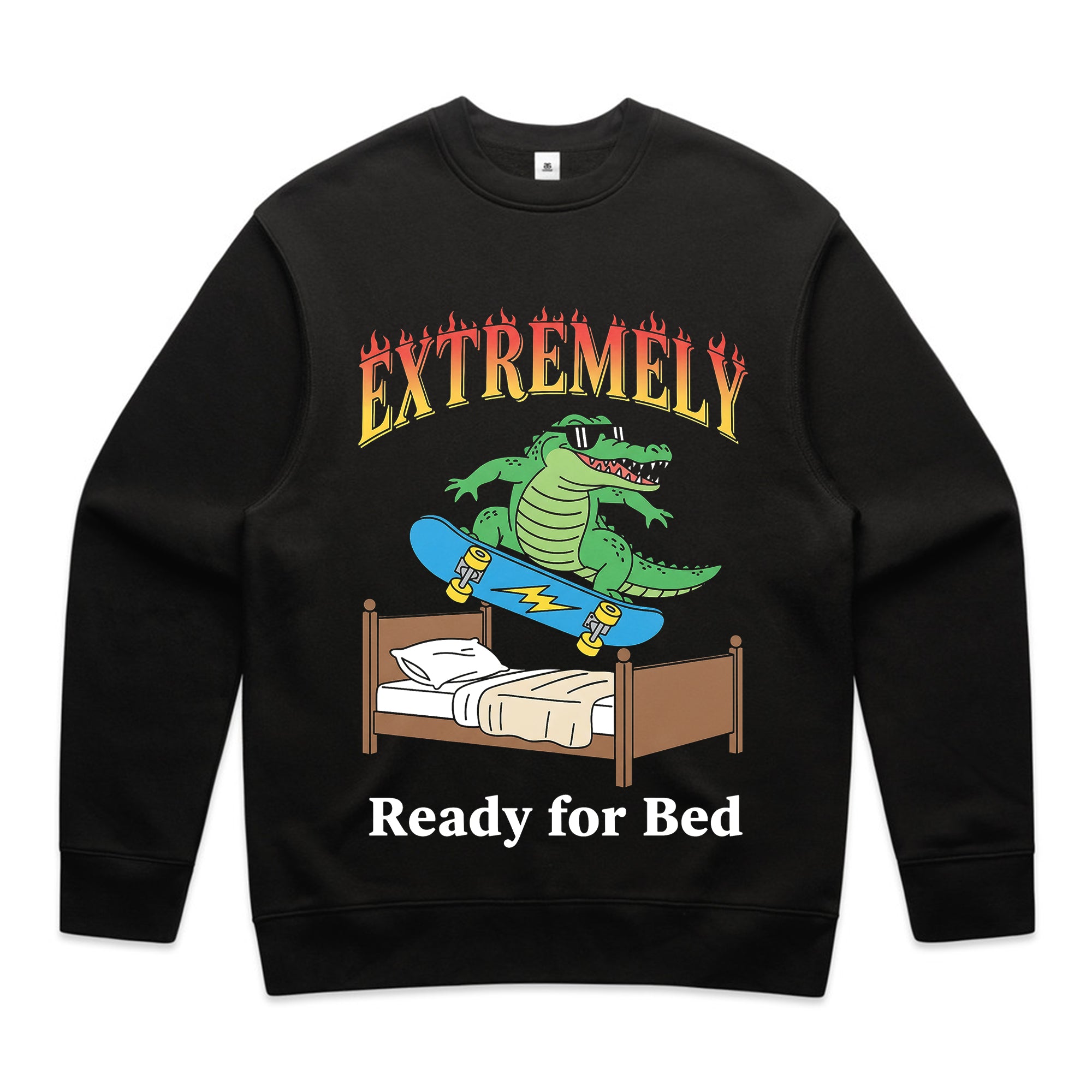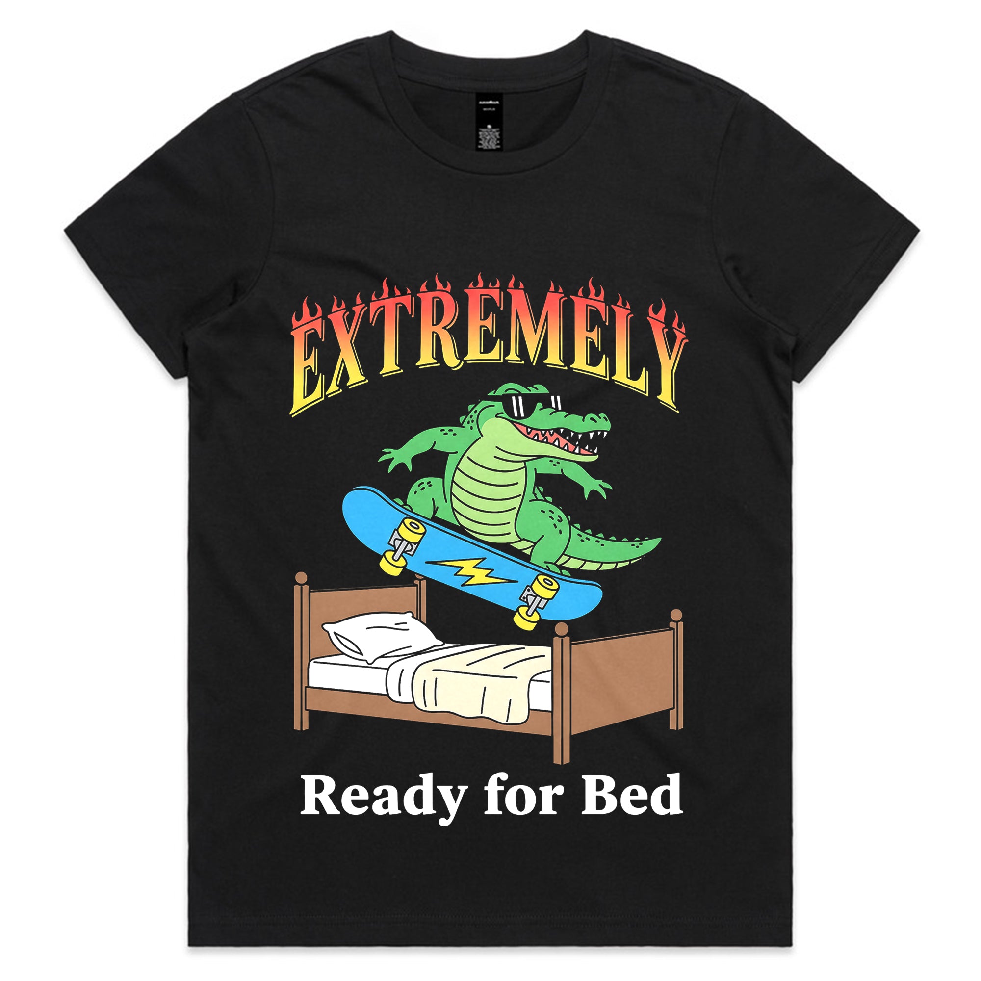 This playful shirt features a cartoon alligator wearing sunglasses and doing a skateboard trick over a bed. The text reads “Extremely Ready for Bed” with fiery red and yellow lettering. The design combines high energy and humor, making it ideal for those who love irony and fun bedtime vibes.