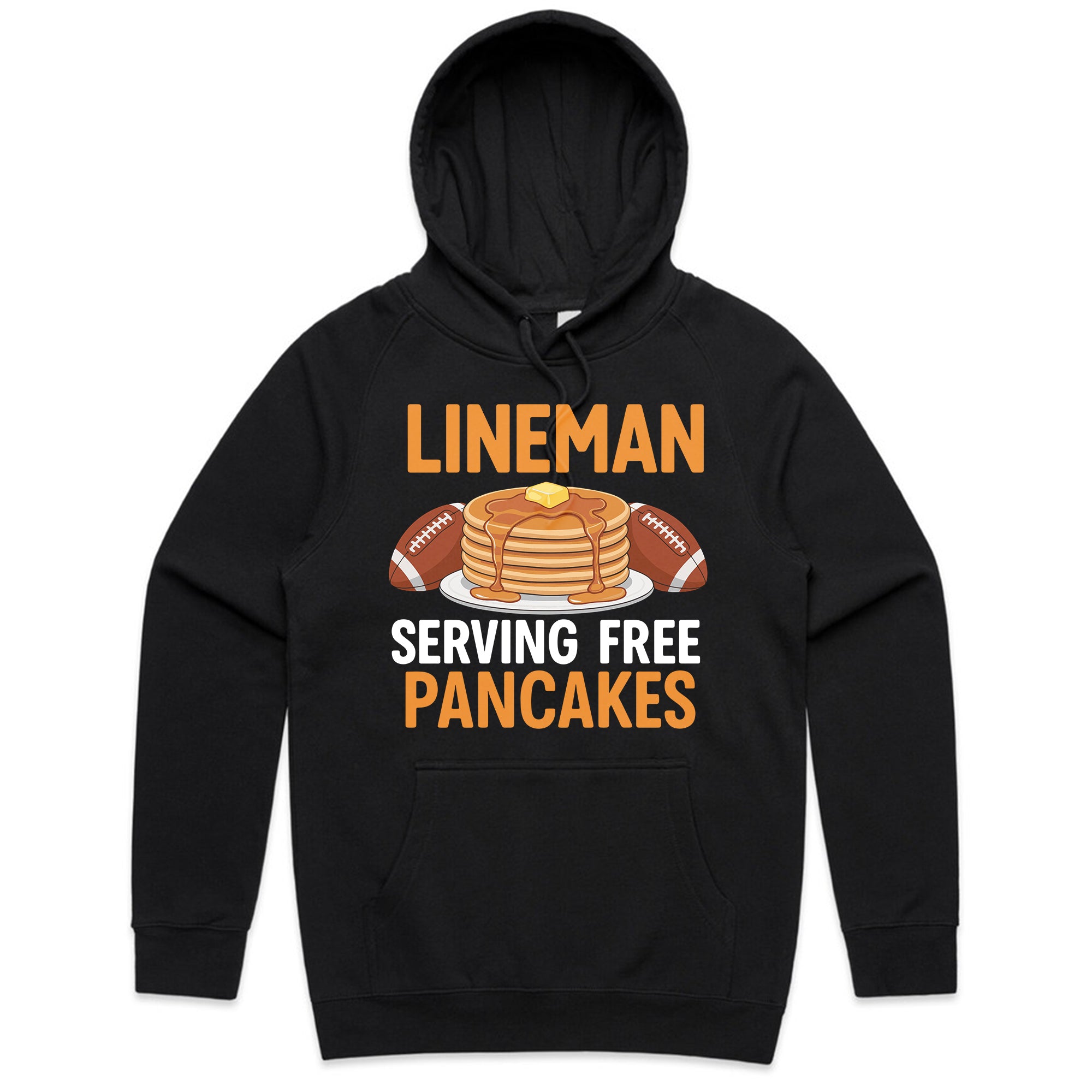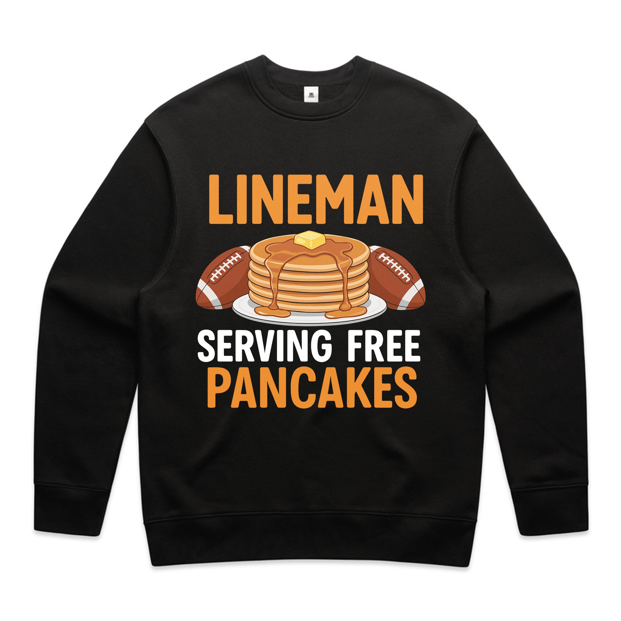 Show off your football pride and sense of humor with the Lineman Serving Free Pancakes Tee. Featuring a bold stack of pancakes, dripping syrup, and football graphics, this shirt is the perfect mix of gridiron grit and playful fun.