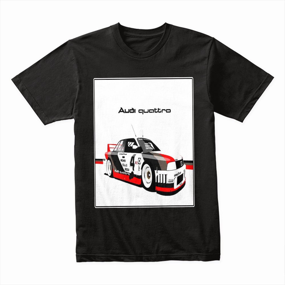 "Audi Quattro" text in a retro-modern font for authentic vintage feel.