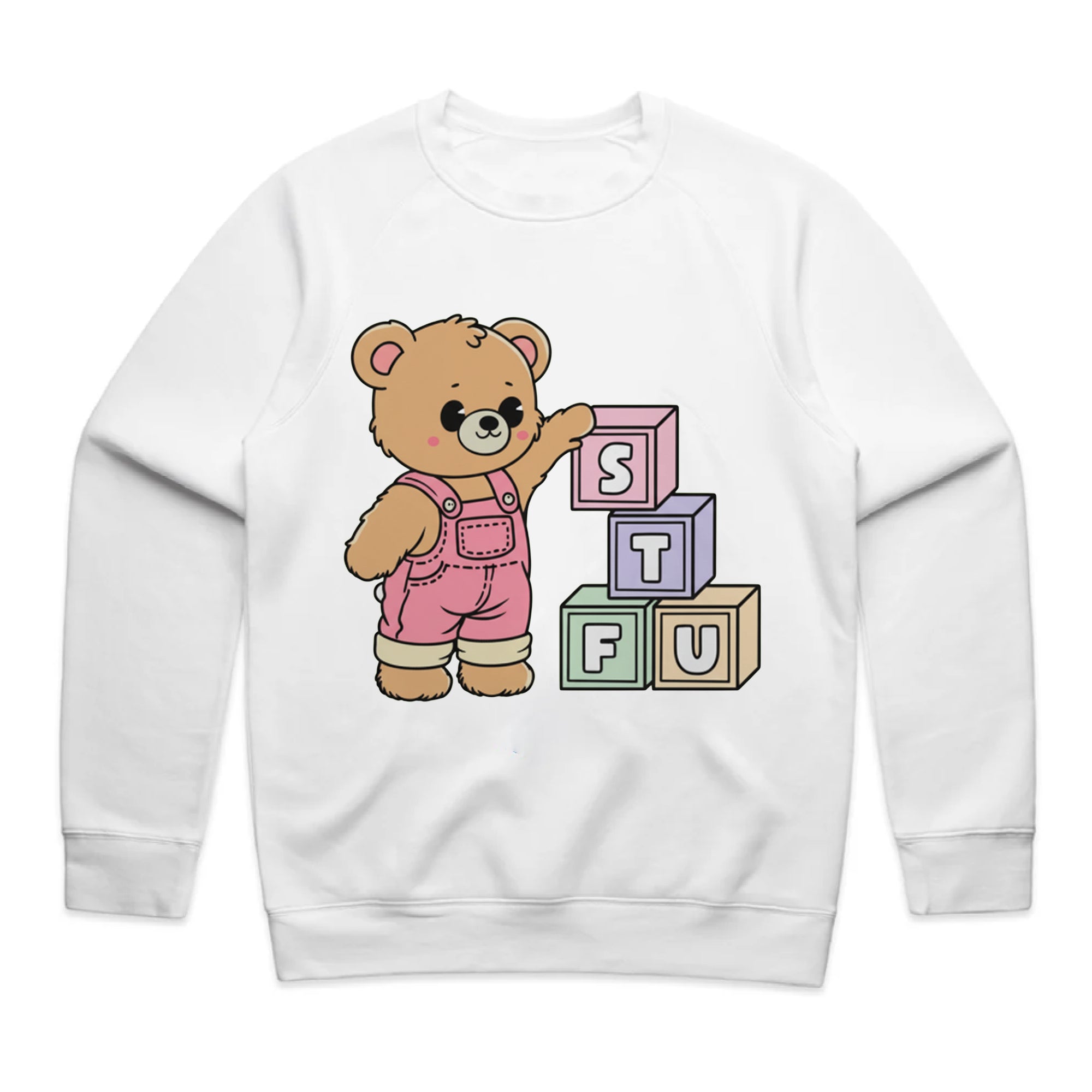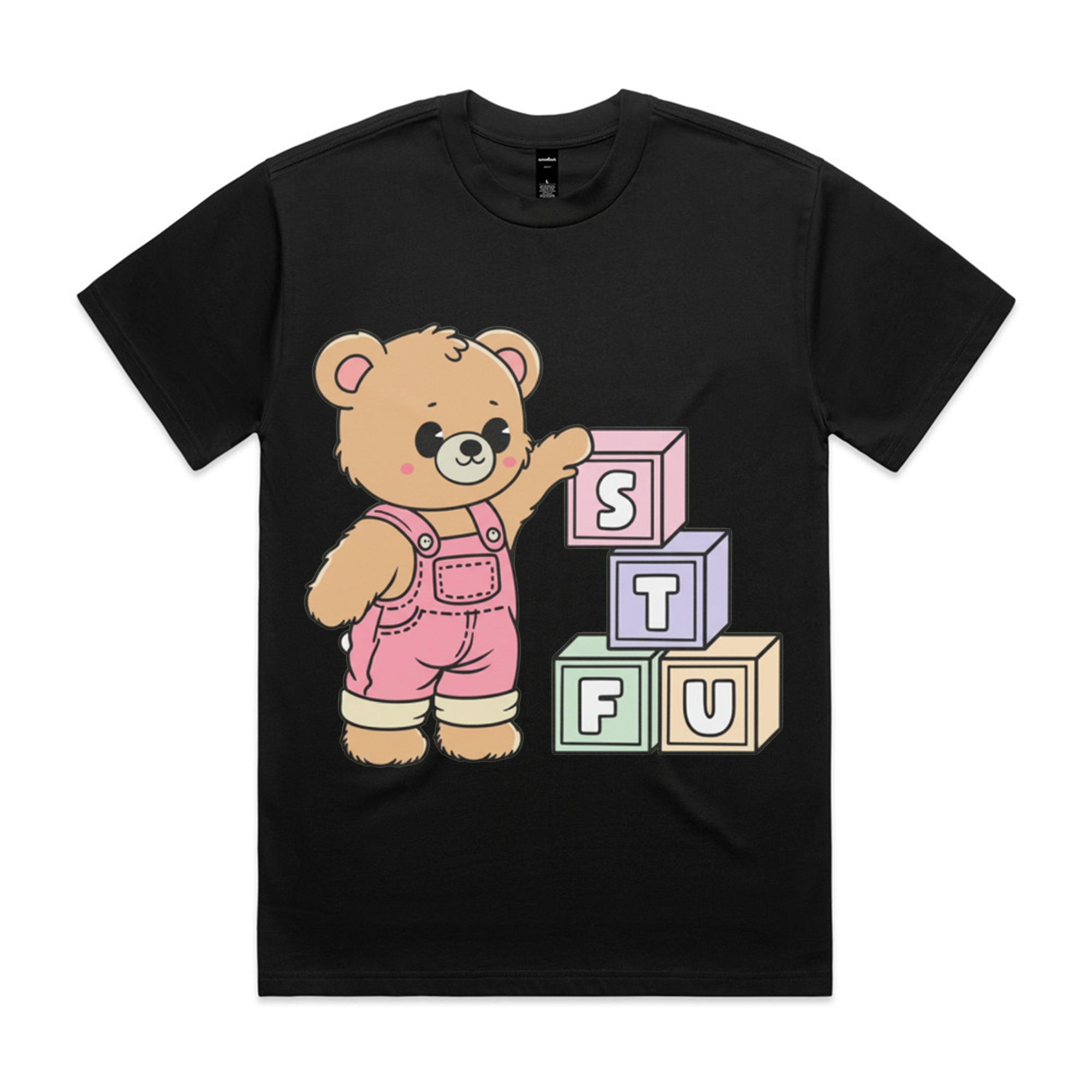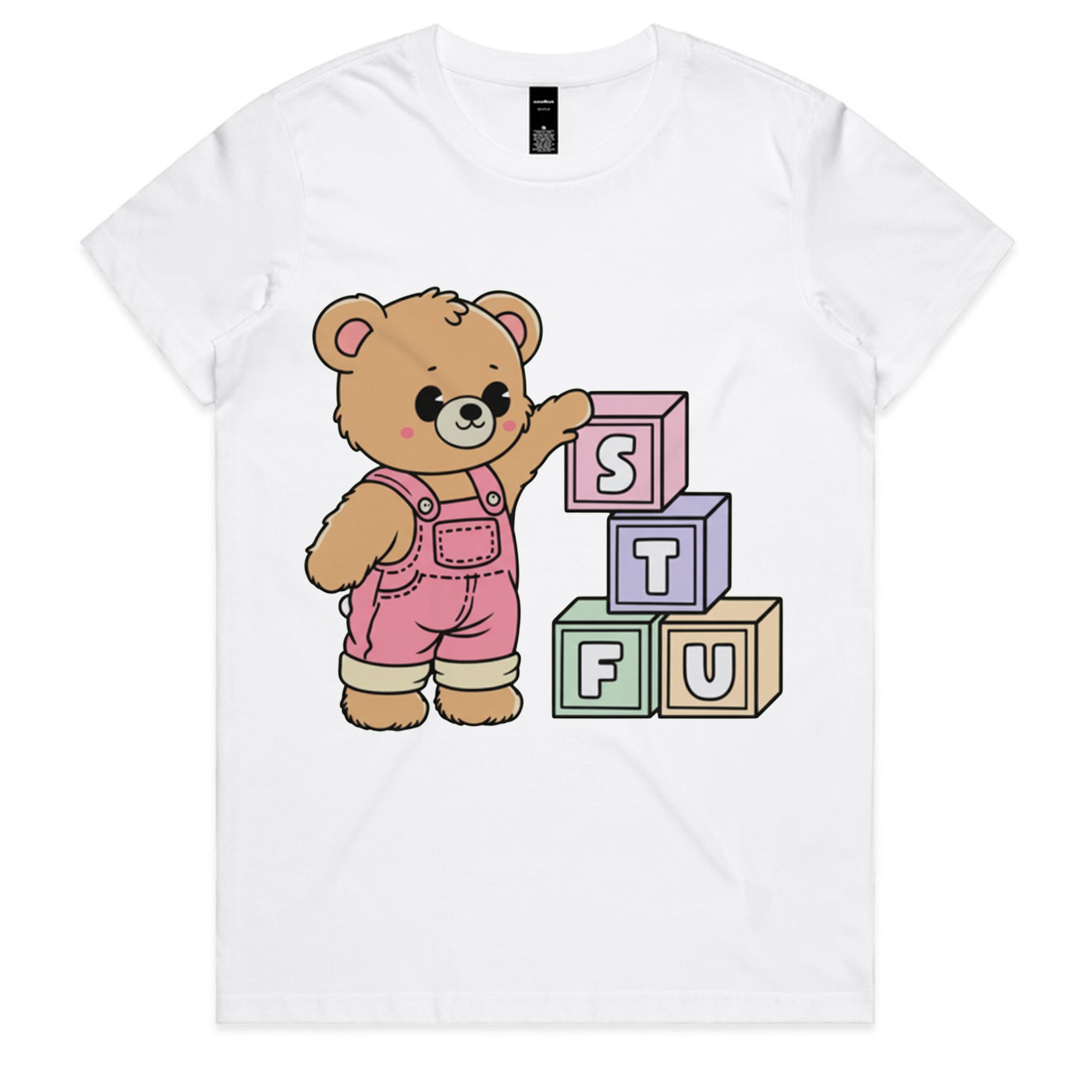 A cute, cartoon-style brown teddy bear wearing pink overalls stands next to a stack of colorful toy blocks. The blocks are arranged to spell out the acronym "STFU" in pastel colors.