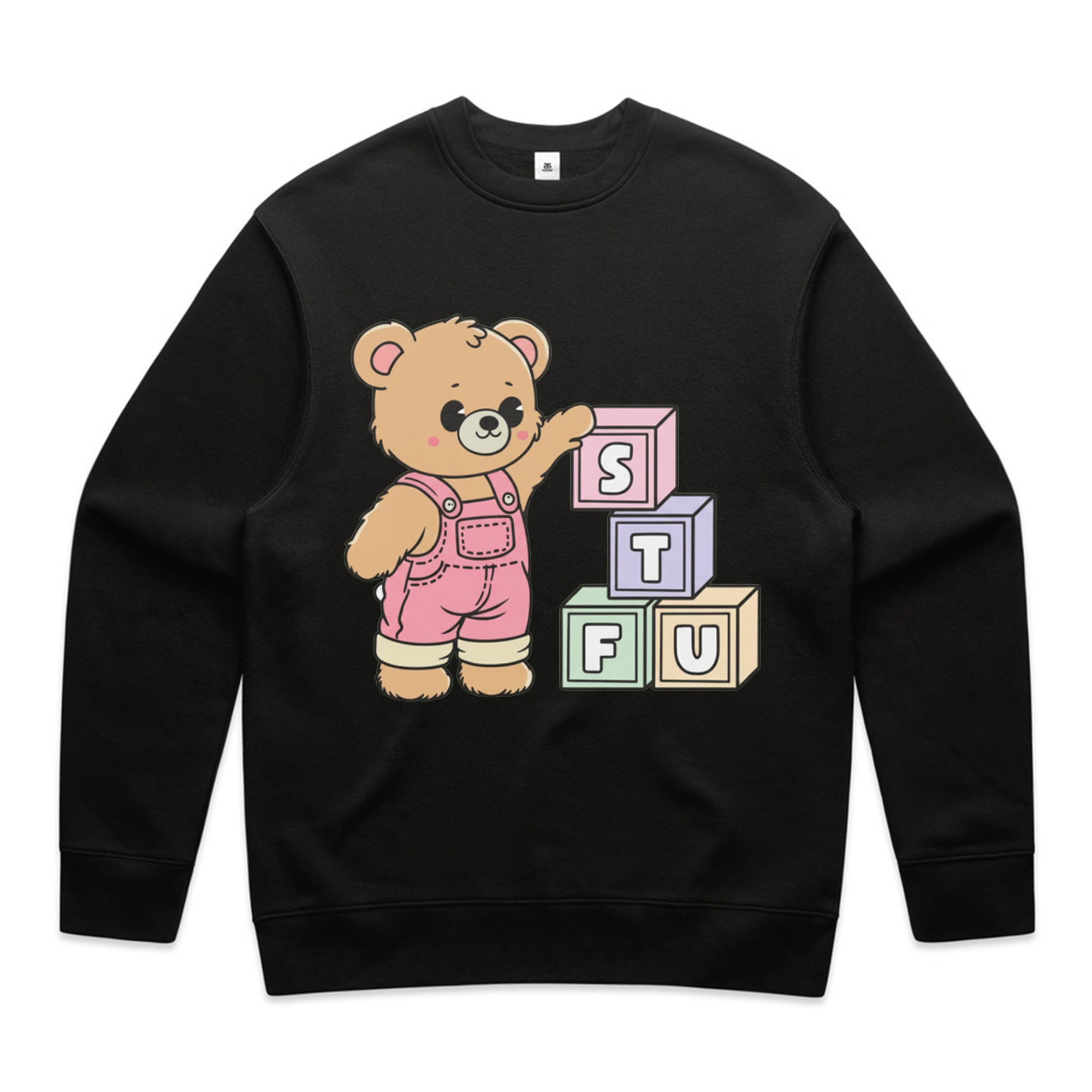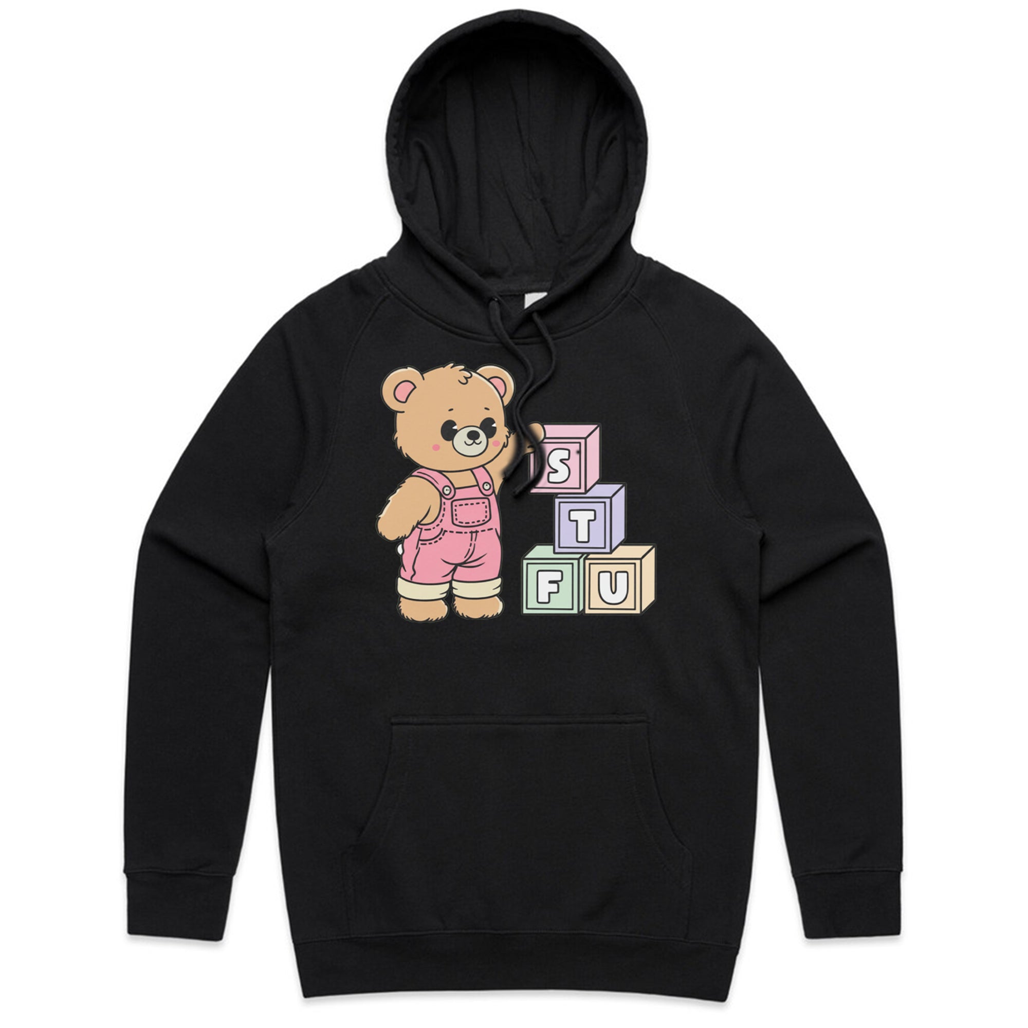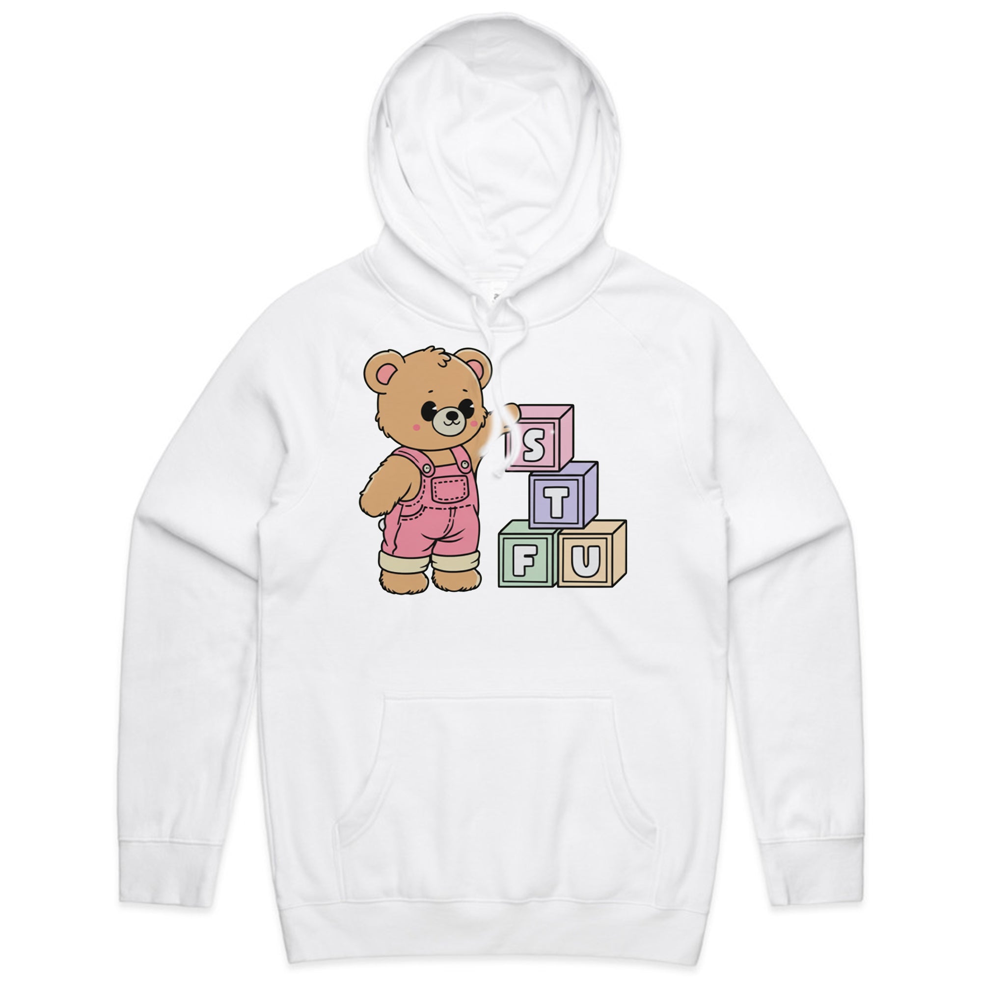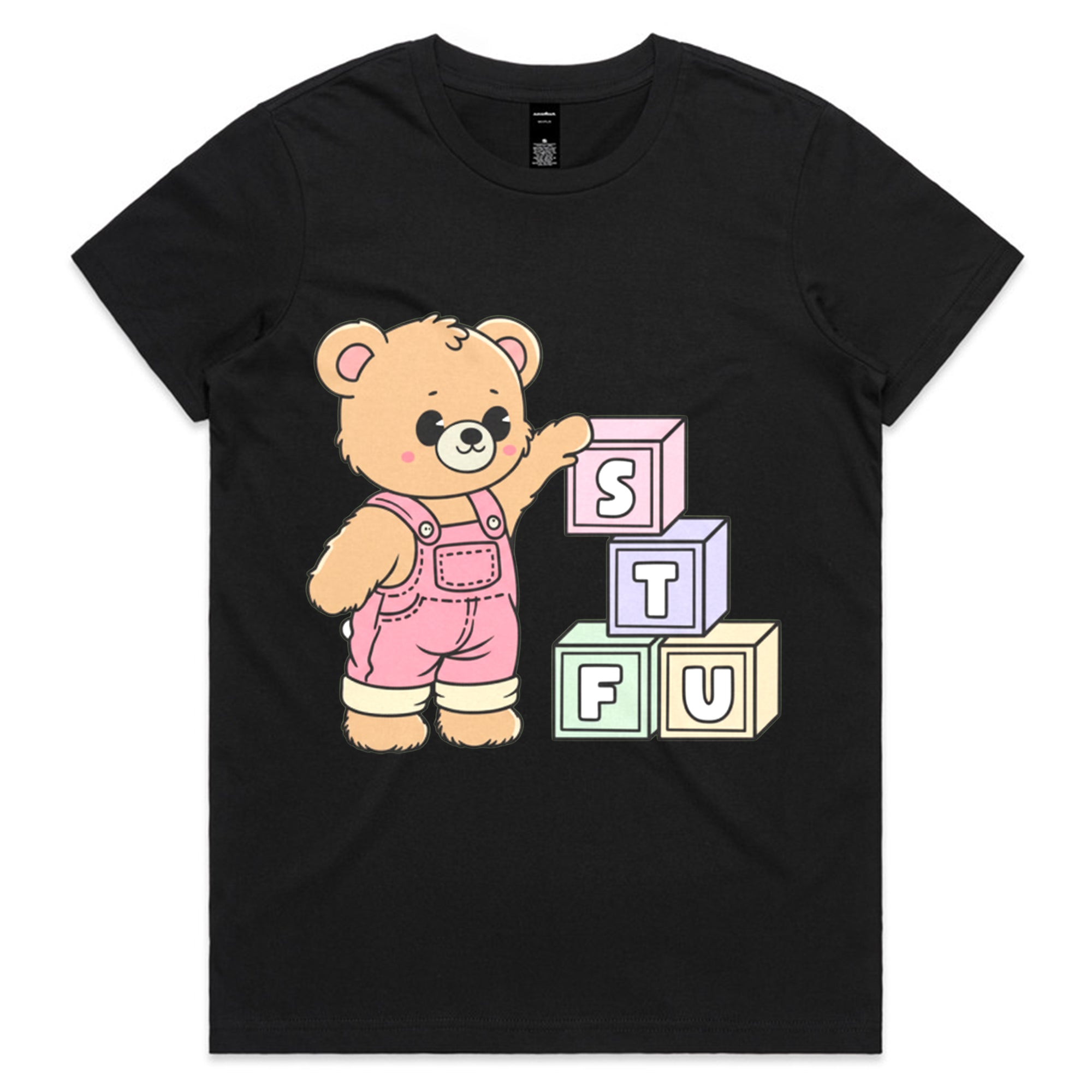 A cute, cartoon-style brown teddy bear wearing pink overalls stands next to a stack of colorful toy blocks. The blocks are arranged to spell out the acronym "STFU" in pastel colors.