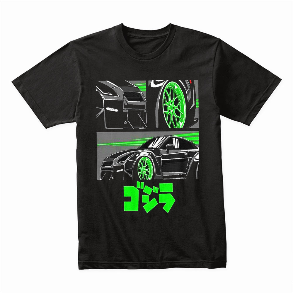 Unleash the beast with the Godzilla GT-R Neon Drift Tee, inspired by Japan's legendary street racing icon. The bold green highlights and dynamic sketch lines capture the raw energy and aggressive stance of the GT-R.