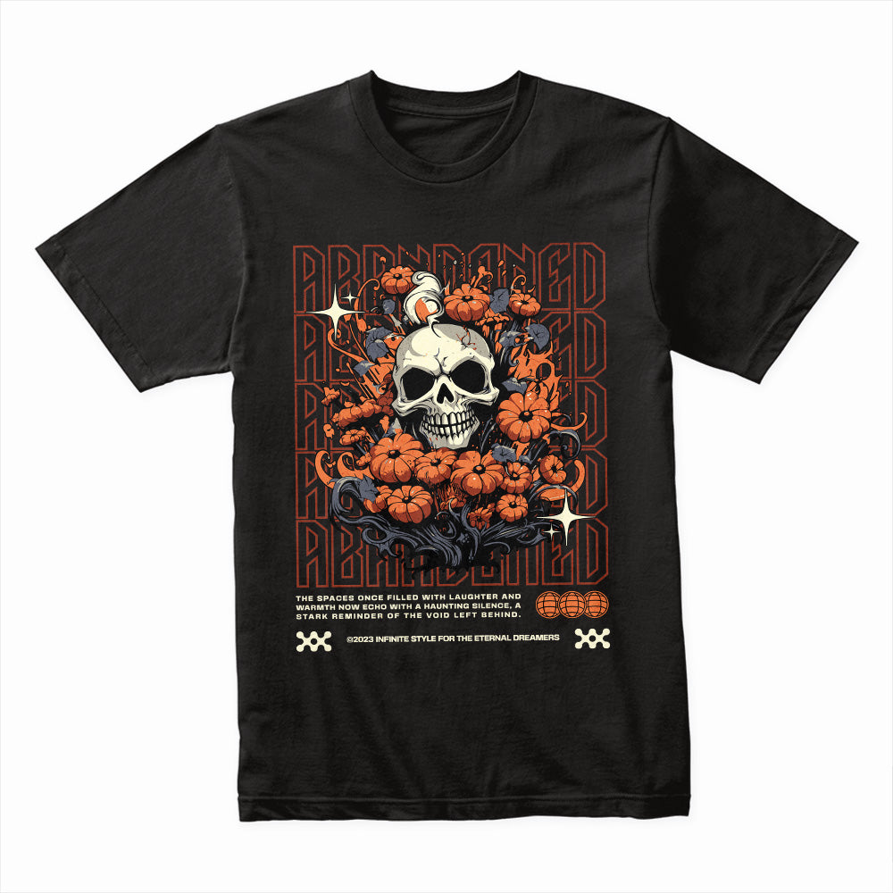 Step into a hauntingly beautiful world with the "Abandoned: Harvest of Shadows" T-shirt — where forgotten places bloom with eerie elegance.