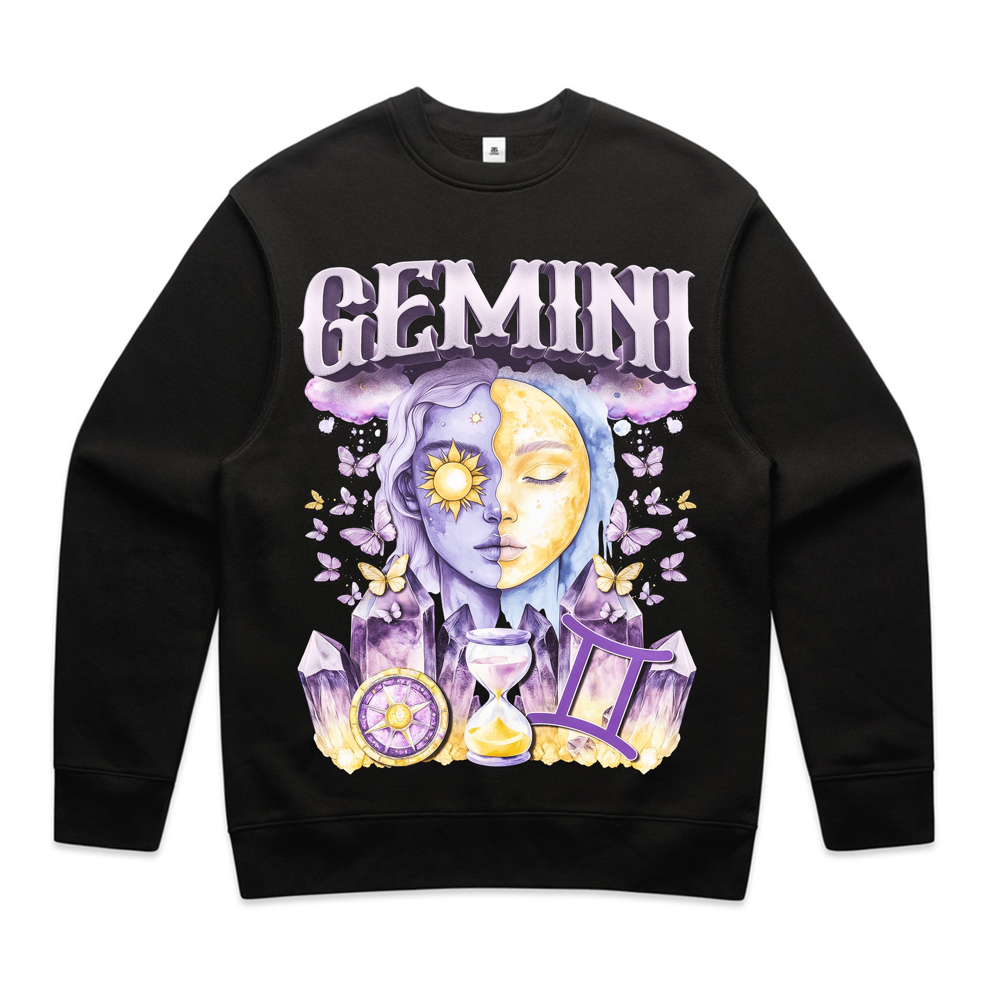 Celebrate the dual spirit of Gemini with this enchanting design. Featuring a mystical face split into sun and moon, surrounded by butterflies, crystals, and cosmic details, this tee embodies the versatility, creativity, and charm that define the Gemini soul.