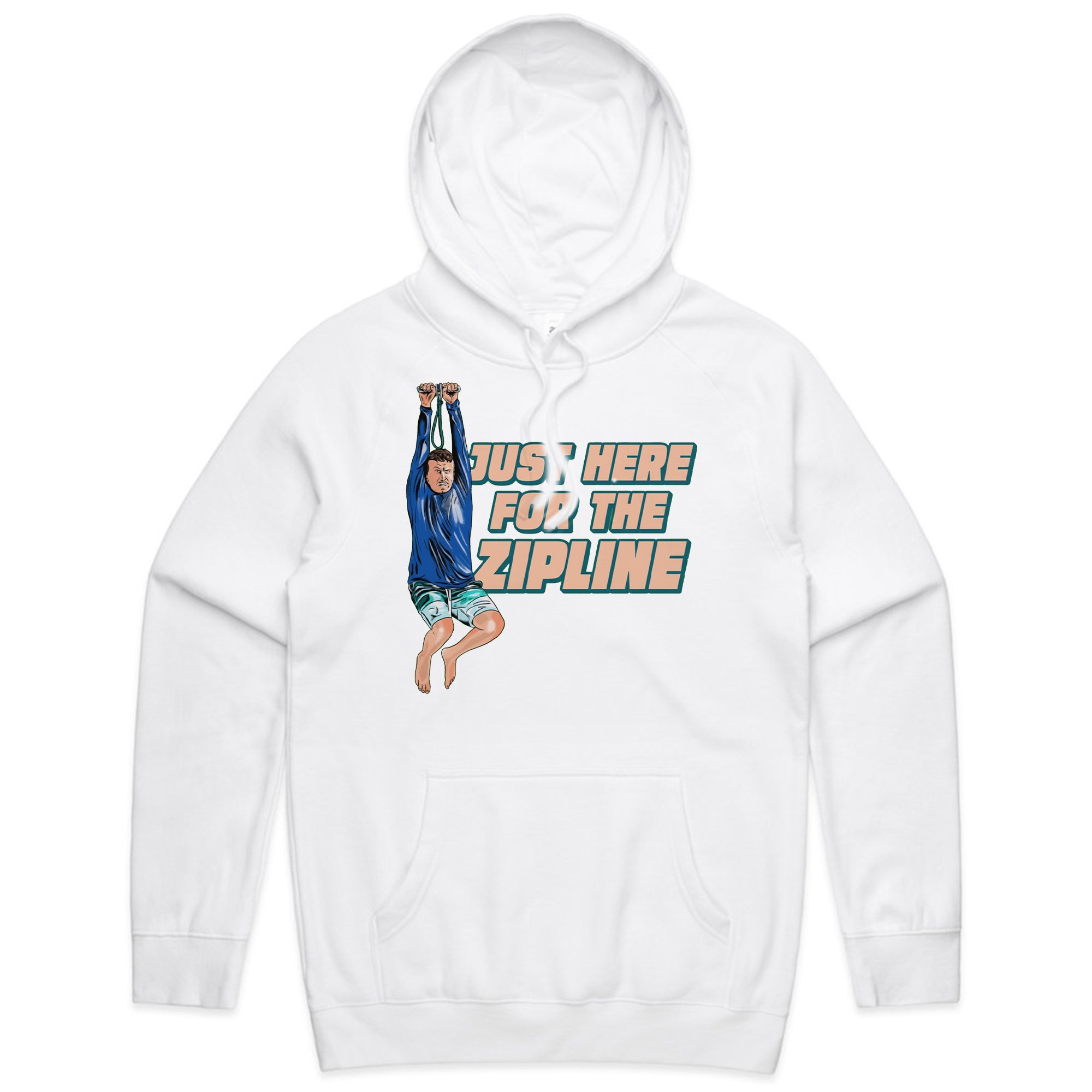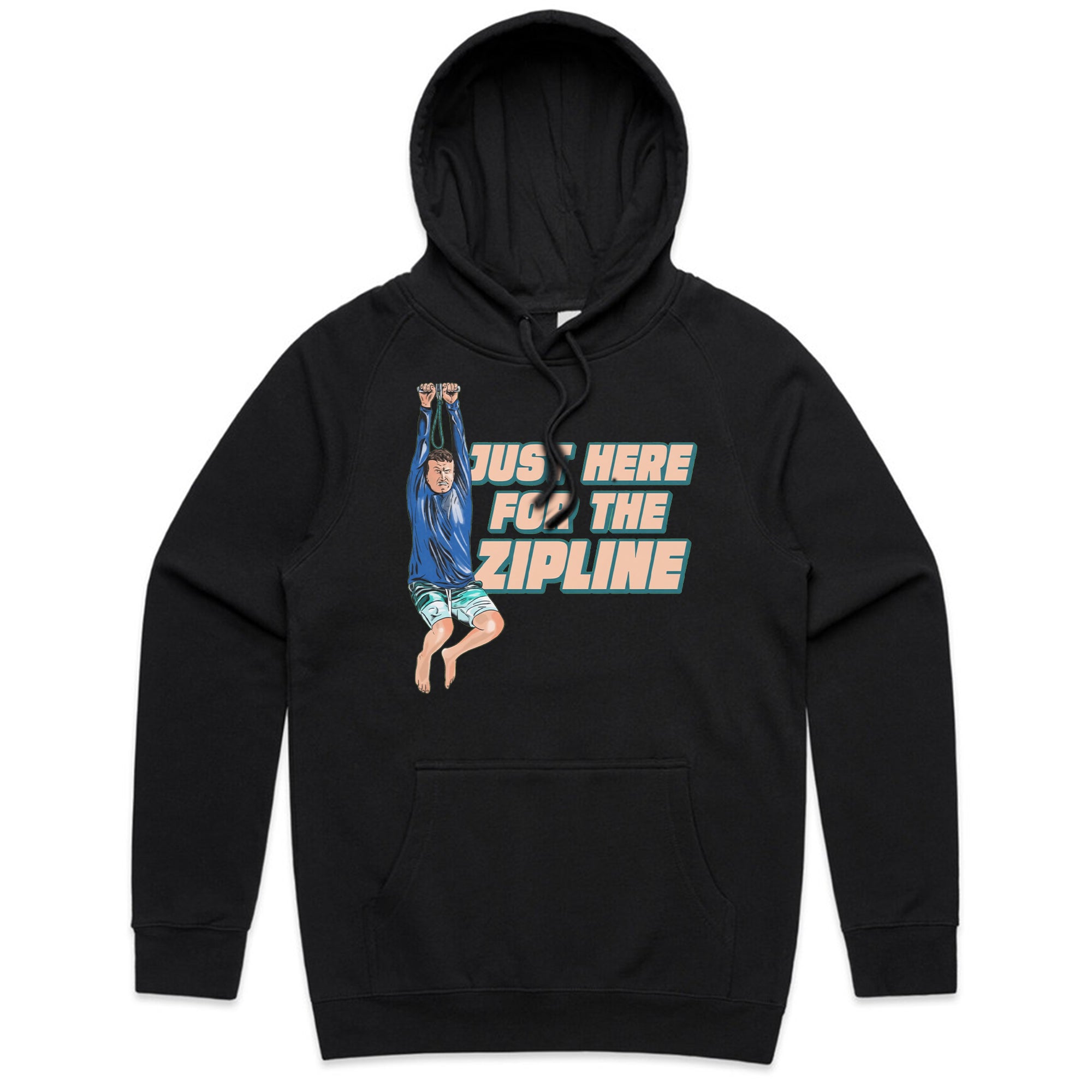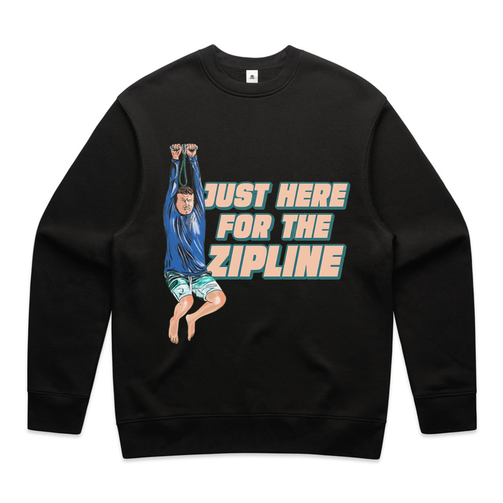 A black sweatshirt featuring a caricature of a man (Tim Robinson) hanging from a zipline, wearing a blue long-sleeve shirt and patterned shorts.