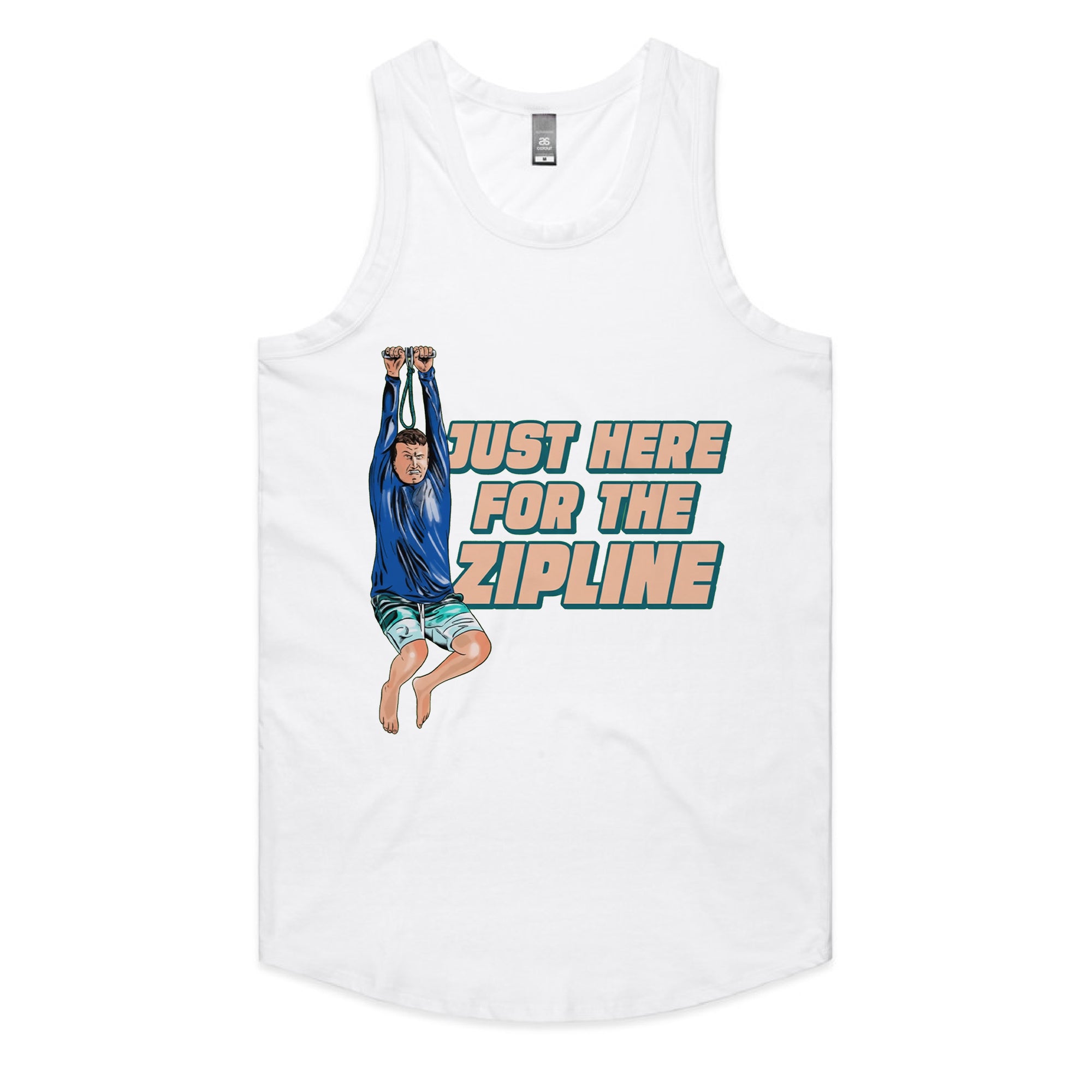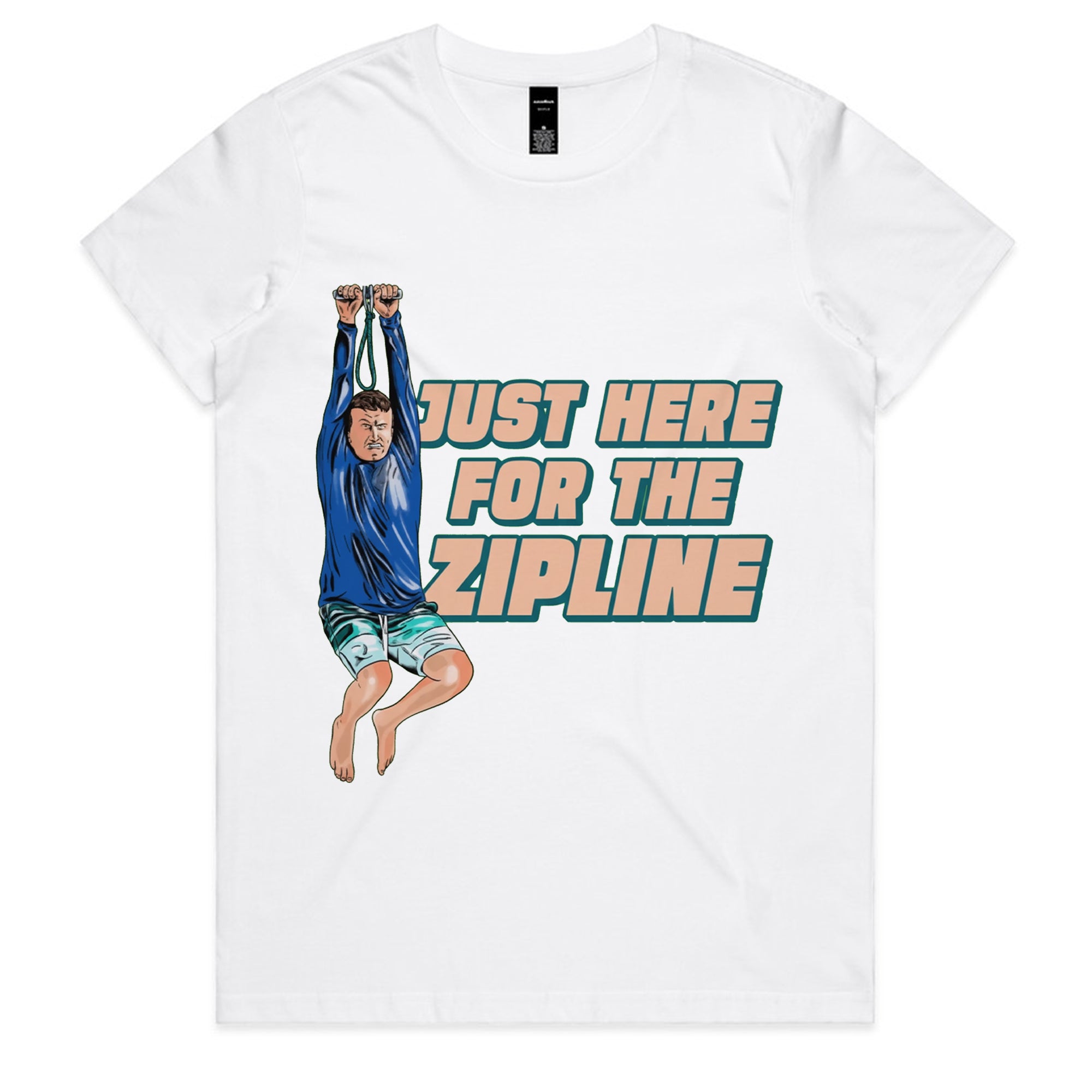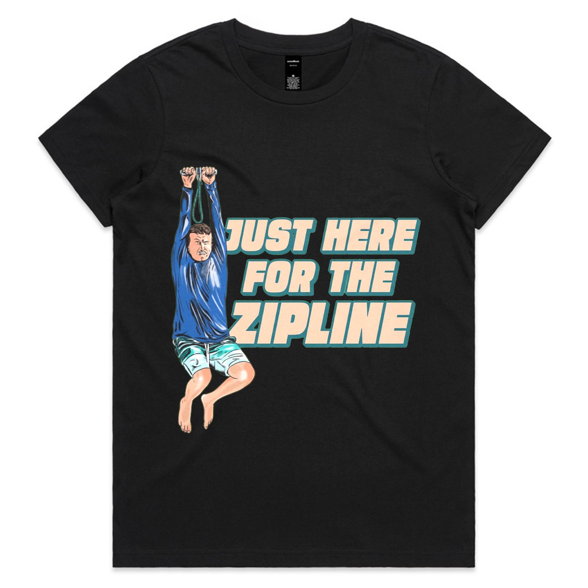 A black sweatshirt featuring a caricature of a man (Tim Robinson) hanging from a zipline, wearing a blue long-sleeve shirt and patterned shorts.