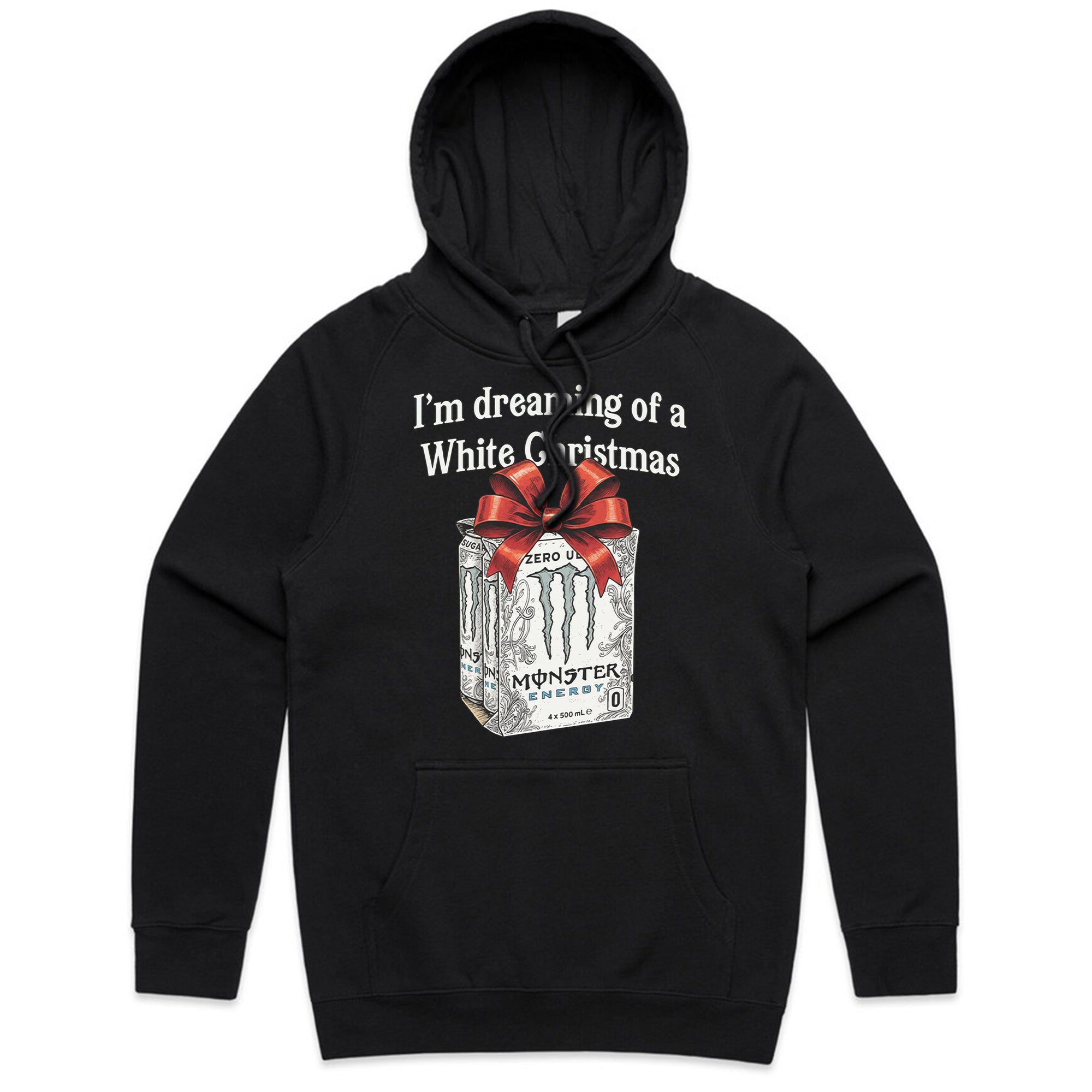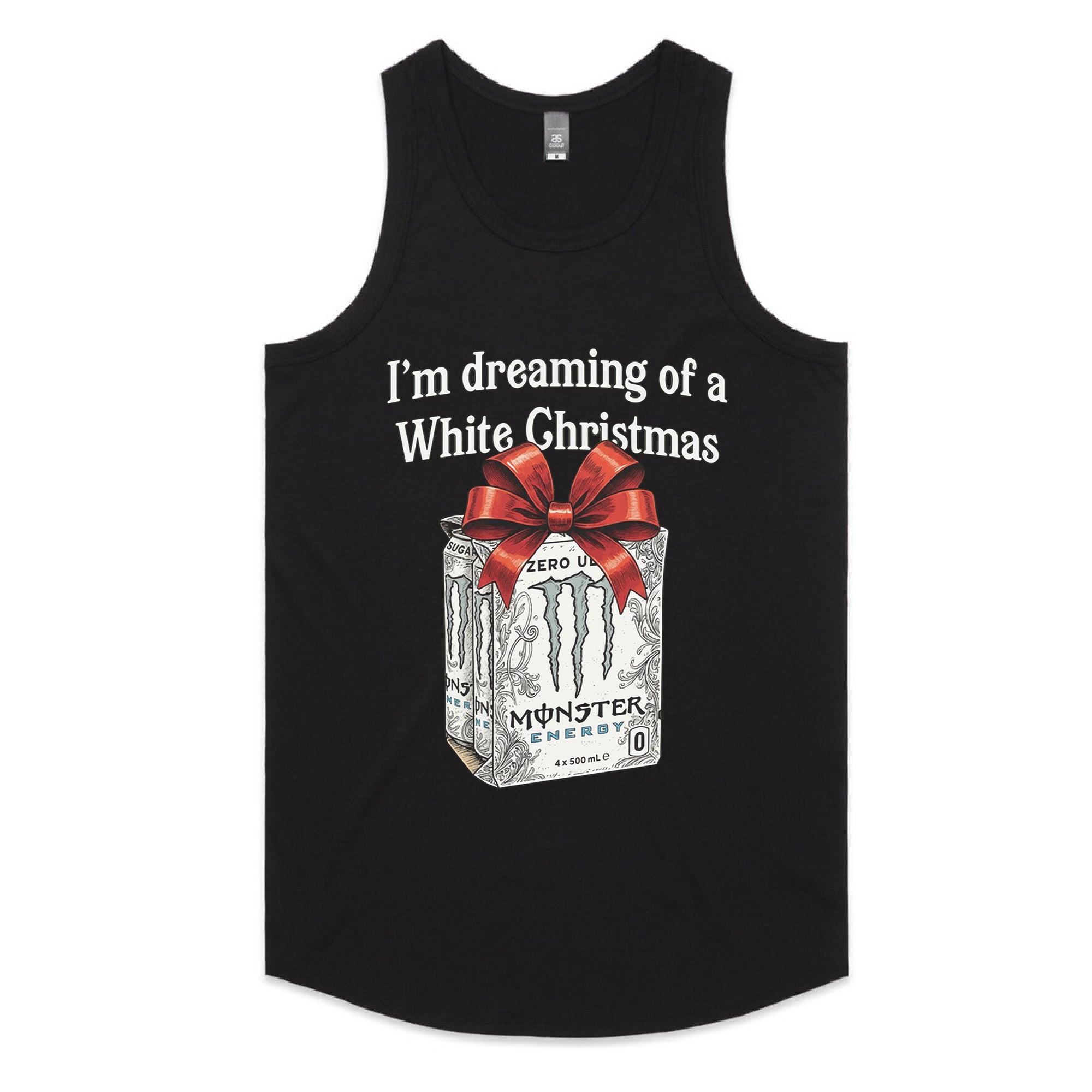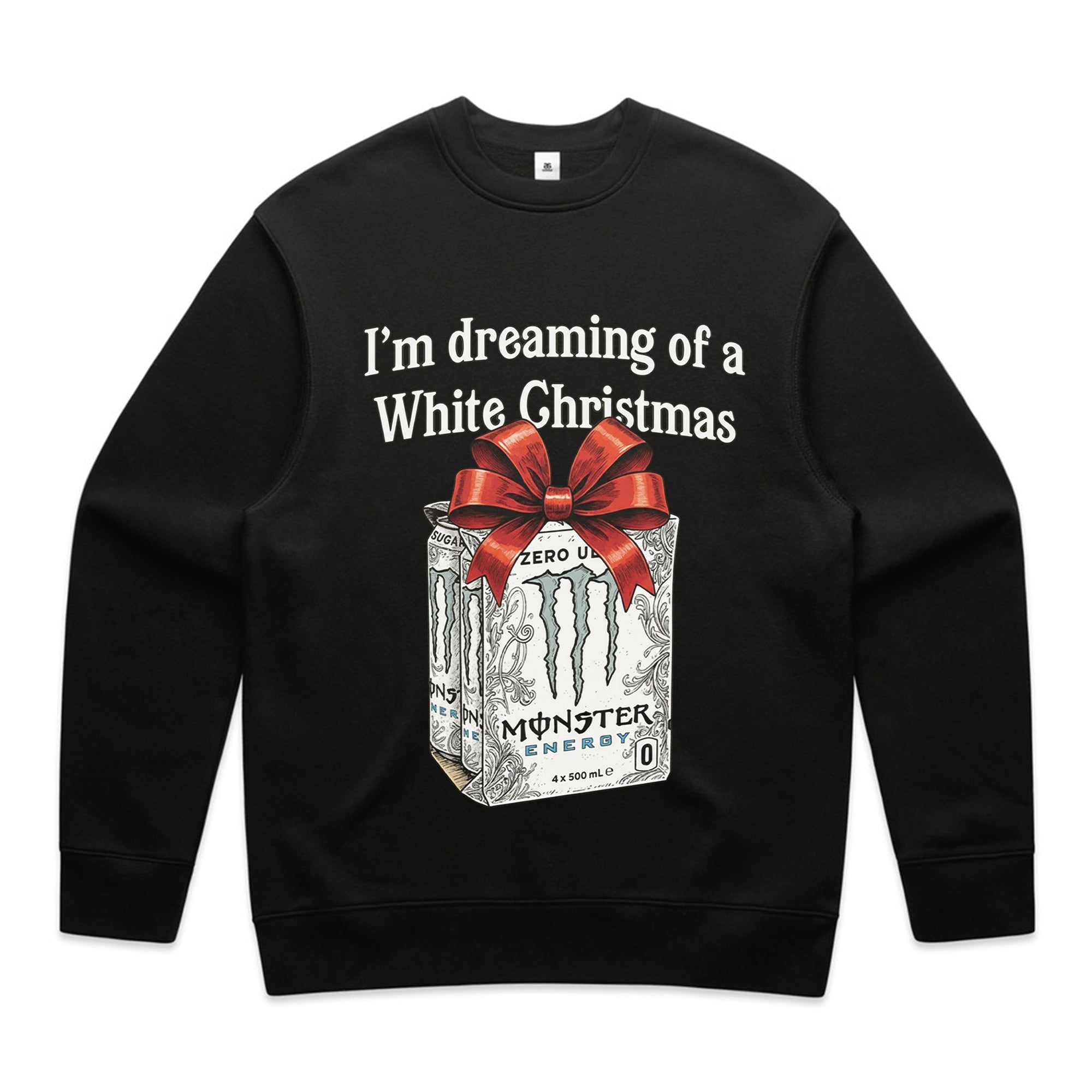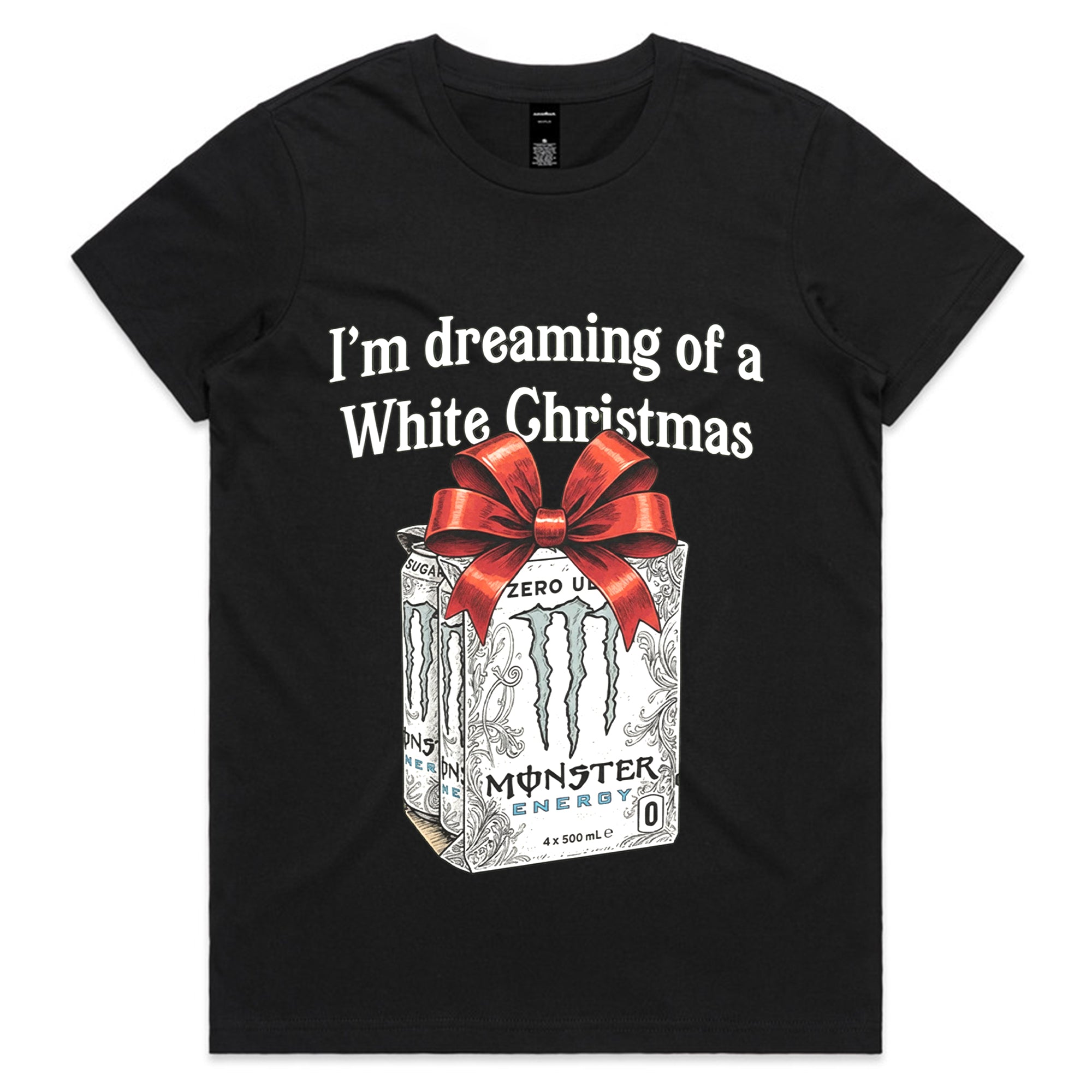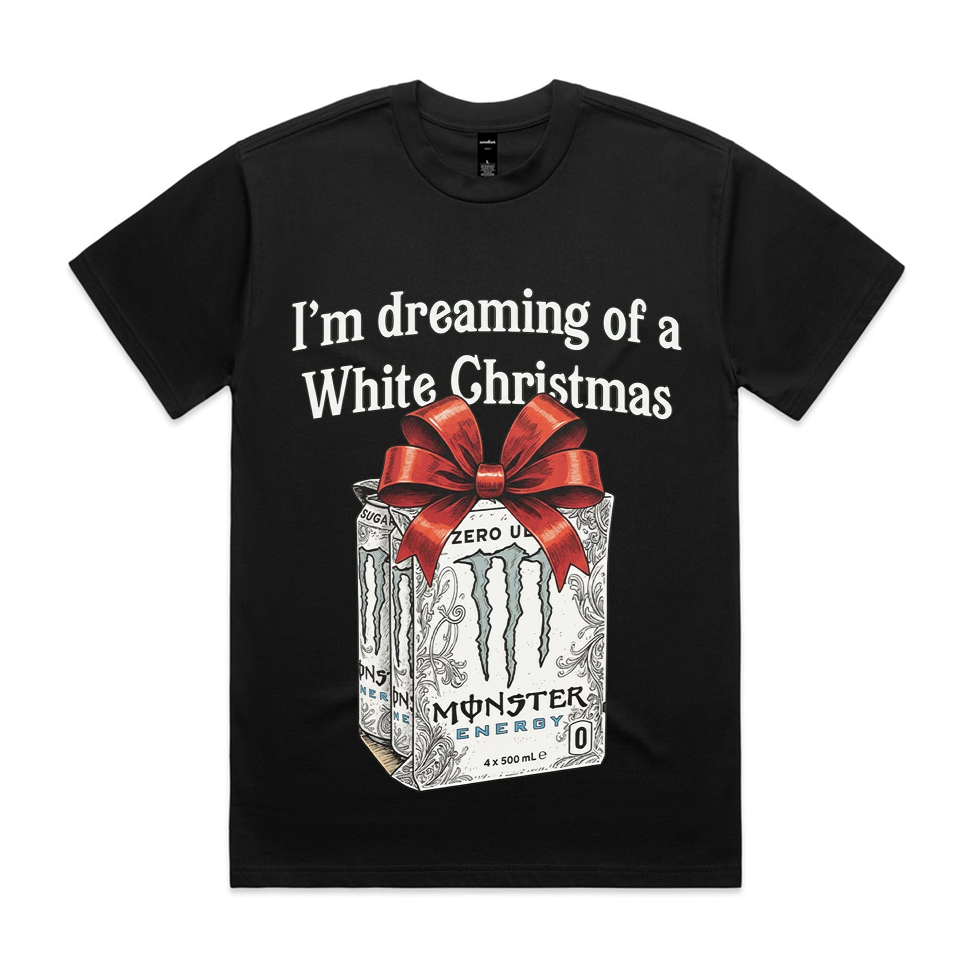 This design features the text "I'm dreaming of a White Christmas" in a classic serif font. Below the text is a detailed illustration of a 4-pack of Monster Energy Zero Ultra (white cans) wrapped in a large, vibrant red festive bow.