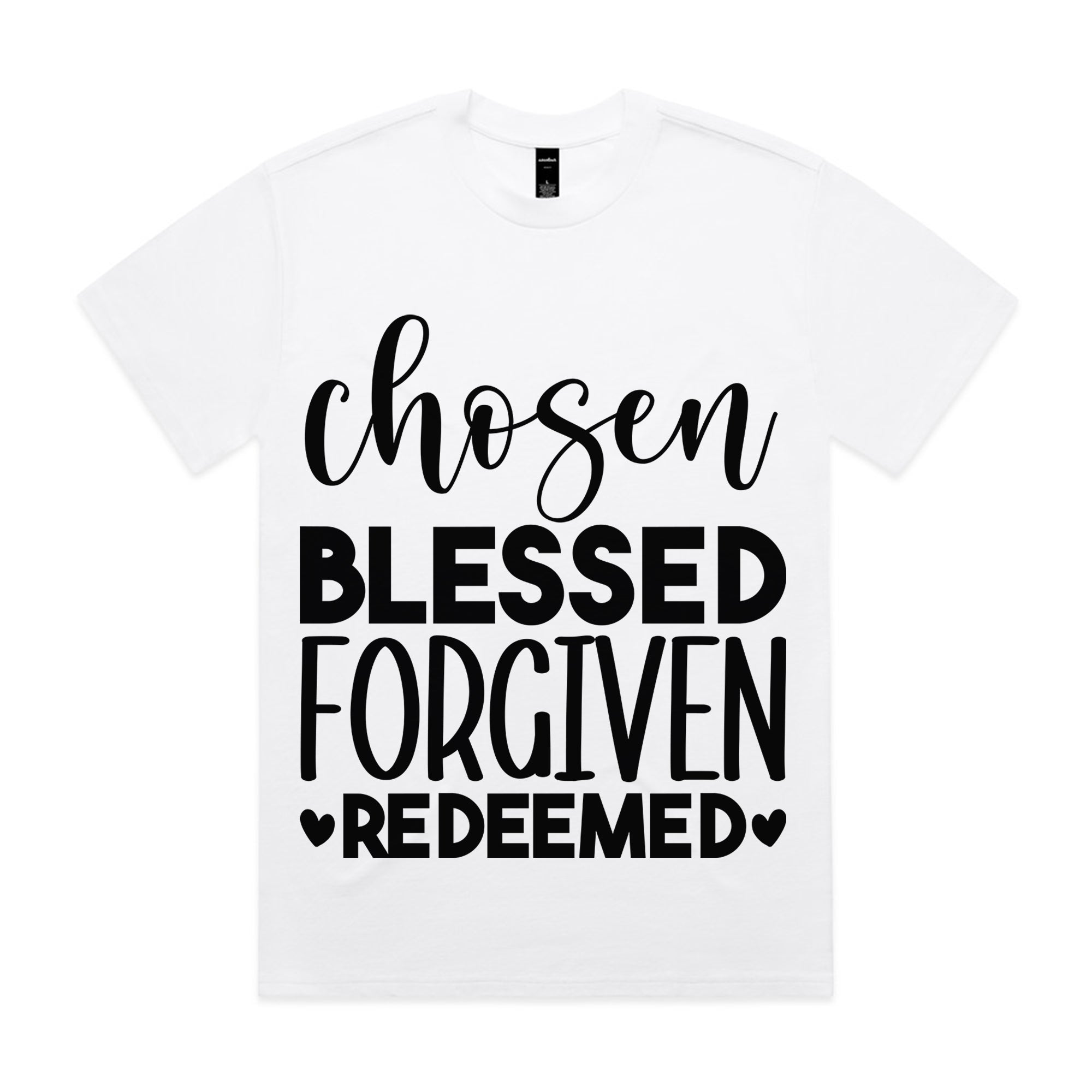 Carry a powerful reminder of your faith wherever you go with this inspiring “Chosen, Blessed, Forgiven, Redeemed” T-shirt. Designed in bold, uplifting typography, it reflects the true essence of grace, hope, and redemption.