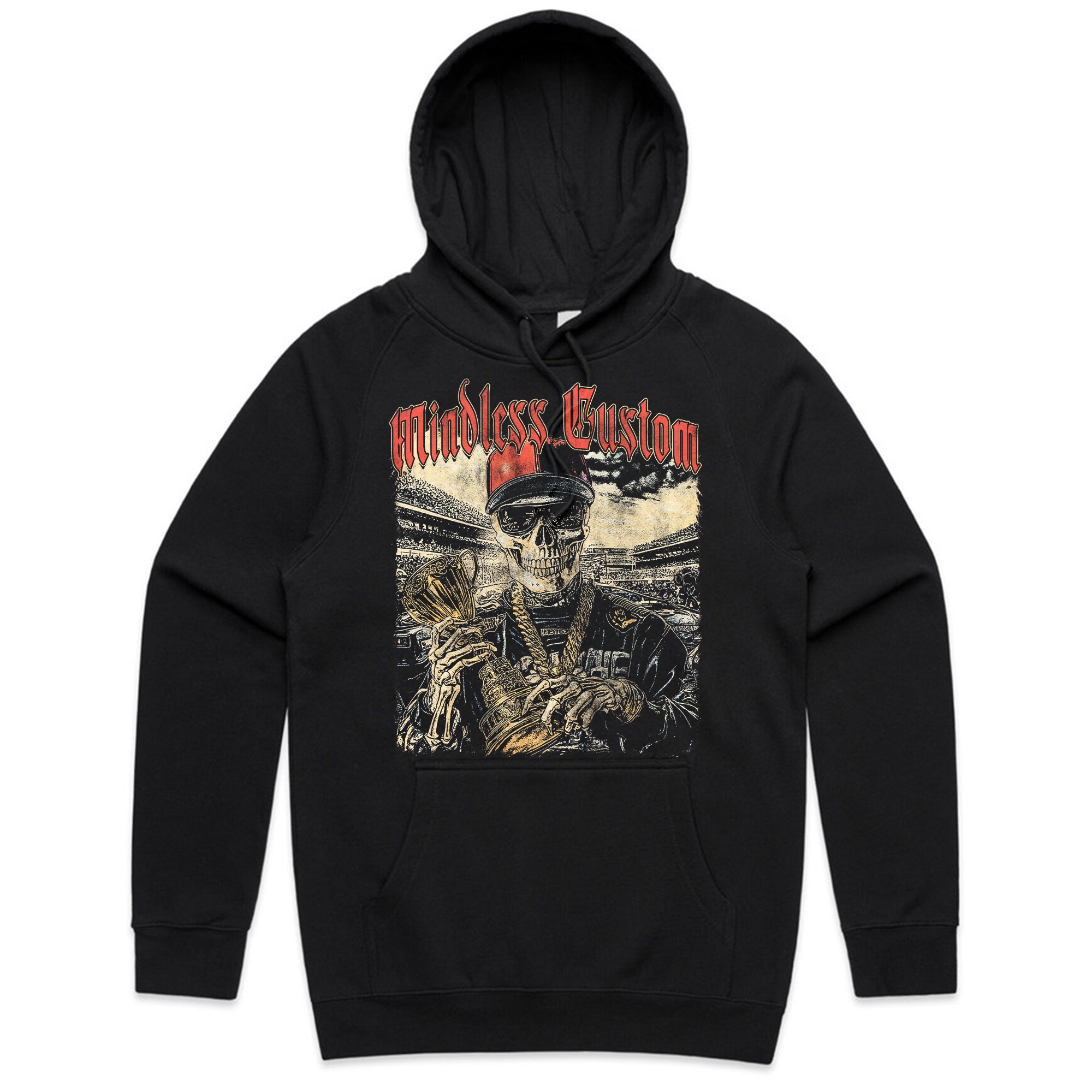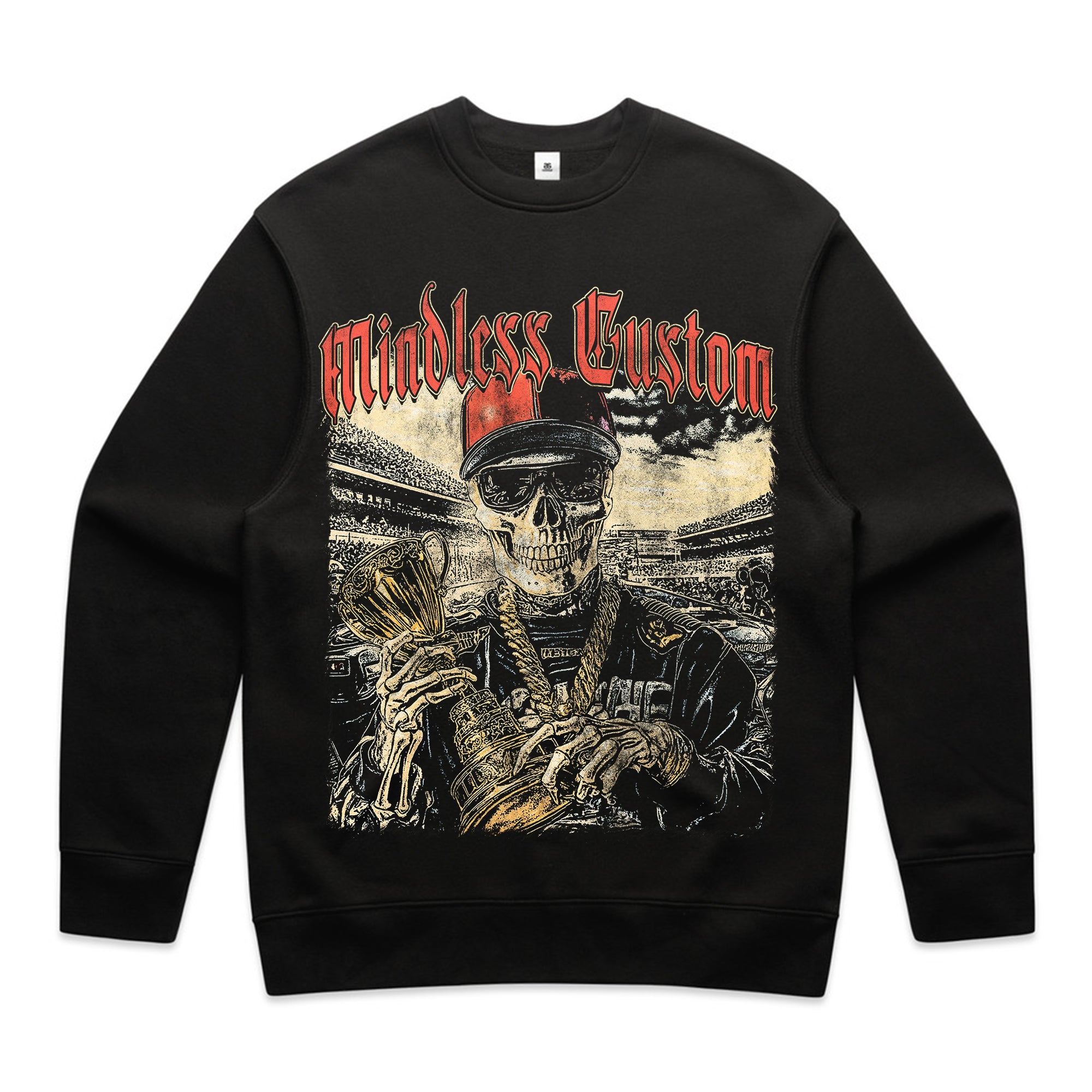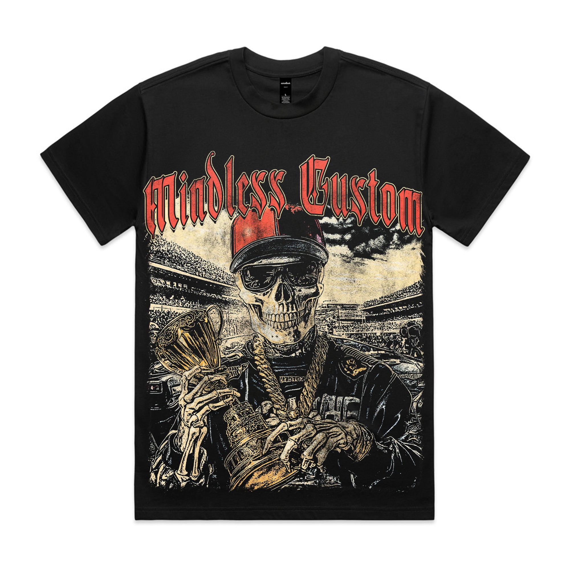 🏆💀 Rule the arena with this bold tee. A skeleton in shades and a cap clutches a massive trophy, dripping with swagger and victory energy. Gothic red “Mindless Custom” lettering crowns the artwork, making it a statement of power, success, and rebellion.