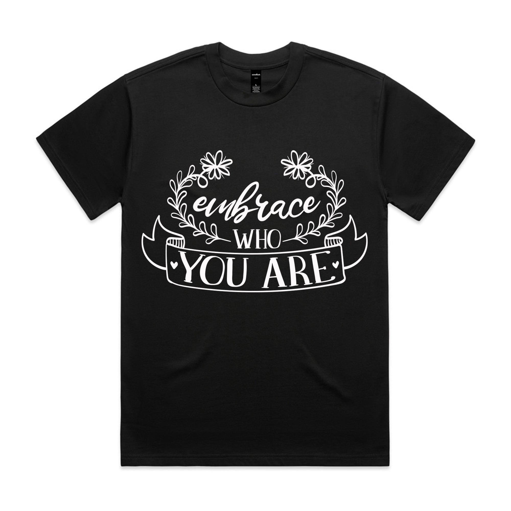 Stand tall and celebrate your true self with this “Embrace Who You Are” T-shirt. The elegant floral wreath and banner design pop beautifully against the bold black fabric, creating a striking yet meaningful statement piece.