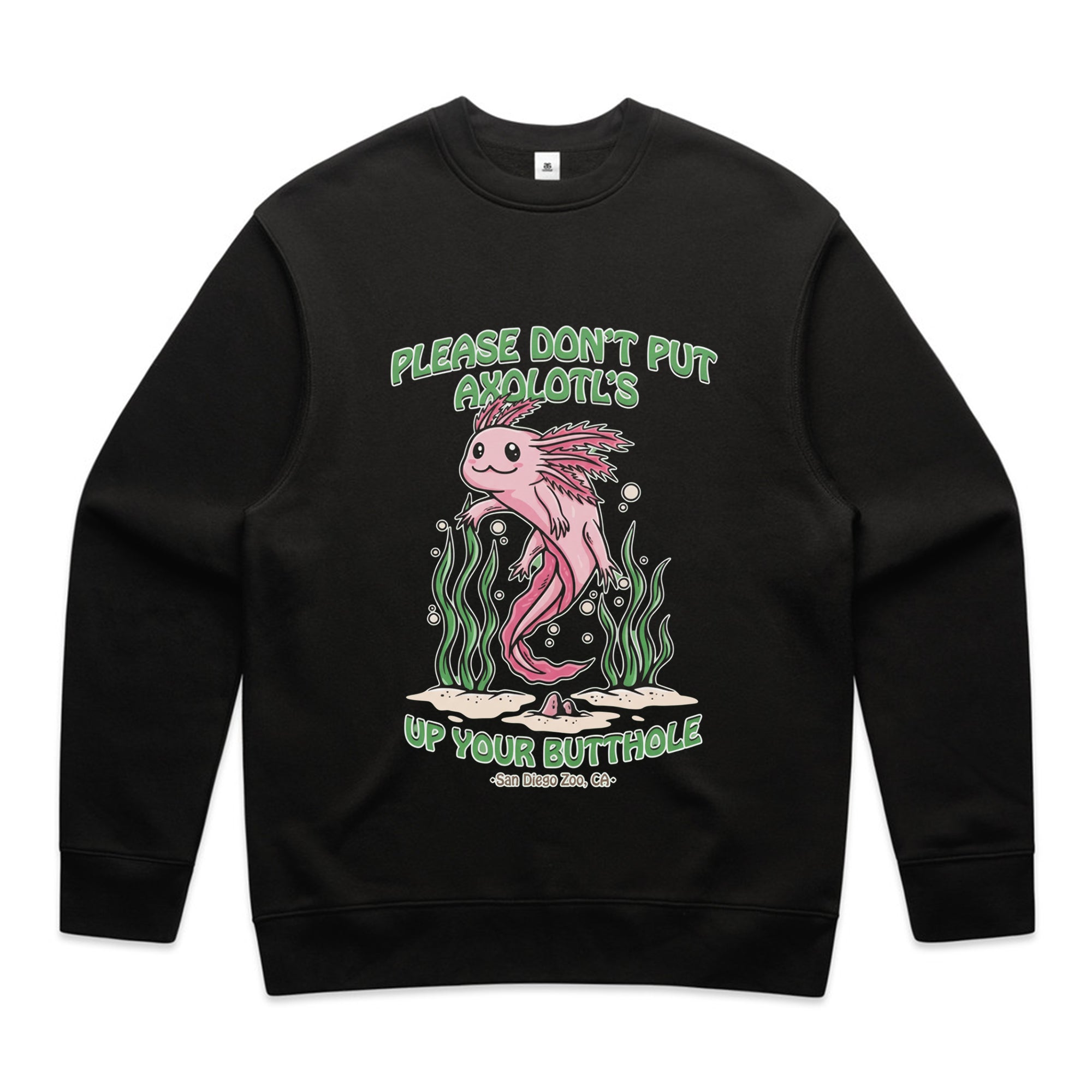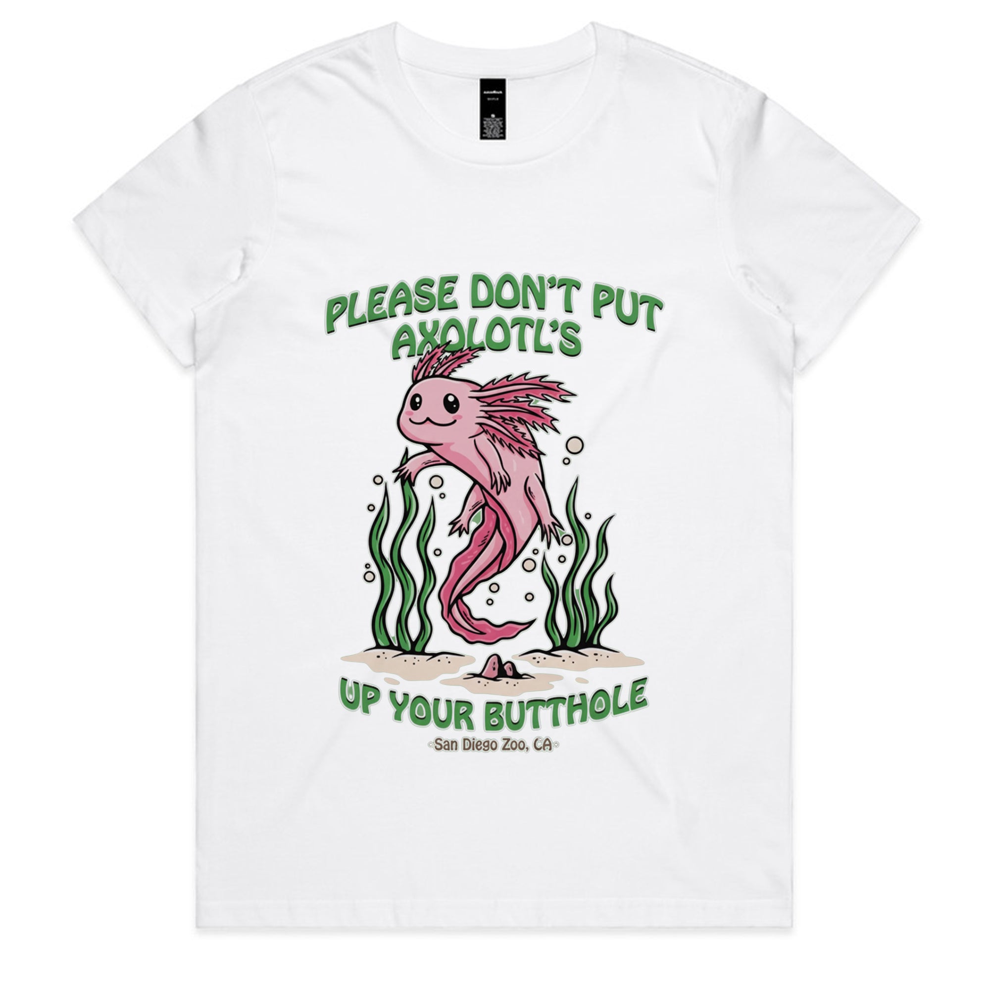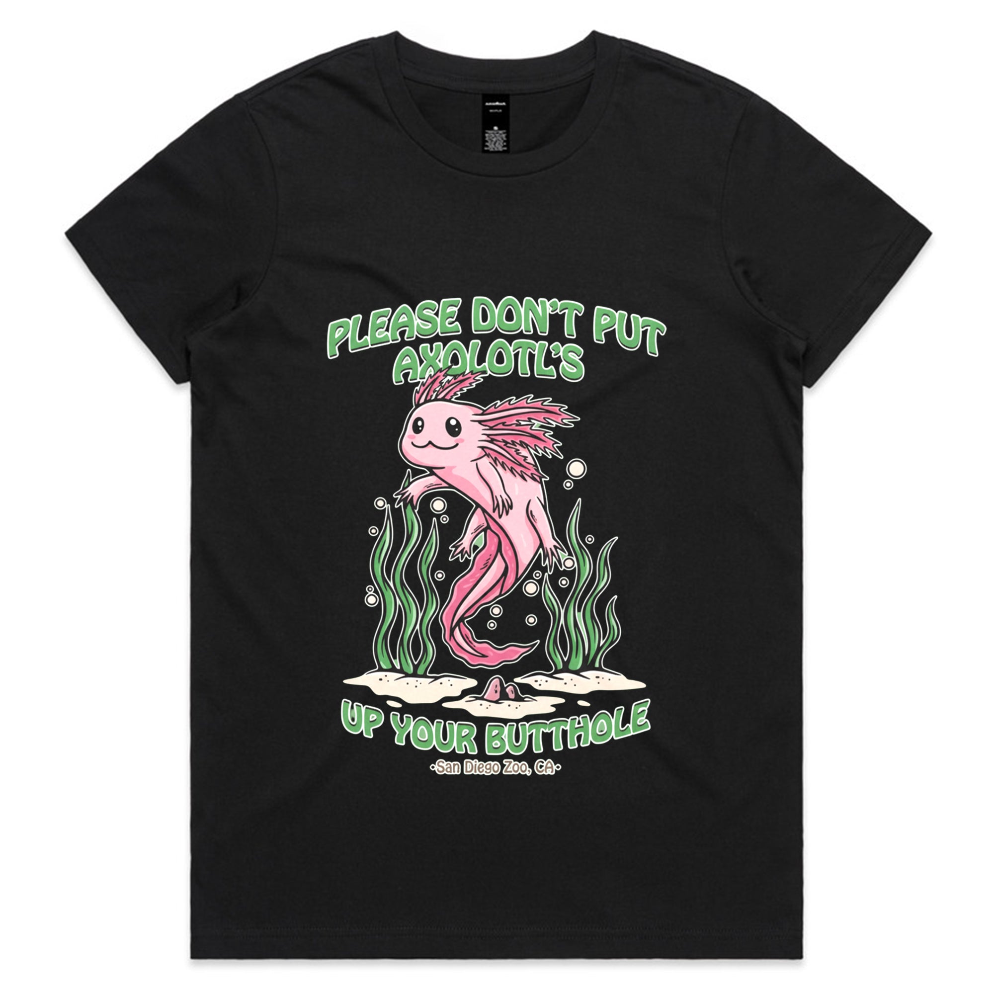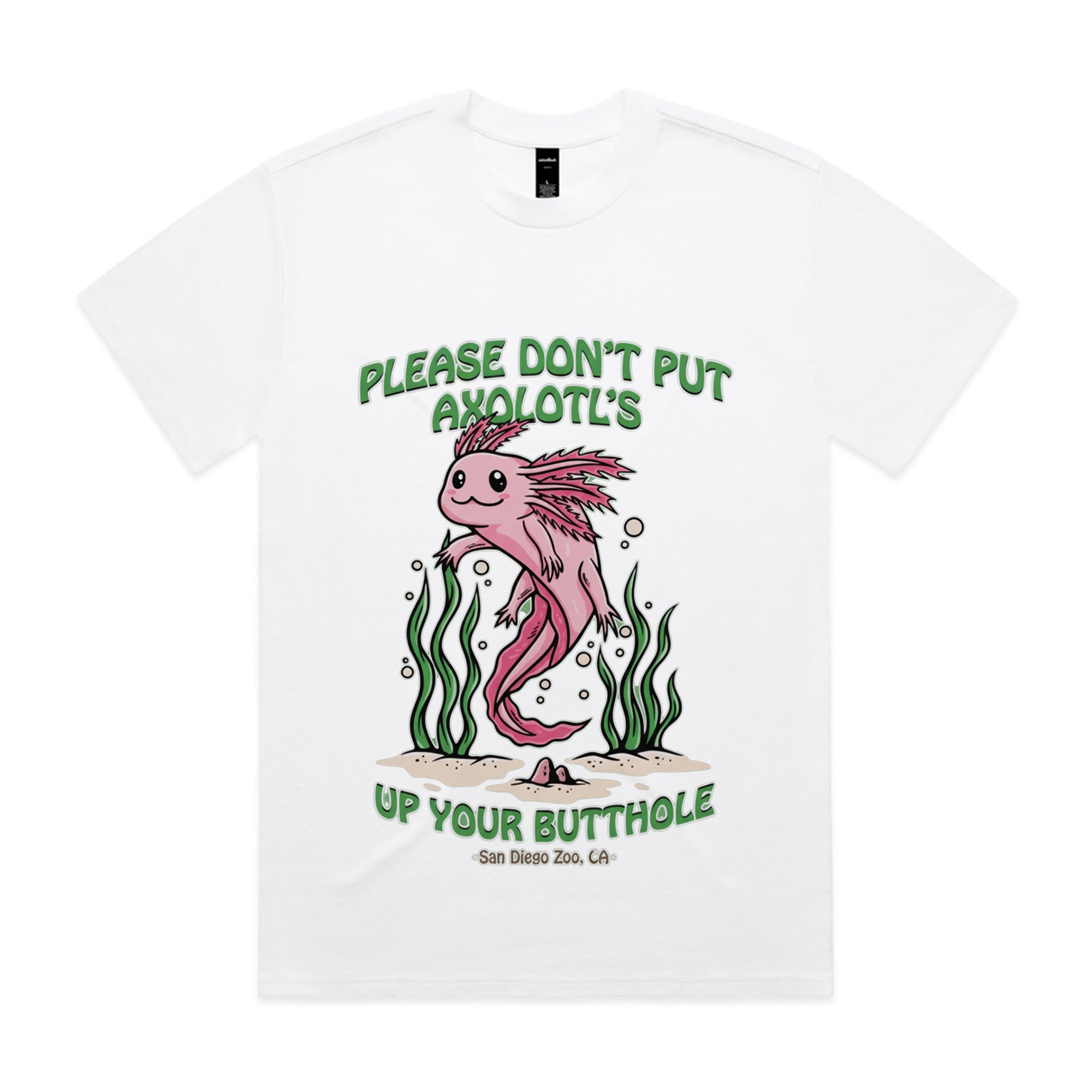 A cute, pink cartoon axolotl swimming among green seaweed. The friendly art style contrasts with a bizarre and dark-humored warning: "PLEASE DON'T PUT AXOLOTL'S UP YOUR BUTTHOLE."
