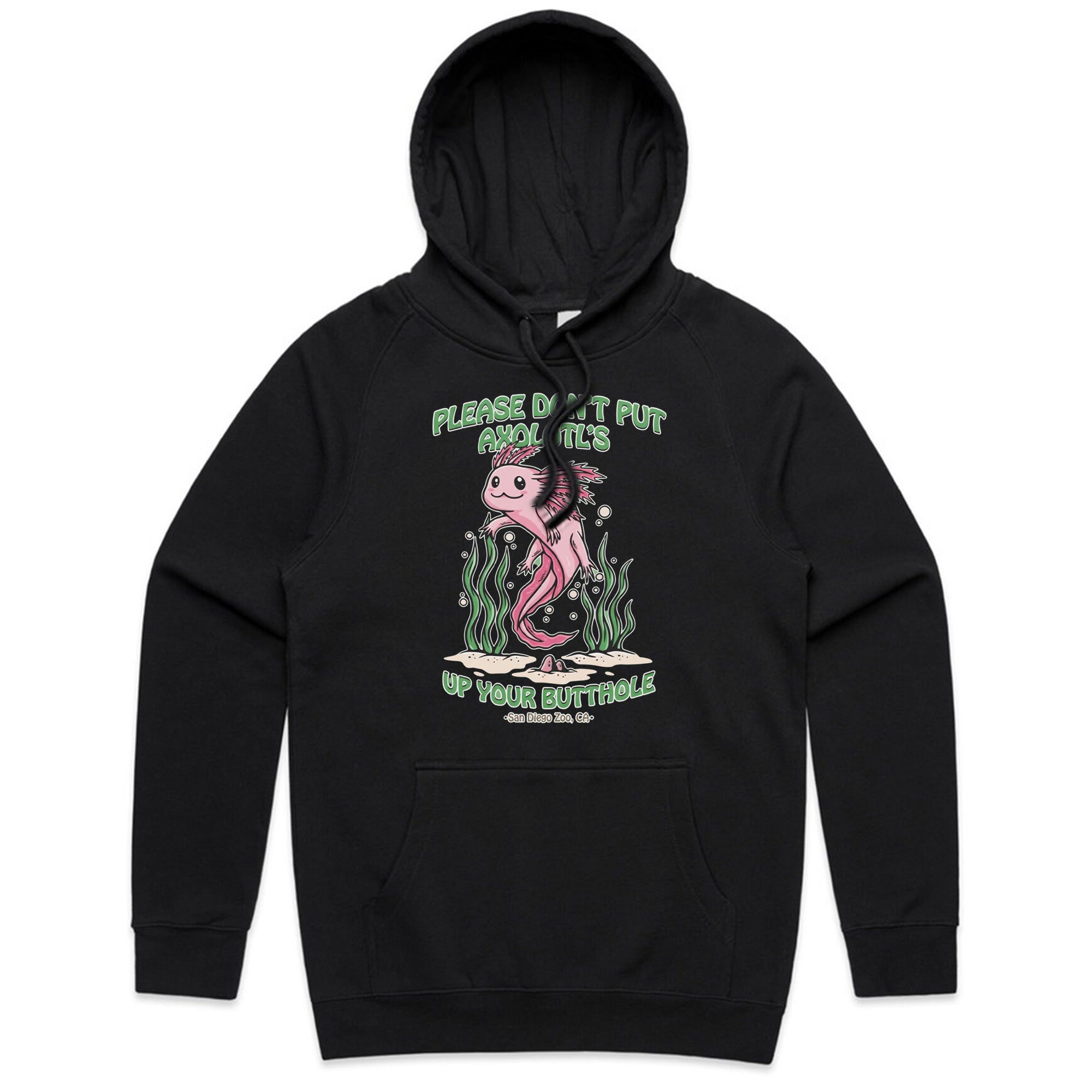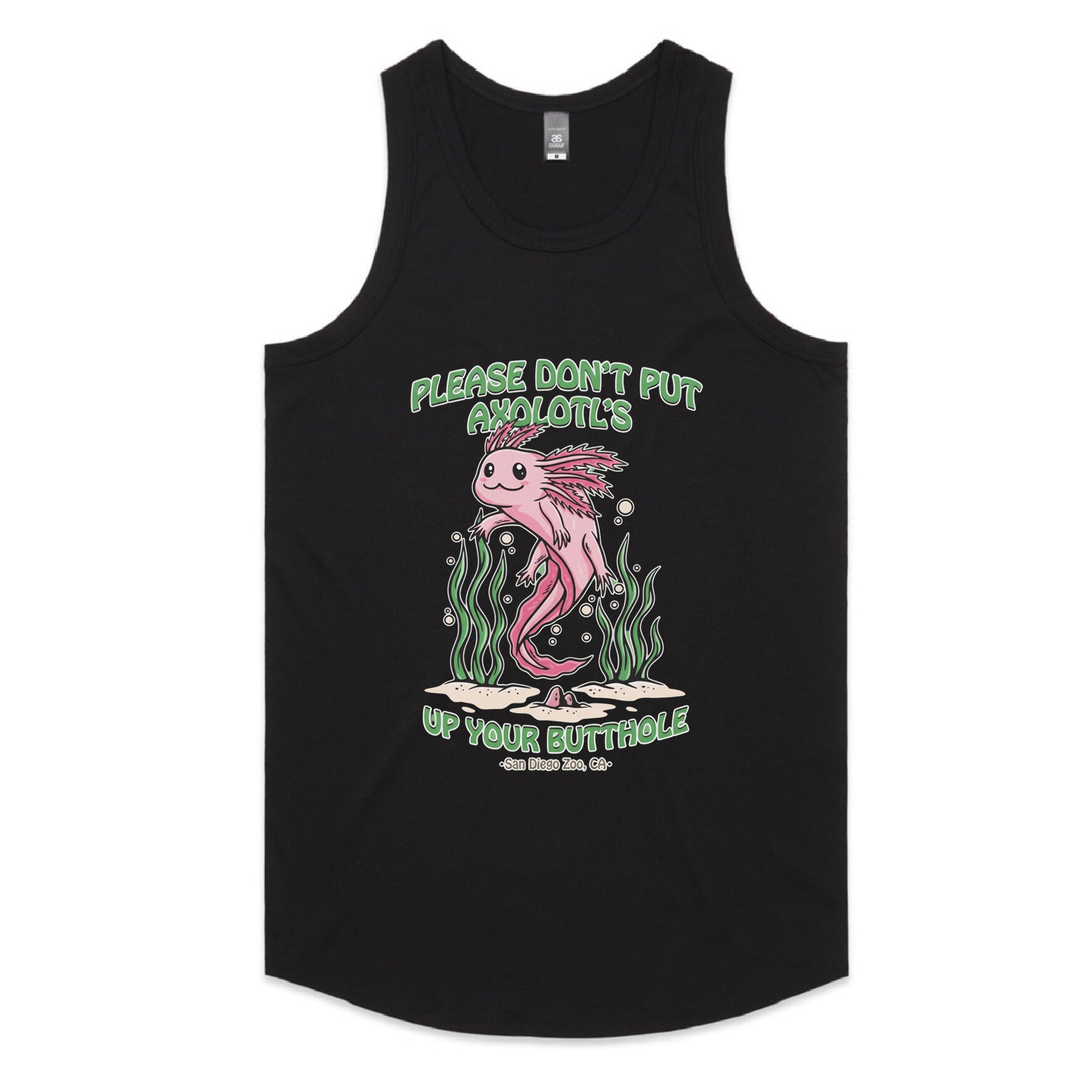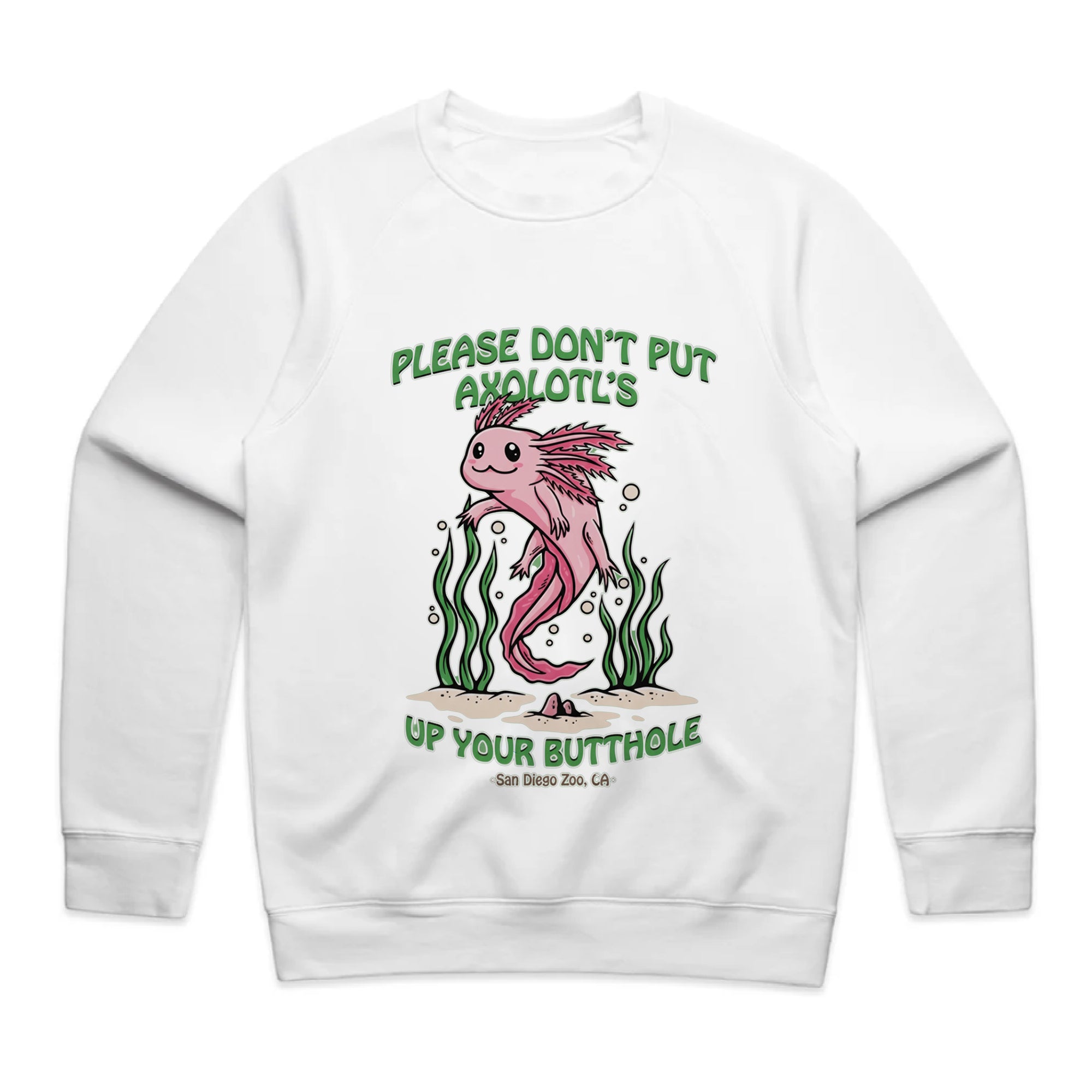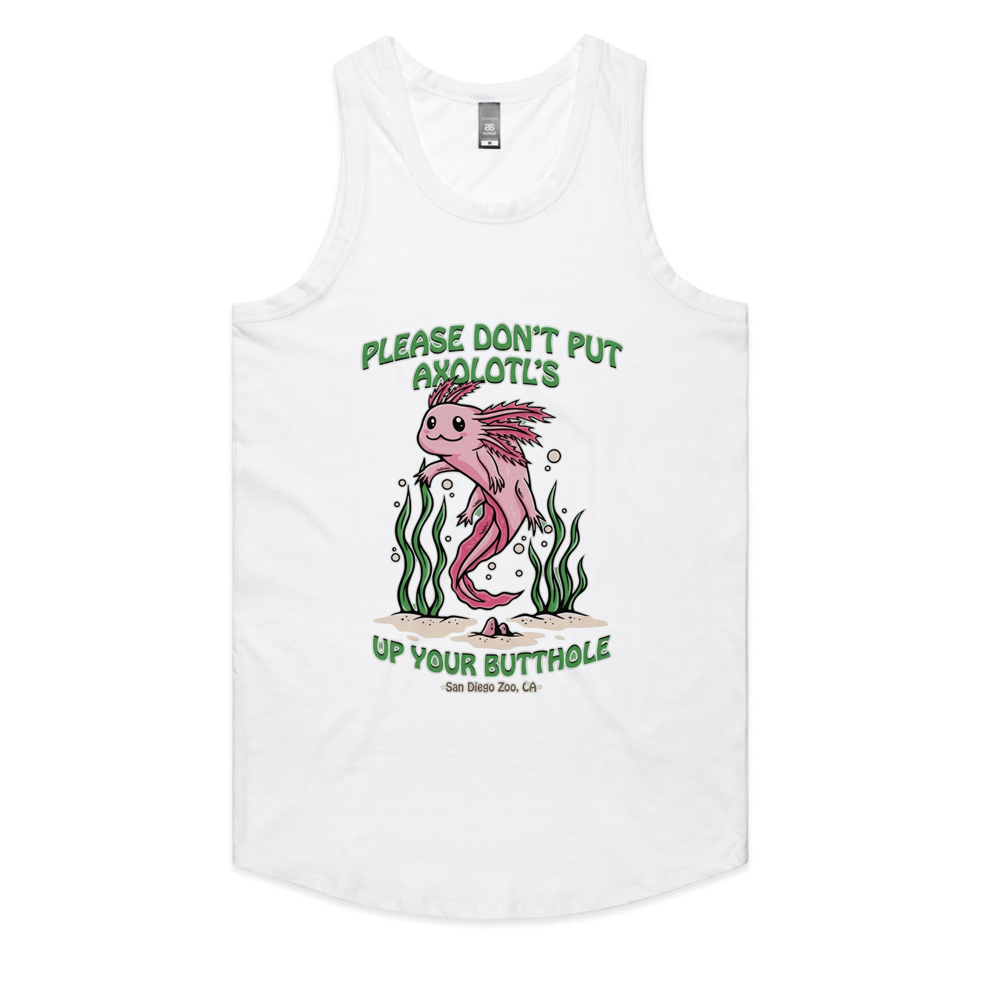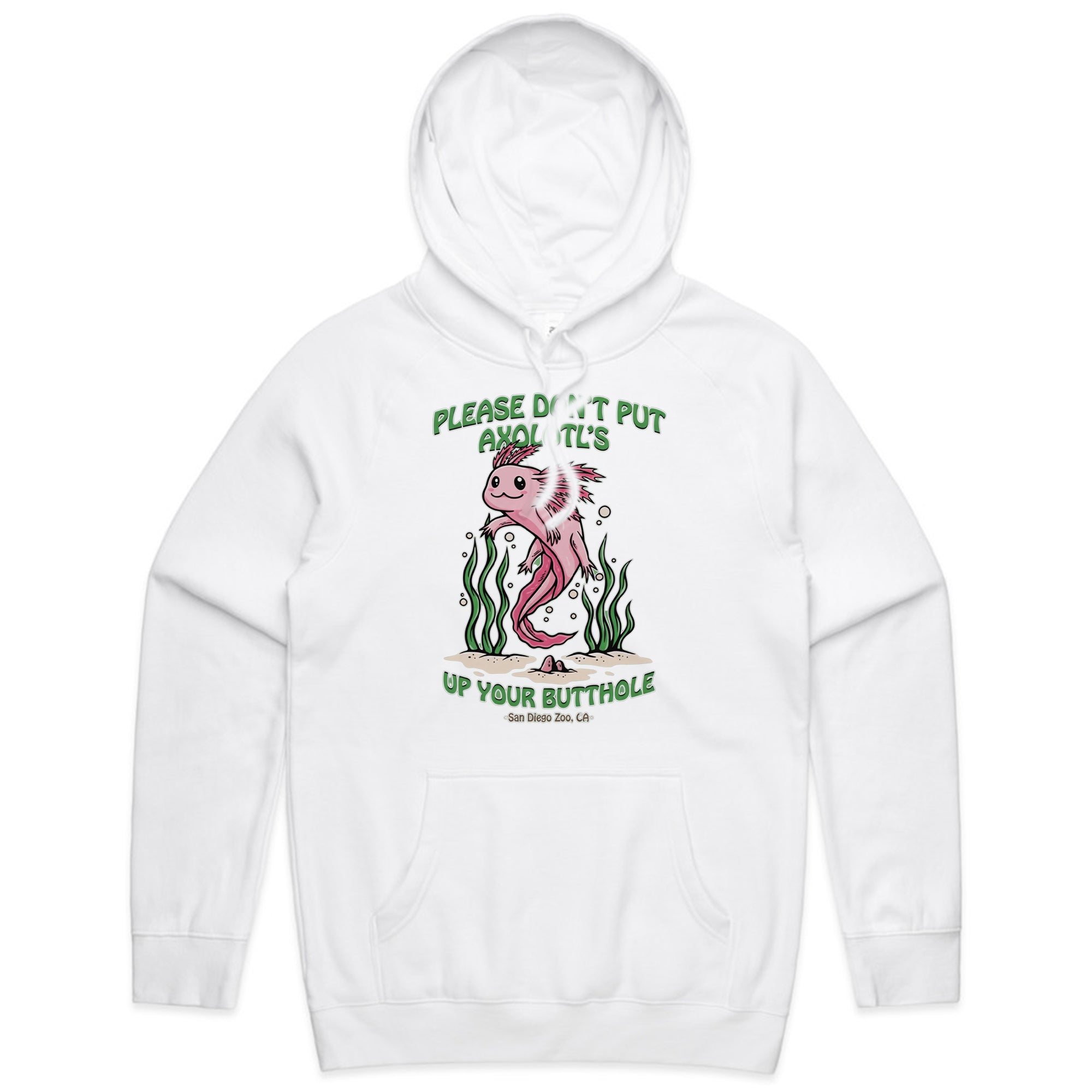 A cute, pink cartoon axolotl swimming among green seaweed. The friendly art style contrasts with a bizarre and dark-humored warning: "PLEASE DON'T PUT AXOLOTL'S UP YOUR BUTTHOLE."