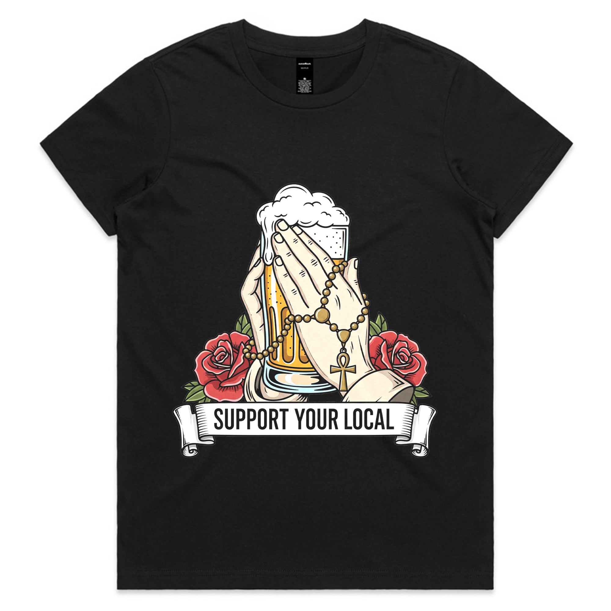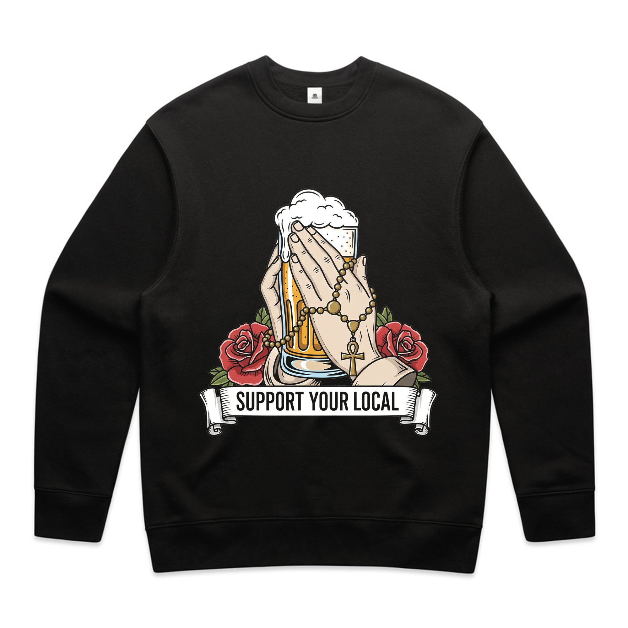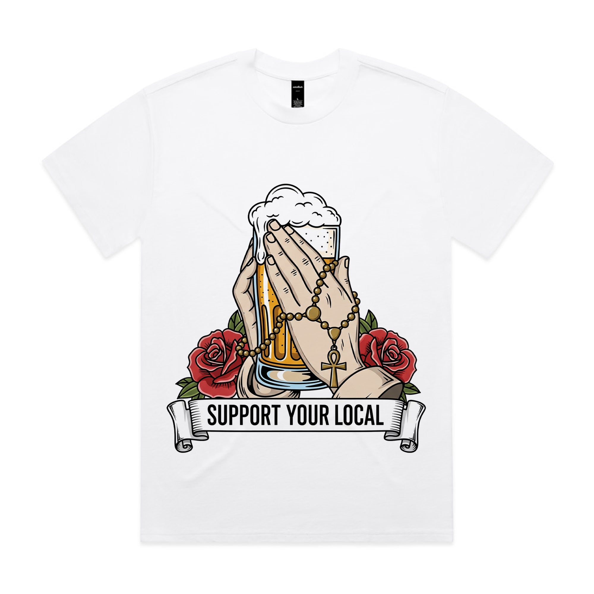 This design features praying hands holding a frothy beer, framed by red roses and a banner that reads “Support Your Local.” A perfect blend of humor and reverence — ideal for pub enthusiasts.