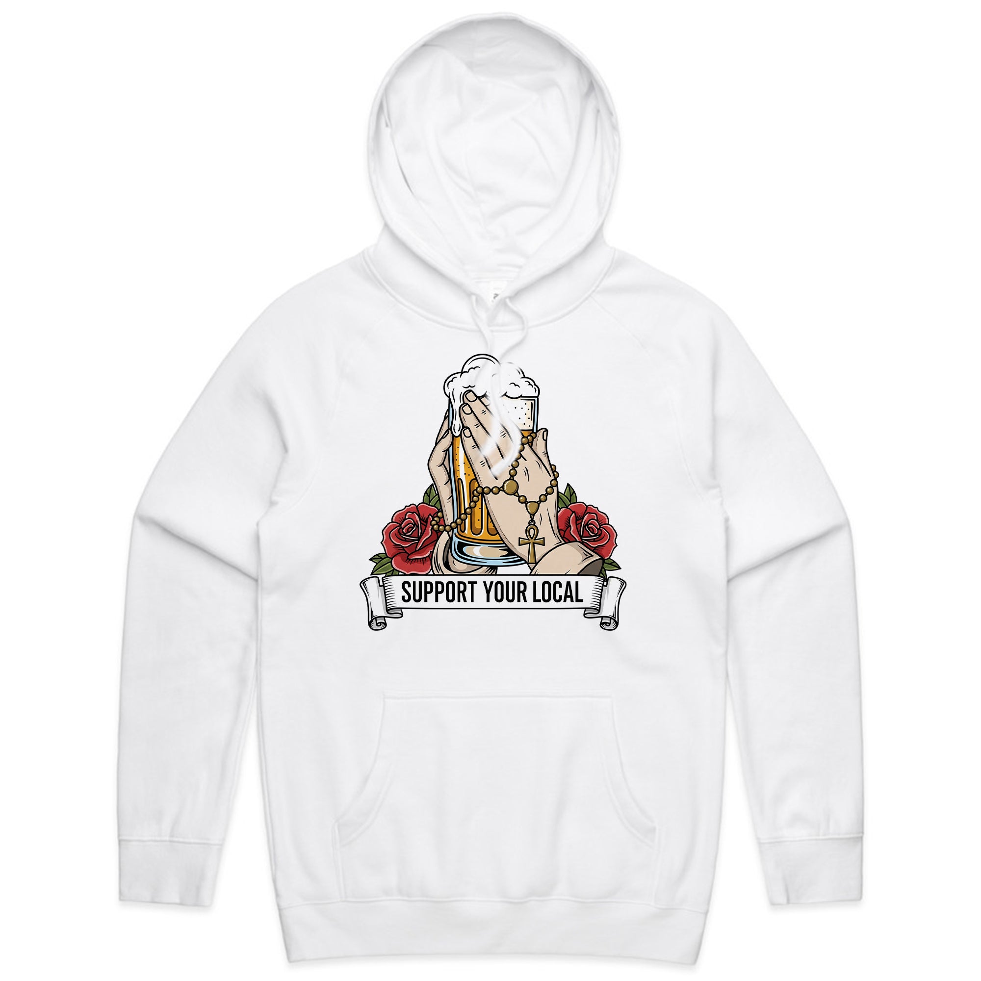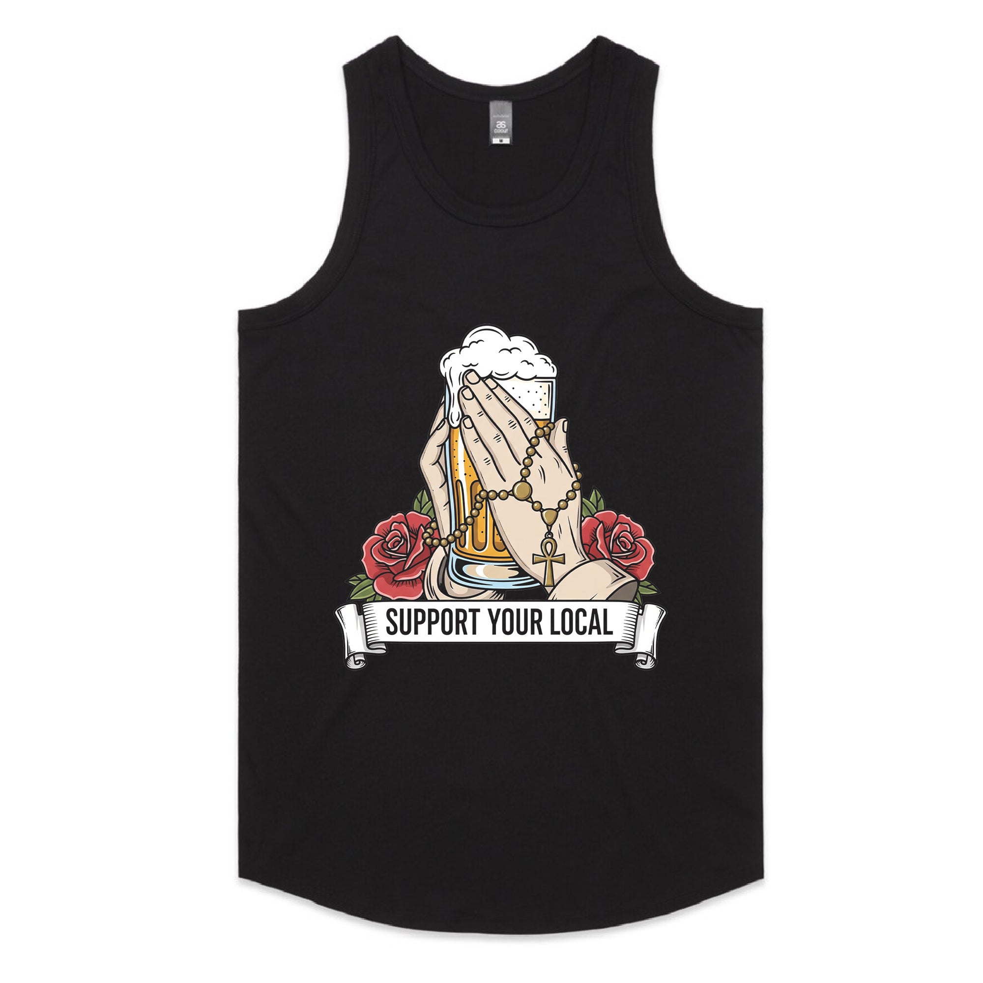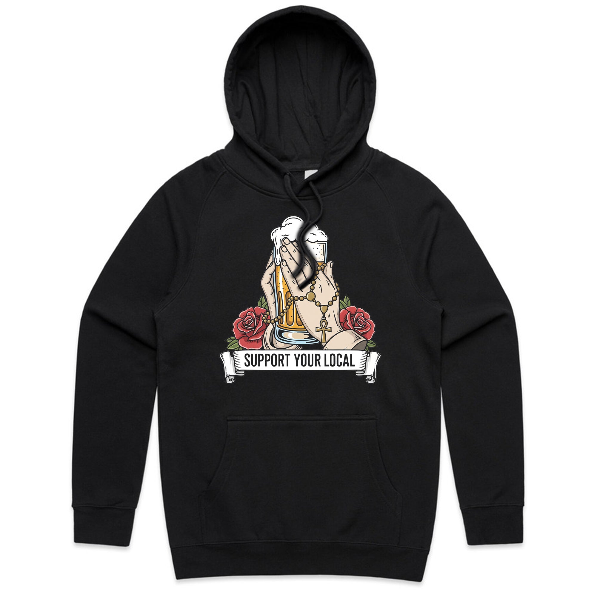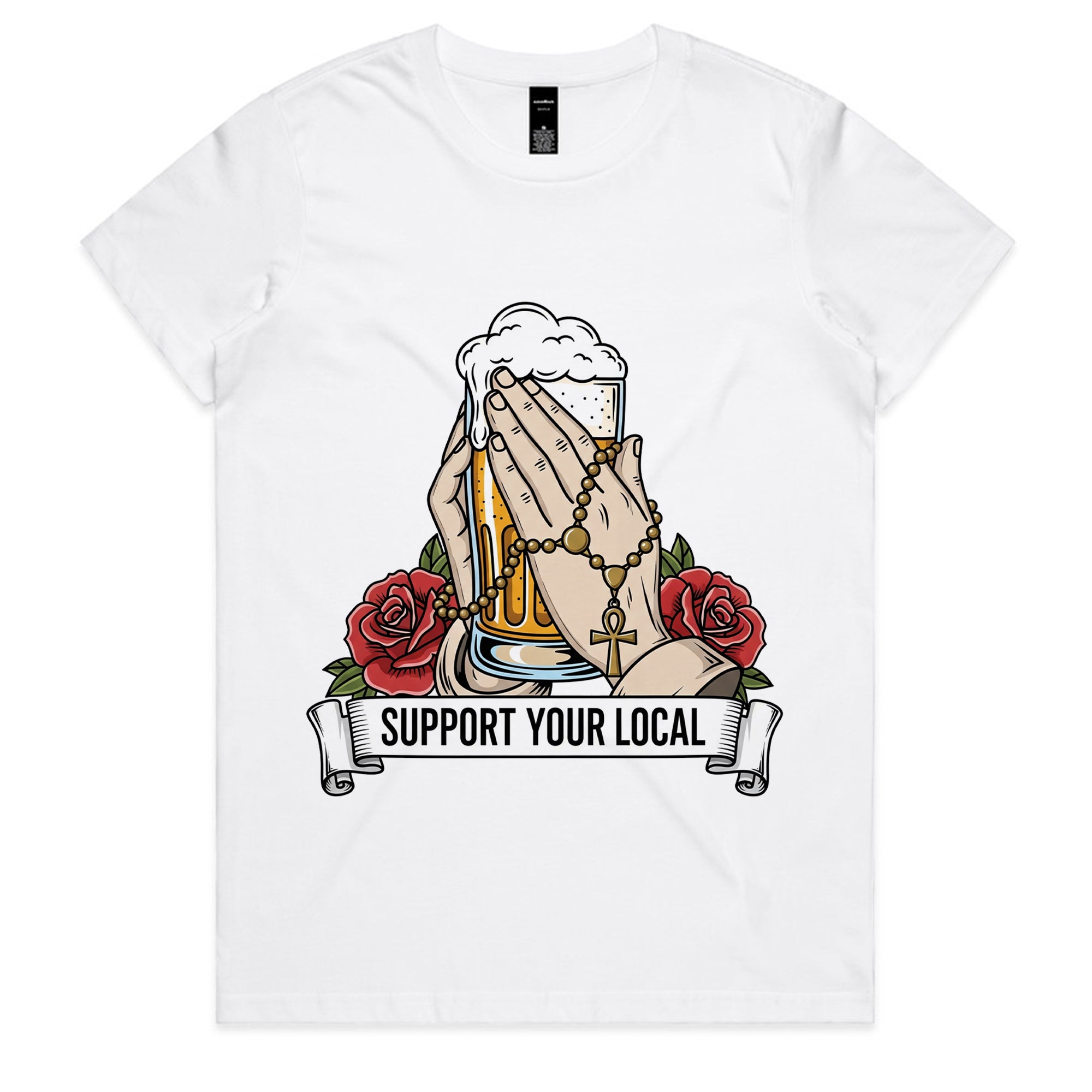 This design features praying hands holding a frothy beer, framed by red roses and a banner that reads “Support Your Local.” A perfect blend of humor and reverence — ideal for pub enthusiasts.