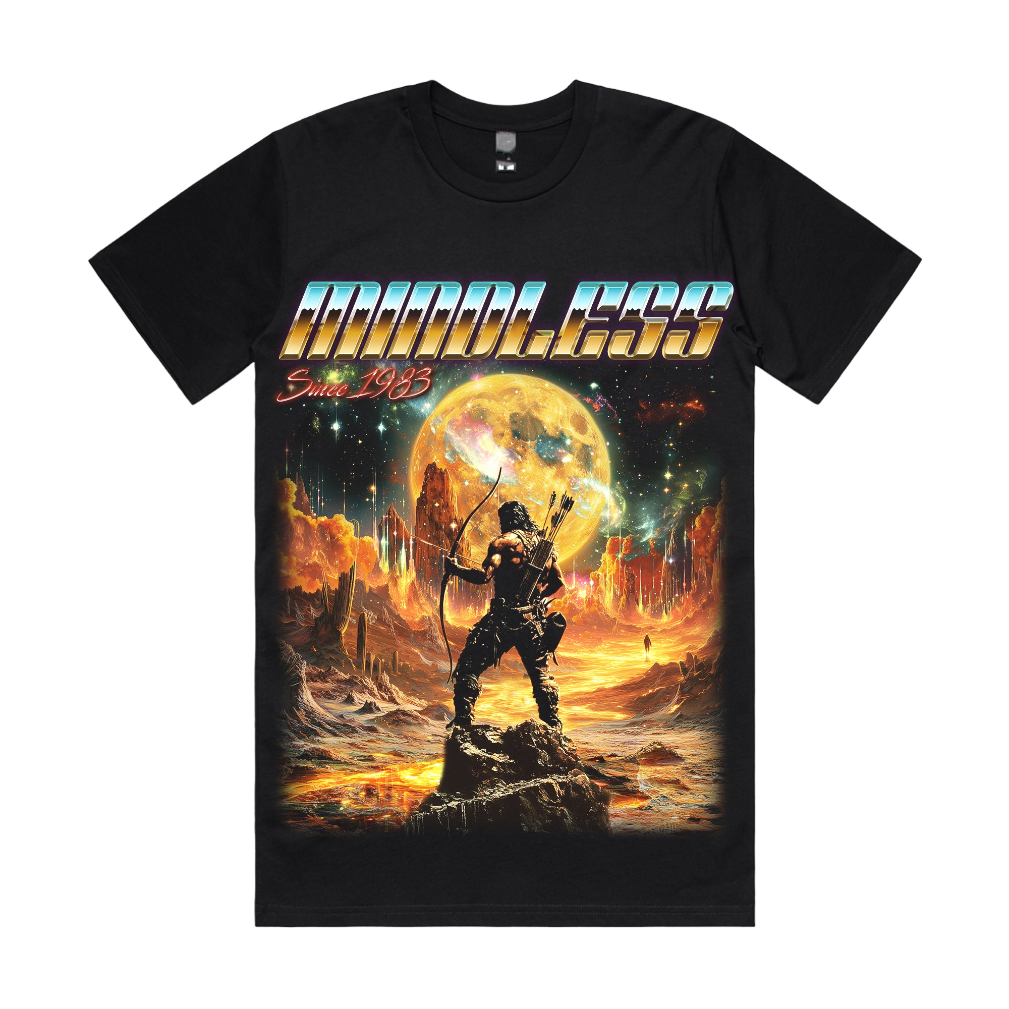 Aim beyond the stars with the "Cosmic Archer" T-shirt — a bold fusion of 80s retro-futurism and interstellar myth. This electrifying design features a lone archer standing atop a scorched alien ridge, poised against a glowing galaxy and colossal golden moon. Volcanic canyons stretch across the horizon while cosmic lights swirl in the skies — as if destiny itself is waiting to be hunted. The futuristic "Mindless – Since 1983" logo in shimmering chrome gradient brings vintage arcade energy into a galactic war zone.