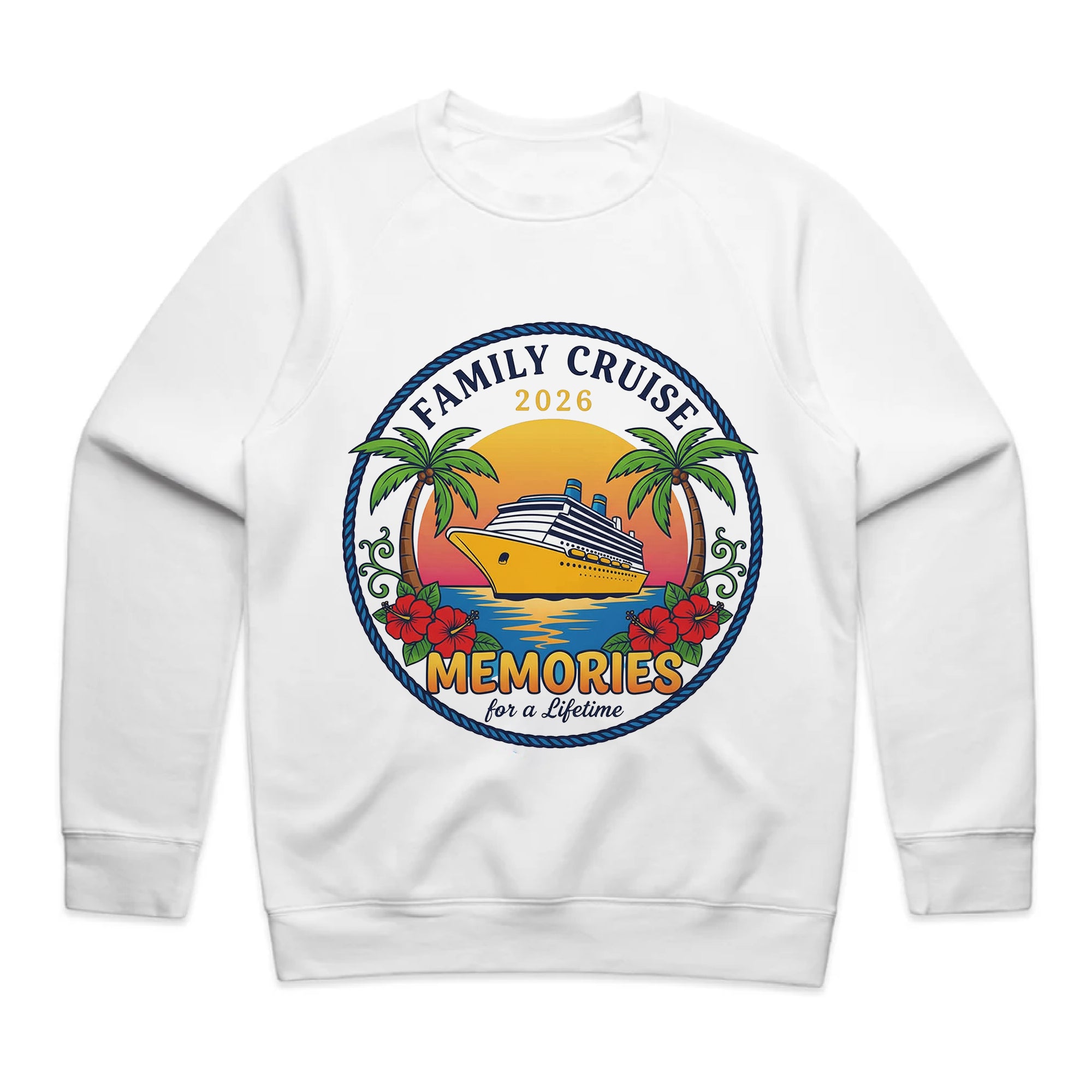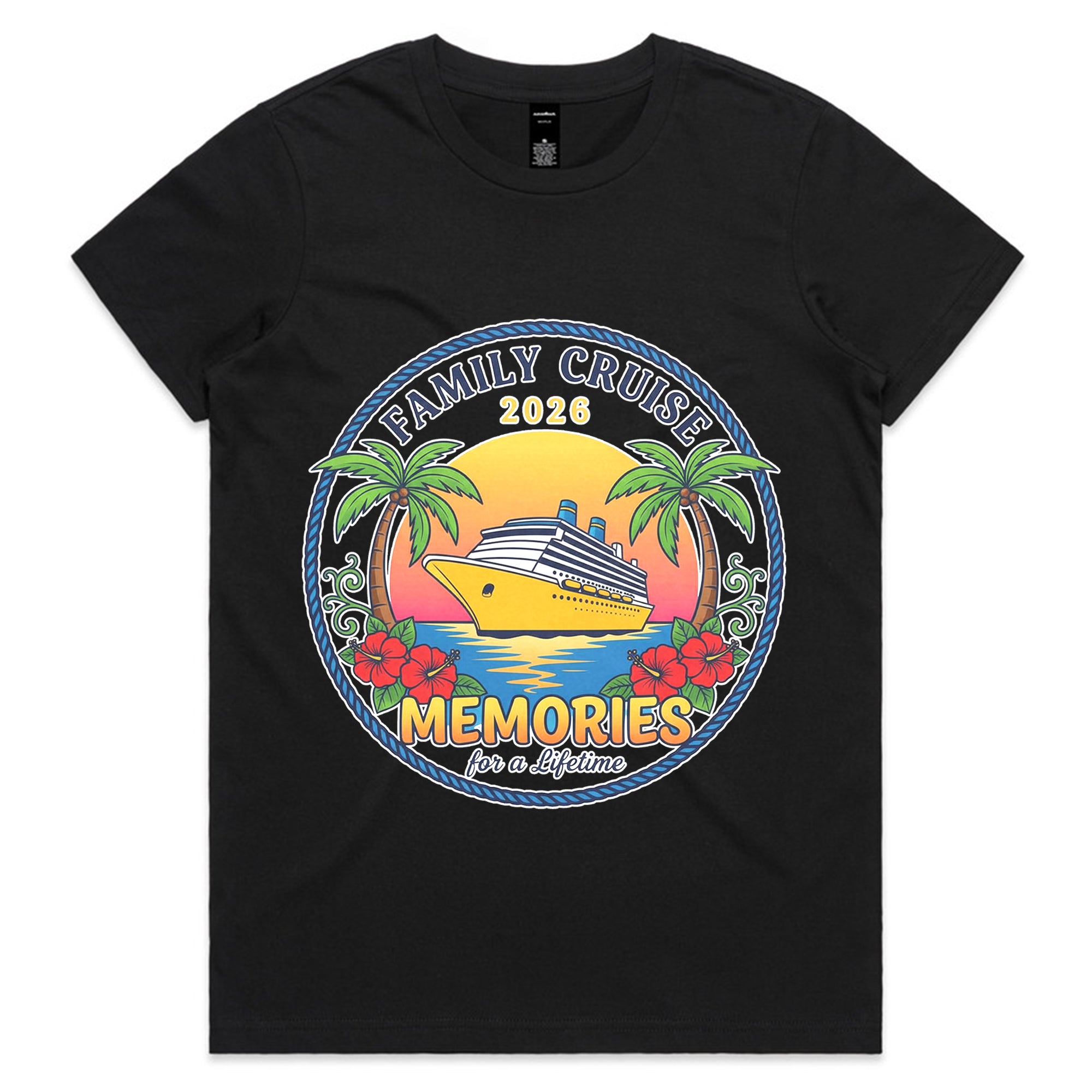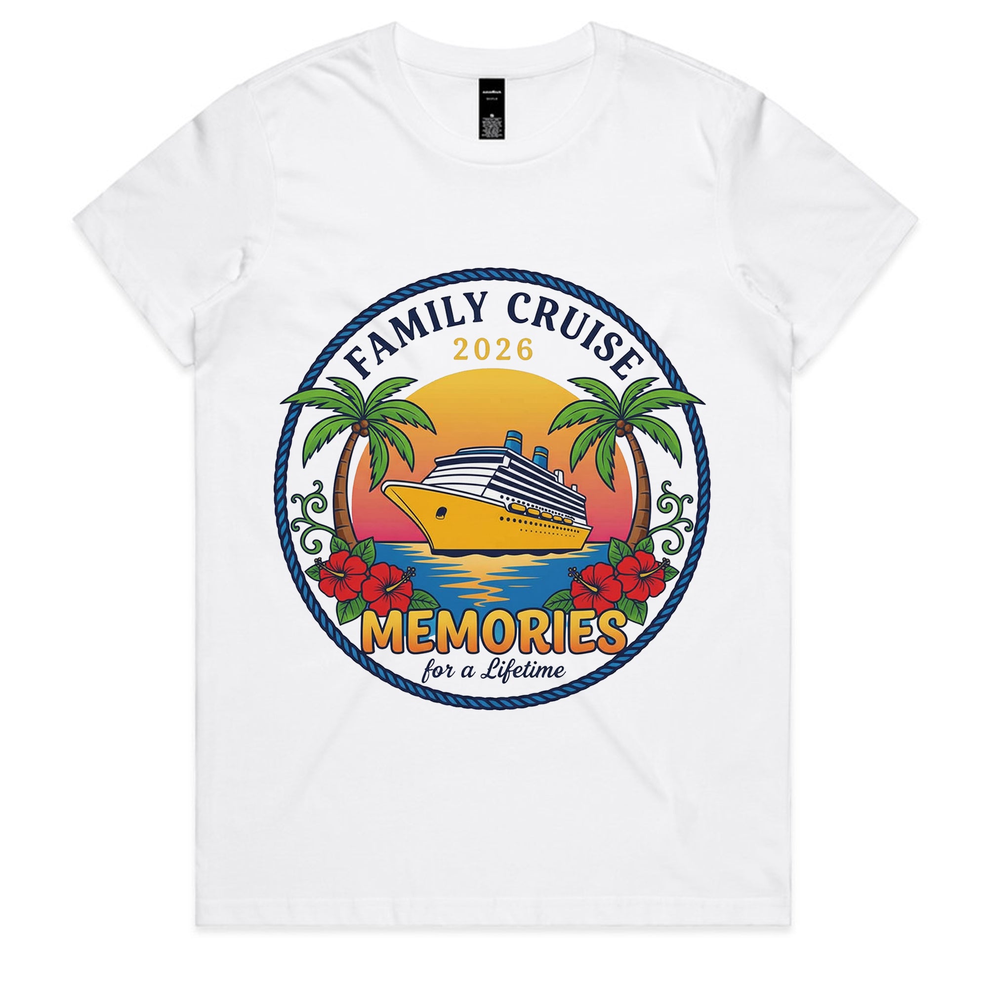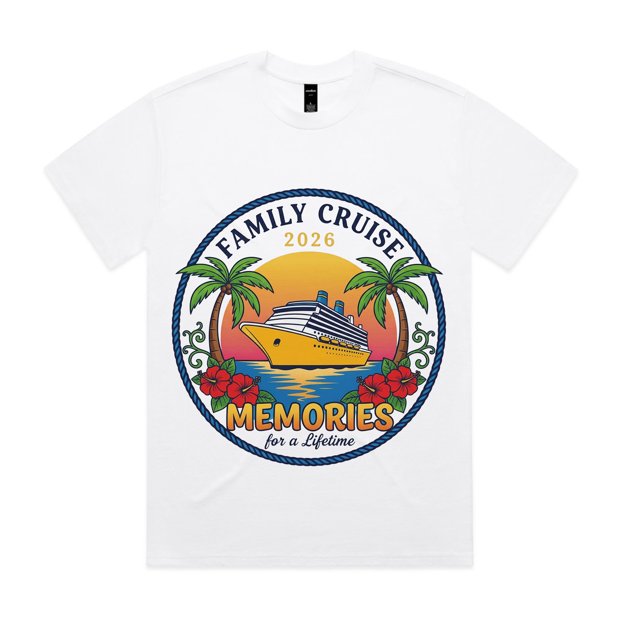 Capture the beauty of your ocean escape with this sunset-inspired tee. A glowing yellow cruise ship sails through tropical waters, surrounded by hibiscus flowers and palm trees. The message “Memories for a Lifetime” reminds you to cherish every moment on deck with loved ones.