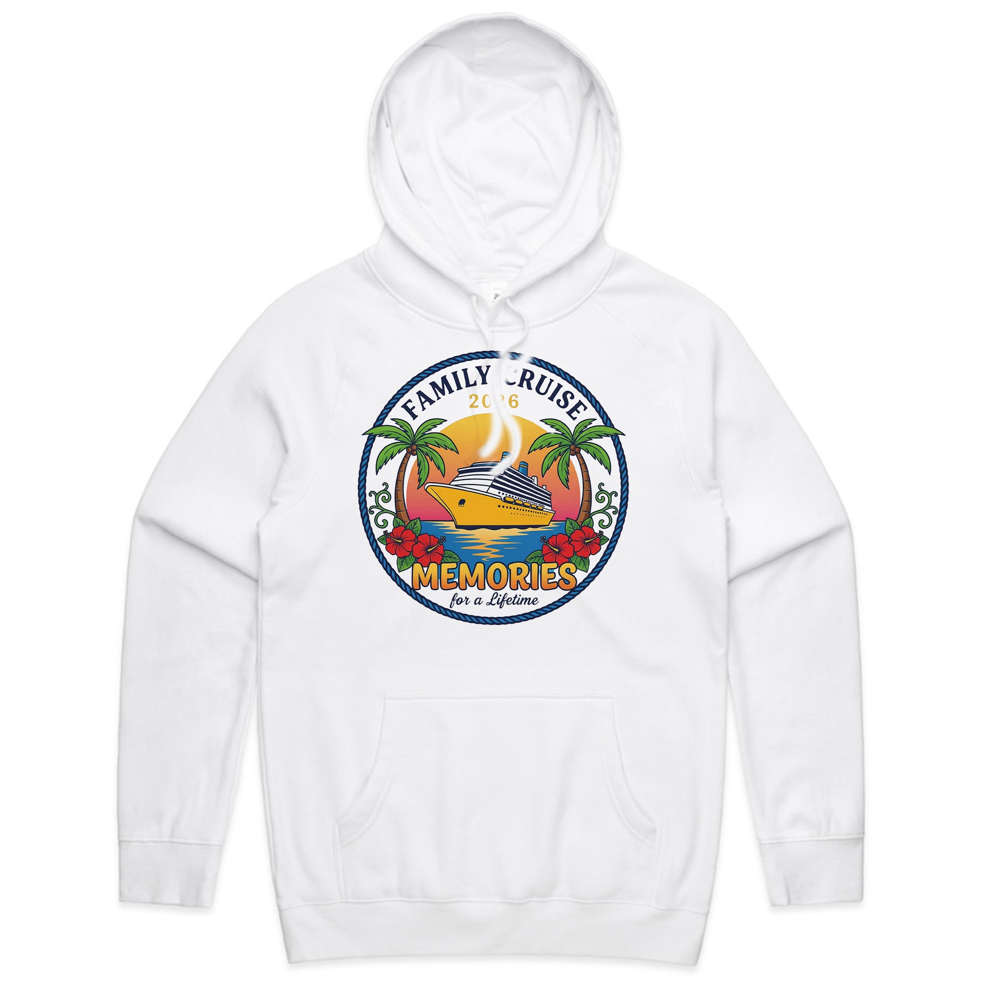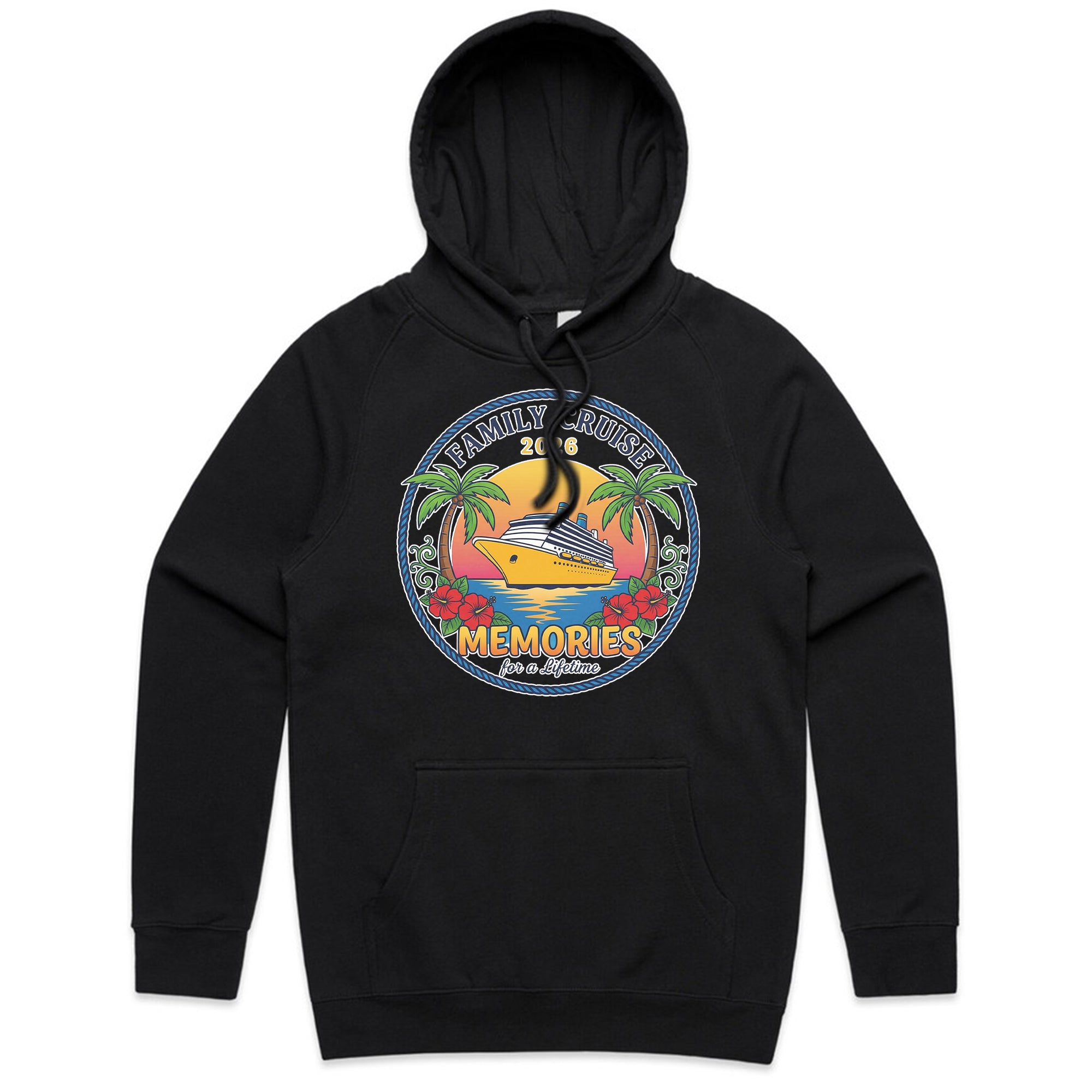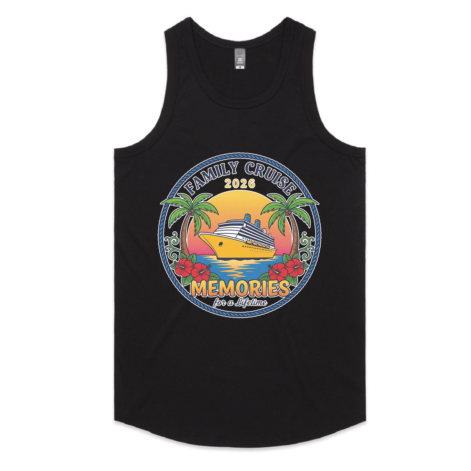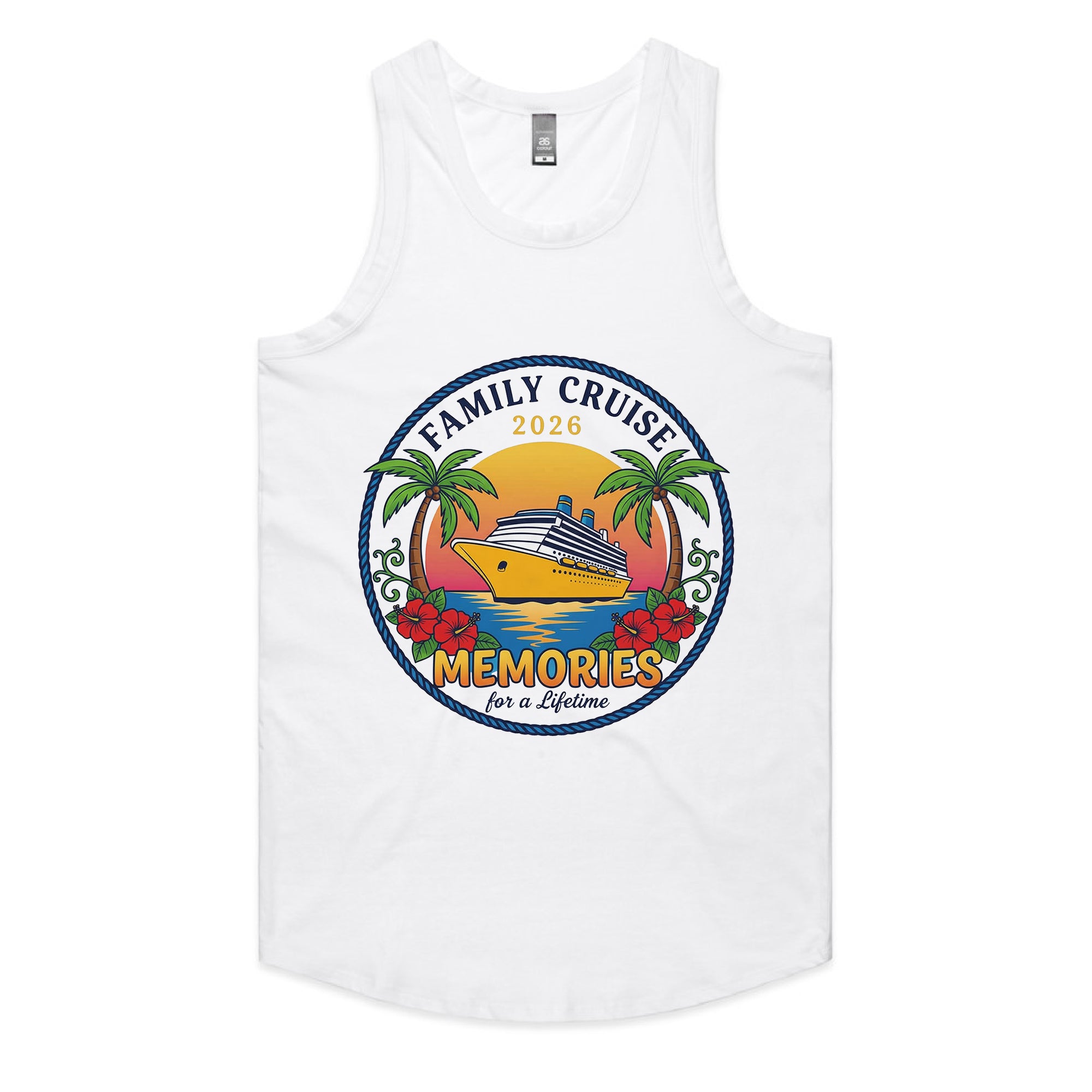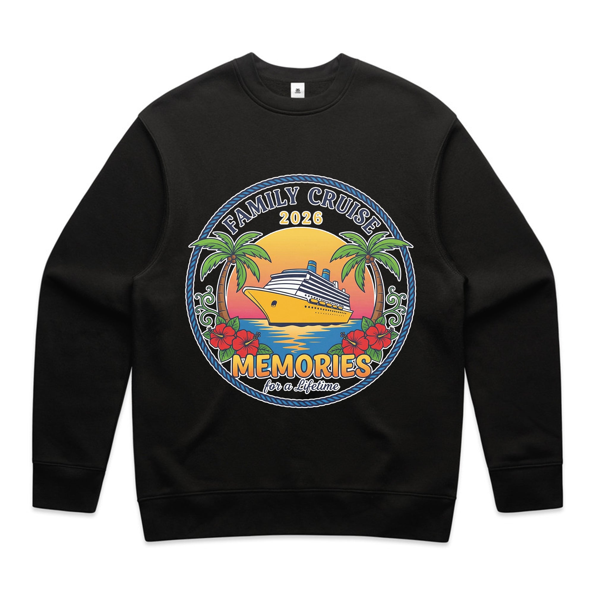 Capture the beauty of your ocean escape with this sunset-inspired tee. A glowing yellow cruise ship sails through tropical waters, surrounded by hibiscus flowers and palm trees. The message “Memories for a Lifetime” reminds you to cherish every moment on deck with loved ones.