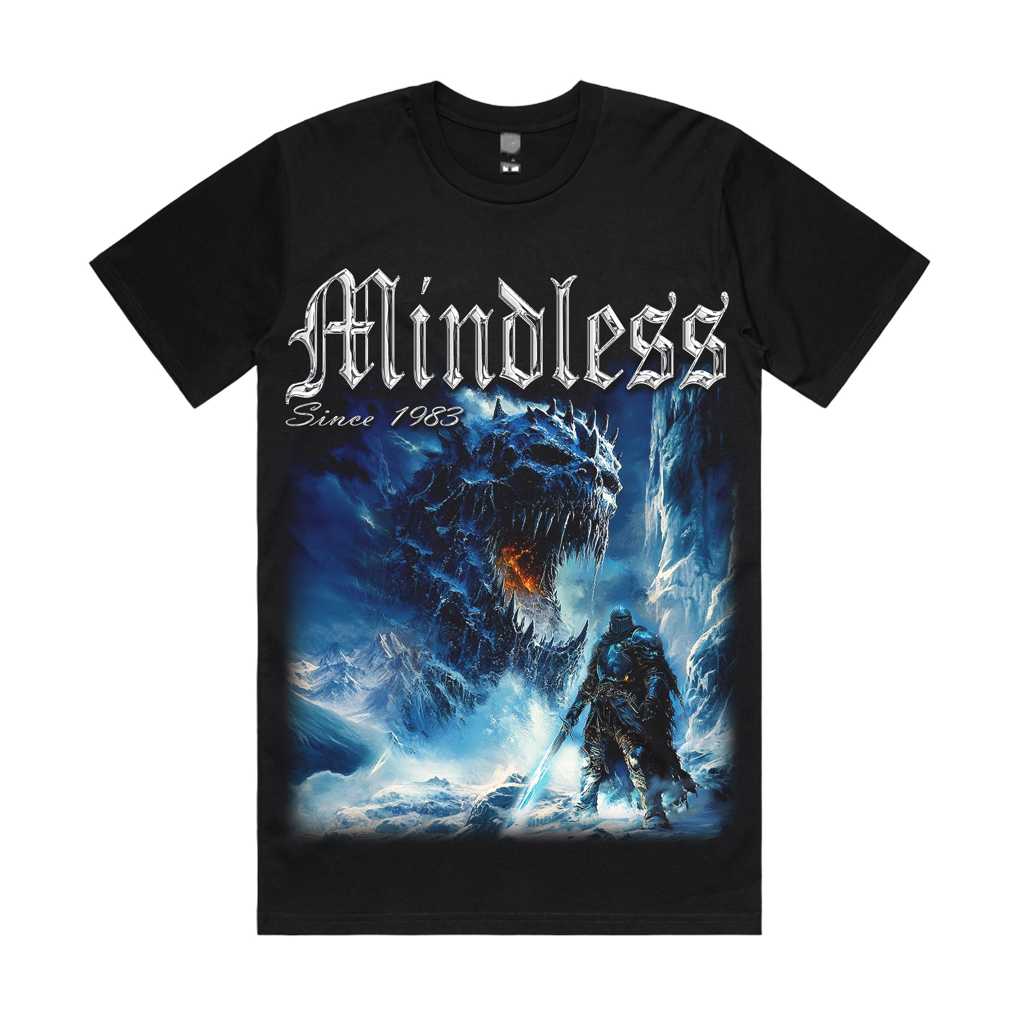 Gothic-style Mindless logo sits above the chaos with a sleek “Since 1983” script for vintage appeal