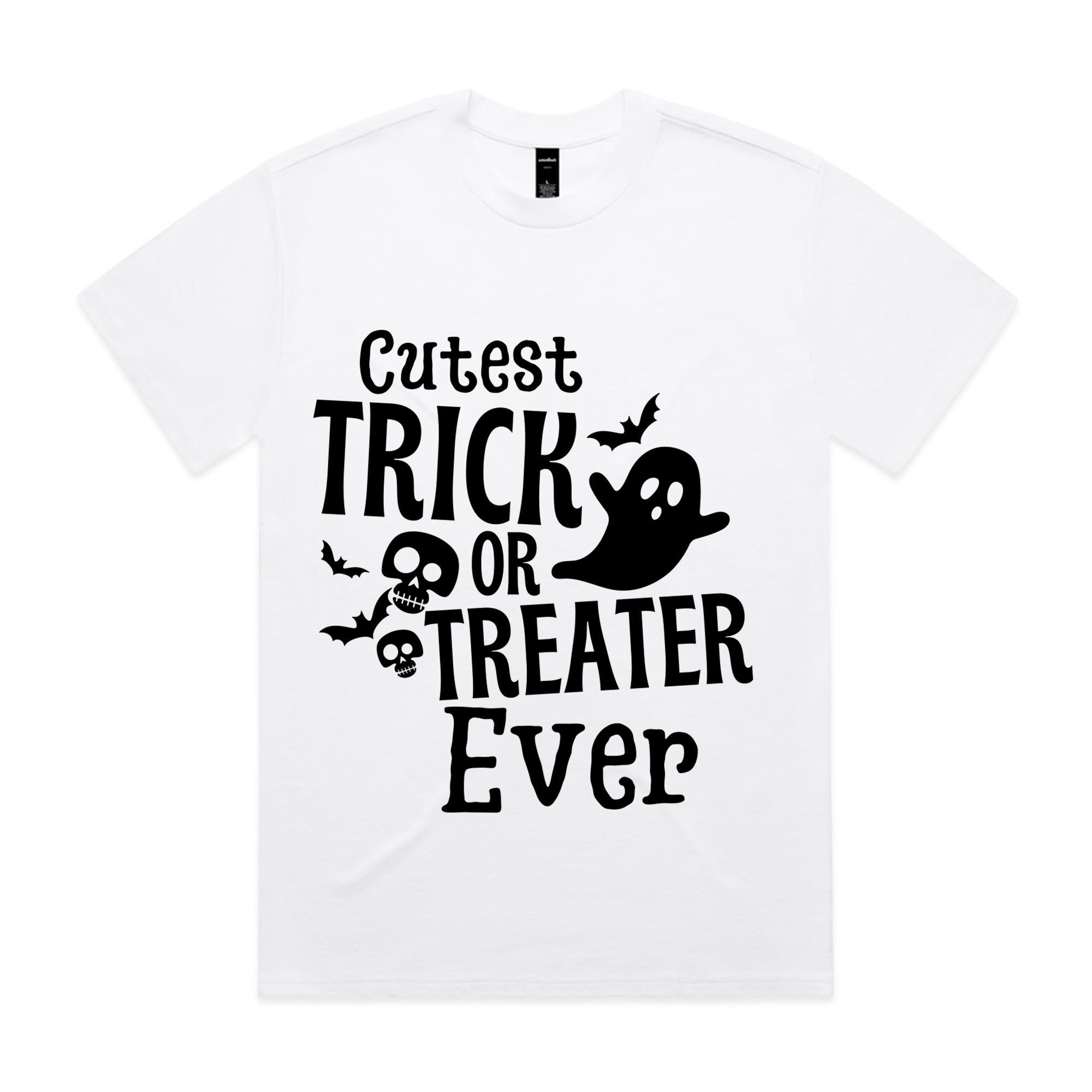 With its playful ghost, skulls, and bat accents, this tee is the perfect Halloween outfit for anyone who wants to mix spooky with adorable. The bold white print on black fabric makes the design pop, while the fun lettering brings out a festive vibe.
