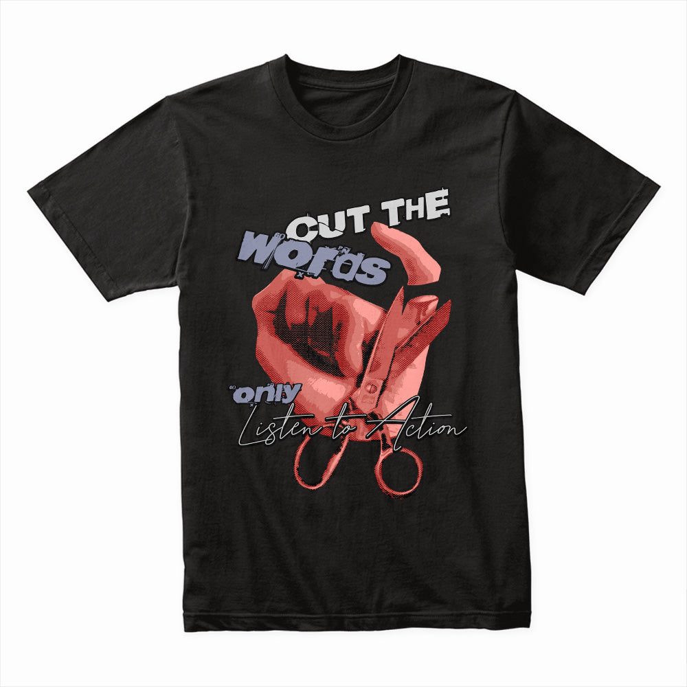 Silence empty promises with the “Actions Speak: Cut the Words Graphic Tee,” a bold design that makes a statement without saying much. This unique graphic features a red hand gripping scissors, slicing through the word WORDS while the phrases Cut the Words and Only Listen to Action dance around it—driving home a powerful message that what you do matters more than what you say.