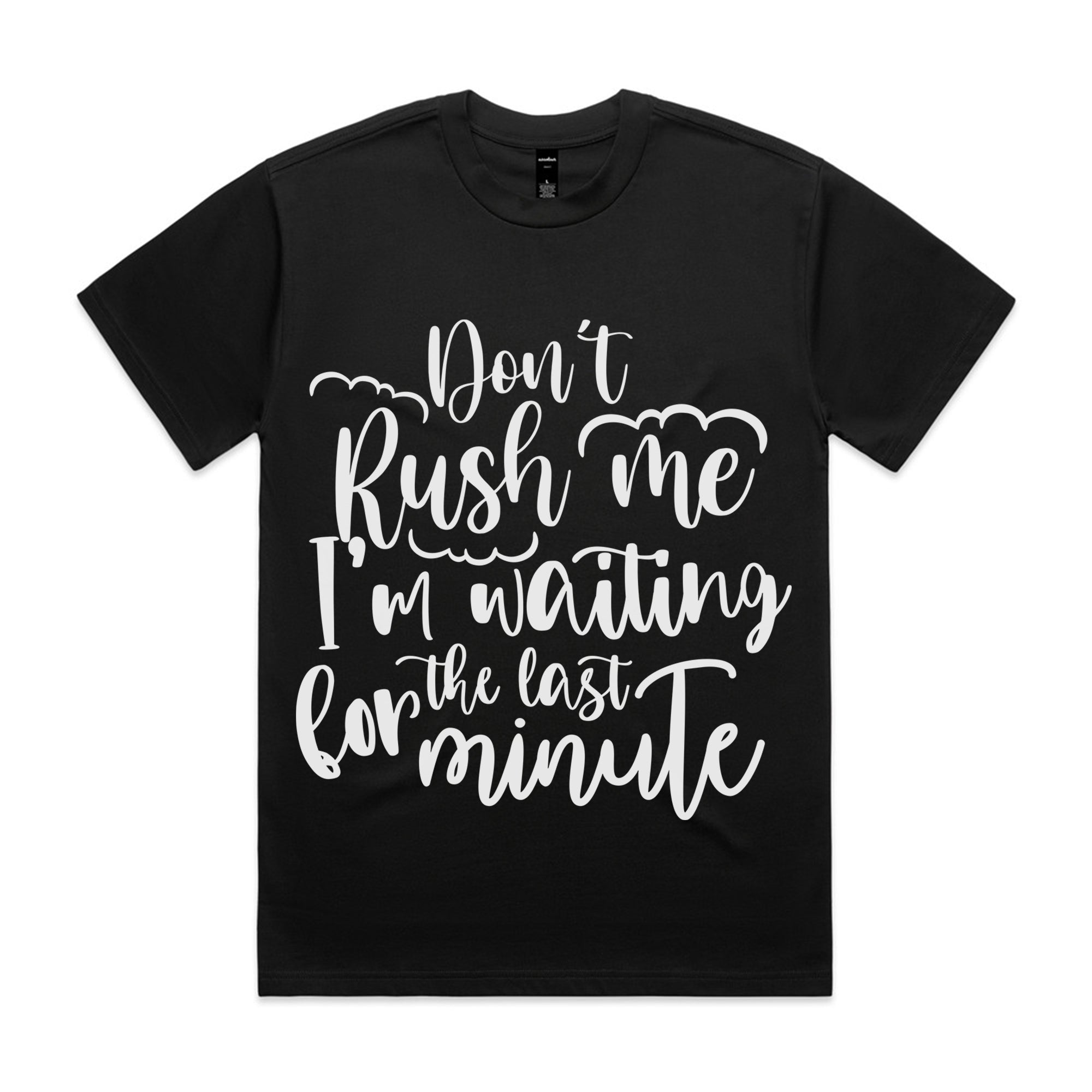 If procrastination is your superpower, this shirt says it all! Featuring the playful phrase “Don’t Rush Me, I’m Waiting for the Last Minute” in bold, stylish typography, this tee is perfect for anyone who thrives under deadline pressure.