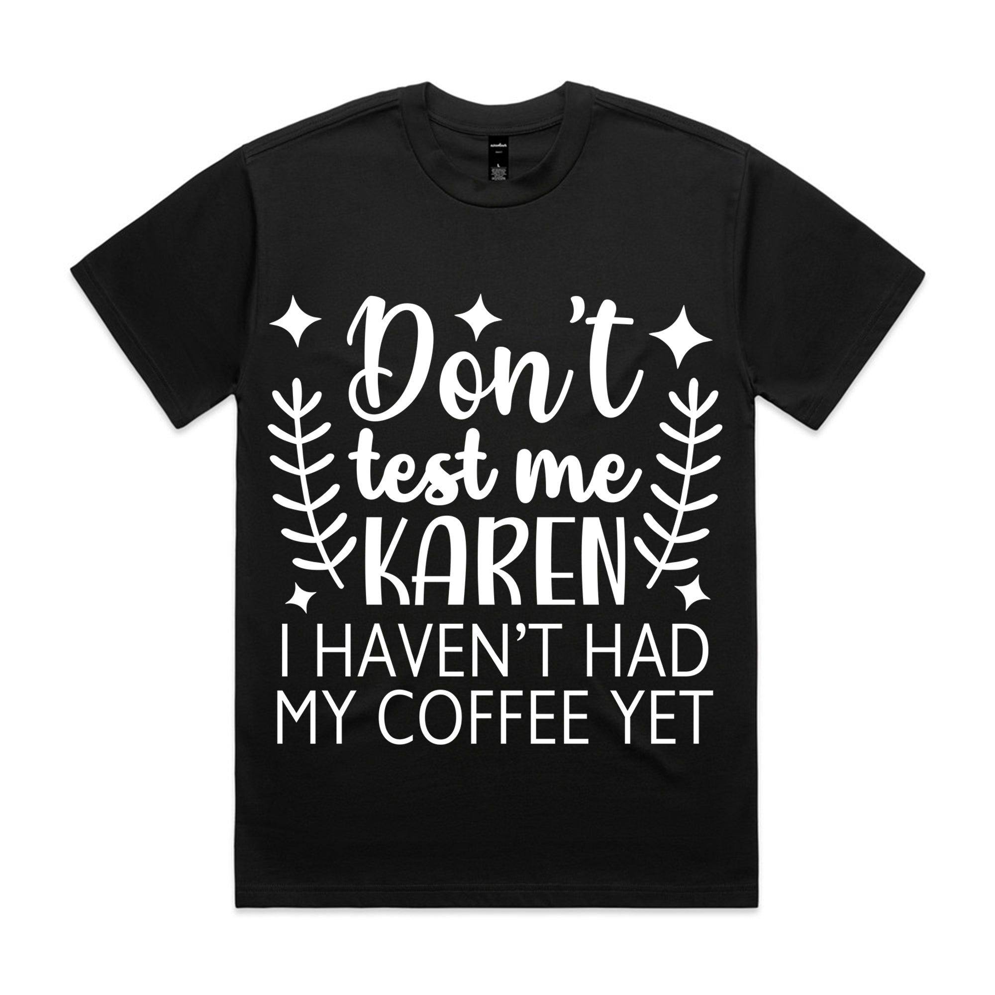 Start your day with laughter and caffeine attitude! This black tee features the bold and sassy phrase “Don’t Test Me Karen, I Haven’t Had My Coffee Yet” with playful leaf and star accents. Perfect for coffee lovers who need their morning brew before dealing with the world.