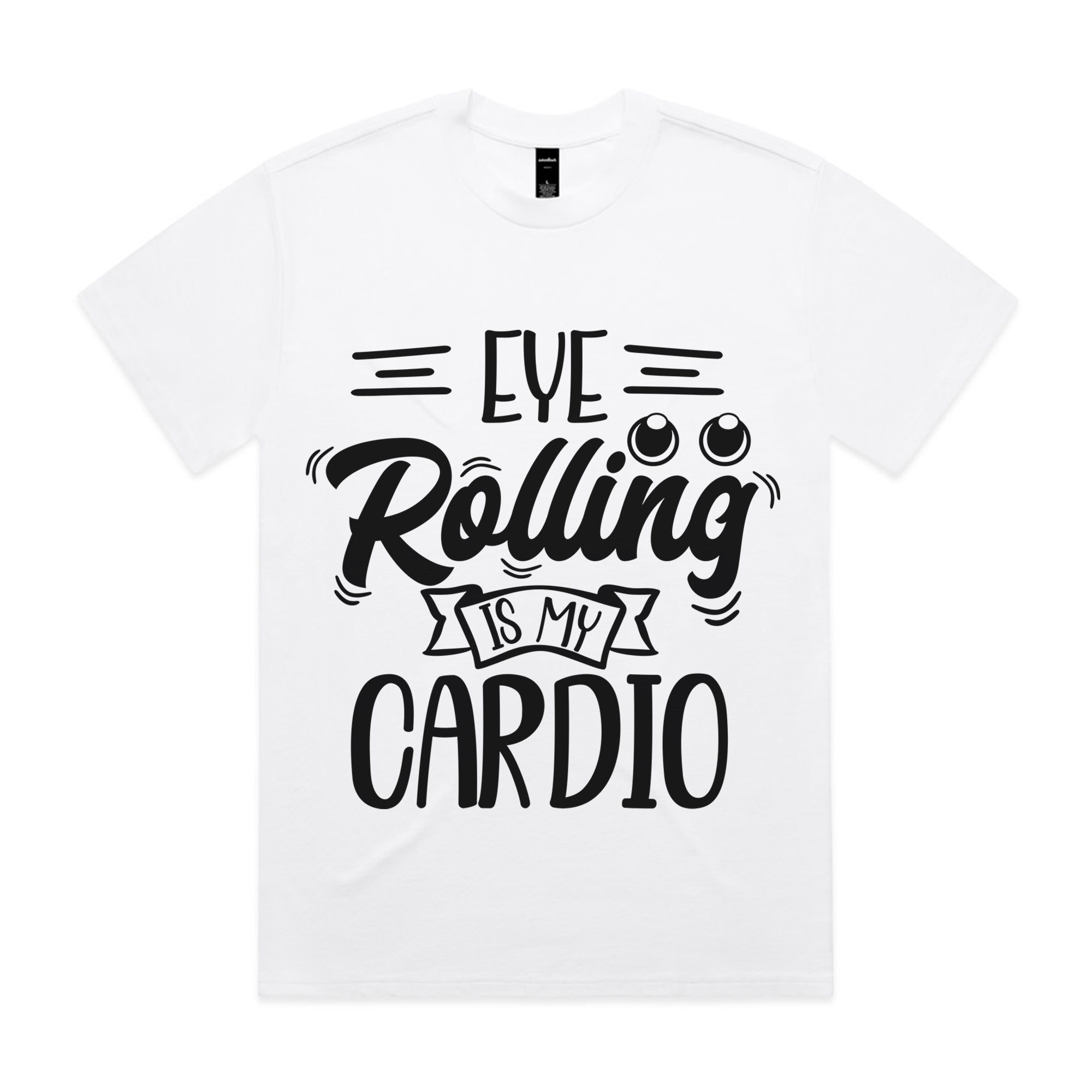 Who needs the gym when sarcasm is your workout? This white graphic tee features the witty quote “Eye Rolling Is My Cardio” with playful typography and cartoon eye details. A perfect blend of humor and style for anyone with a sassy personality and quick wit.