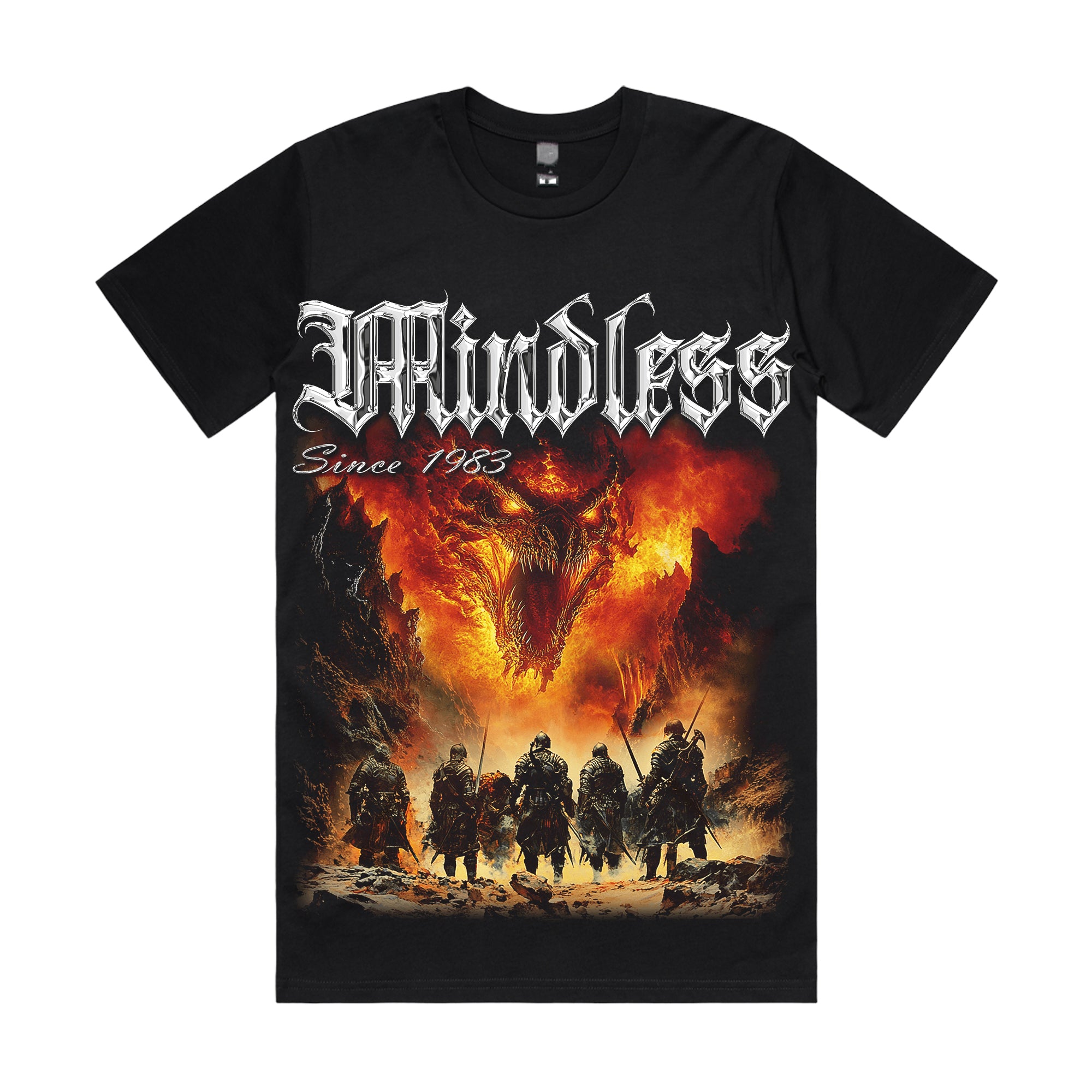 March into the jaws of fire with the "Dragonfire Legion" T-shirt — an explosive tribute to brotherhood, bravery, and the fury of the ancient world. The design captures five armored warriors advancing across a scorched battlefield, beneath the monstrous visage of a fire-breathing dragon erupting from the inferno. Lava cracks the earth. Ash rains from the skies. Doom takes form. Above it all, the bold gothic “Mindless – Since 1983” logo burns like a war cry from the metal gods.