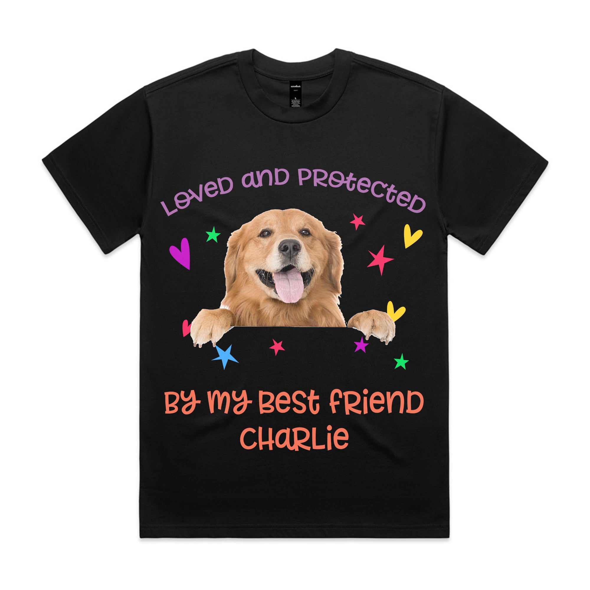 Sweet curved text: “Loved and Protected” on top and “By My Best Friend [Your Dog’s Name]” underneath