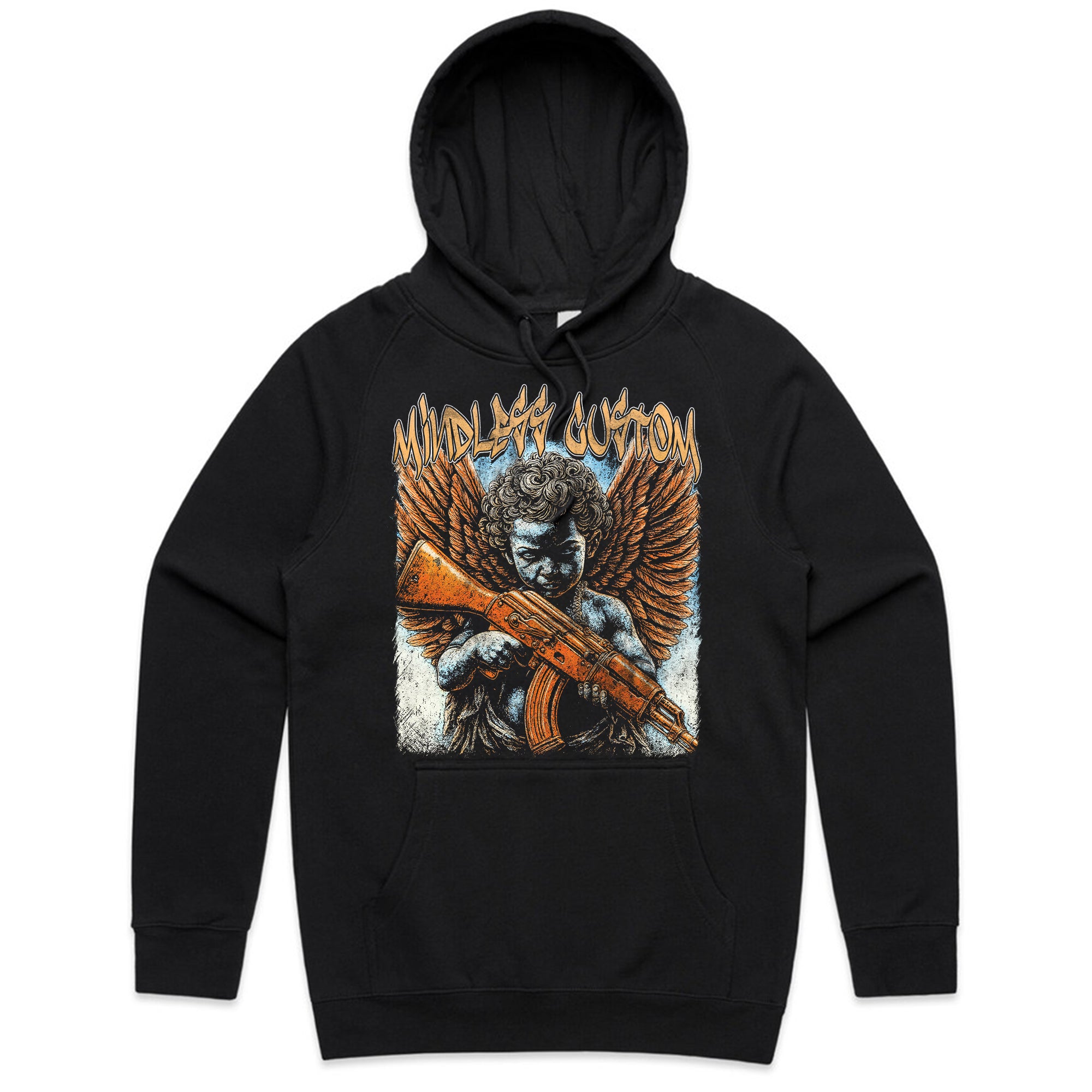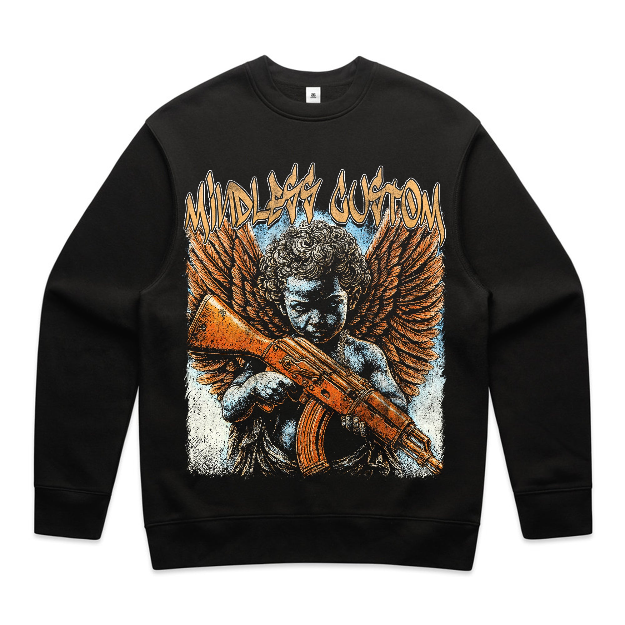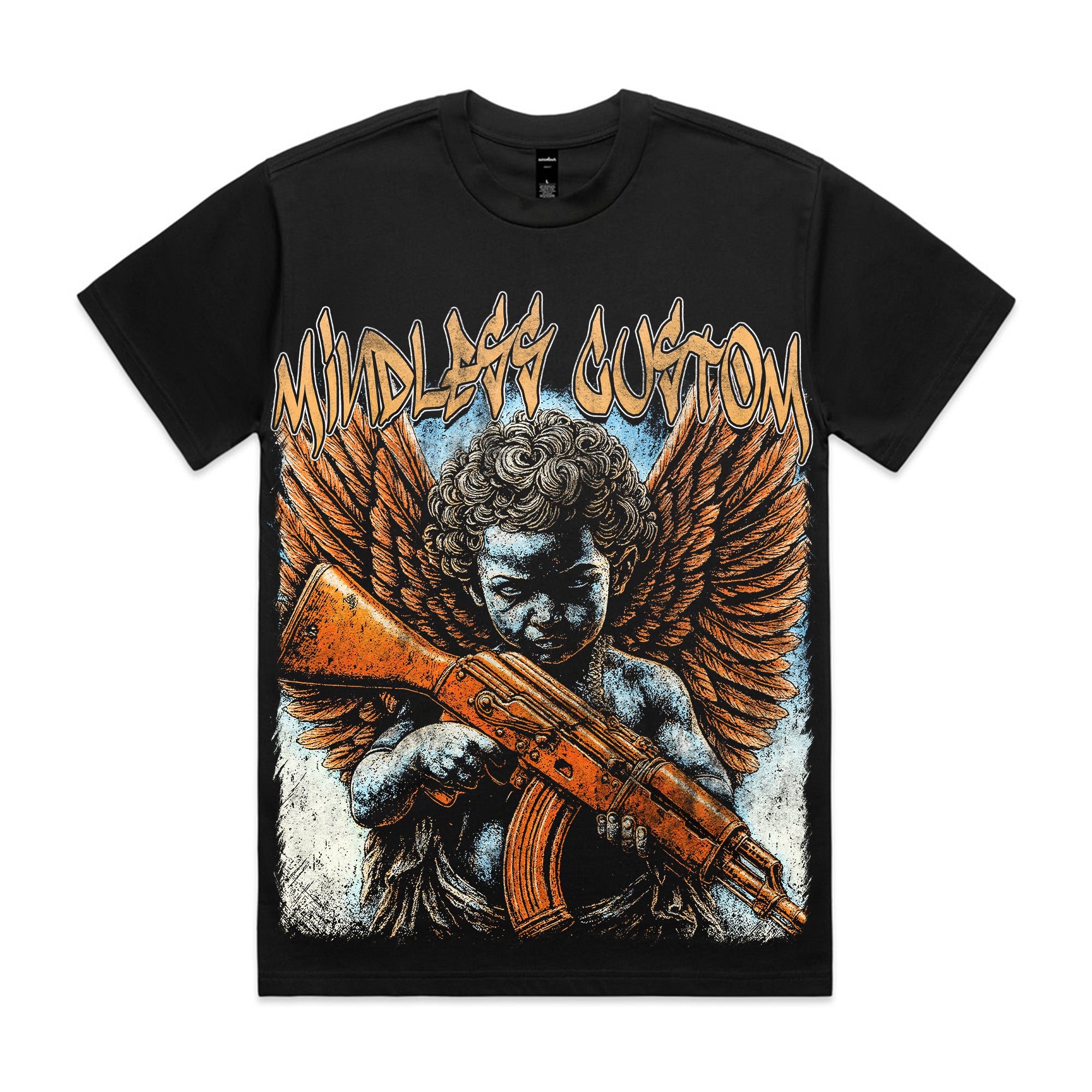 😈👼 When innocence meets rebellion. This striking design features a dark angel gripping an AK, wings spread wide with a gritty edge. The graffiti-style “Mindless Custom” lettering in orange blazes across the top, capturing pure street defiance.