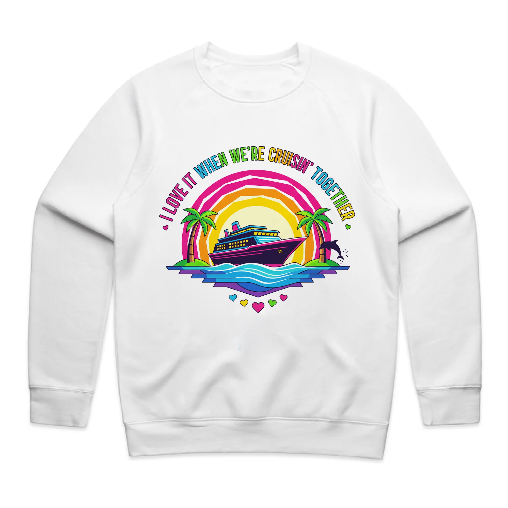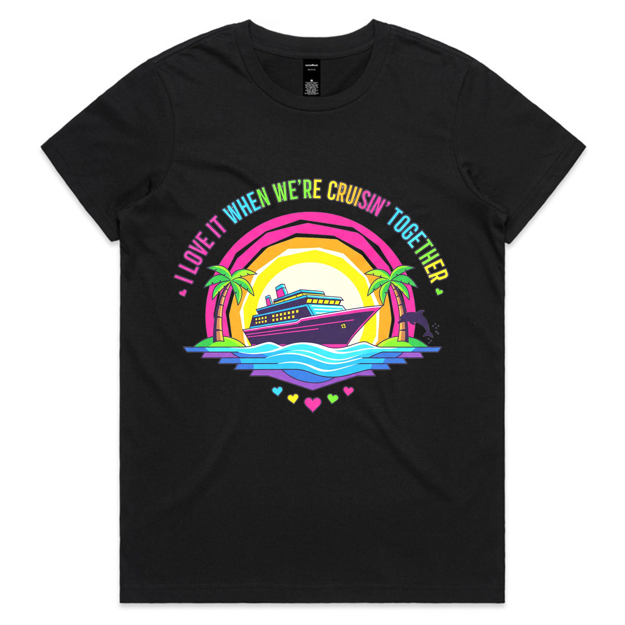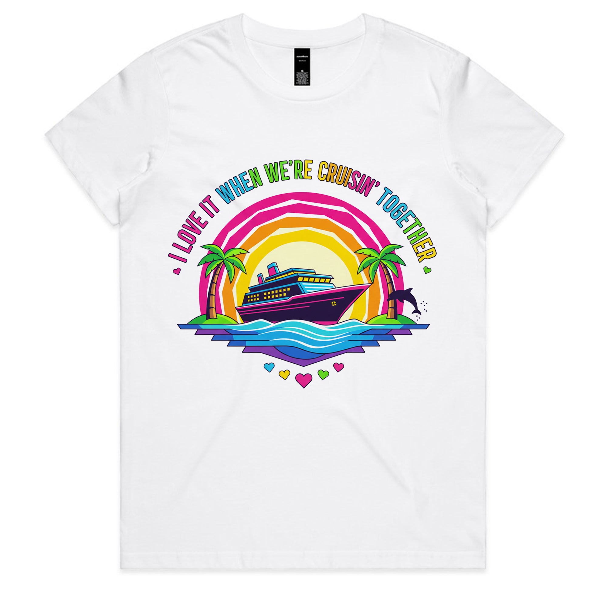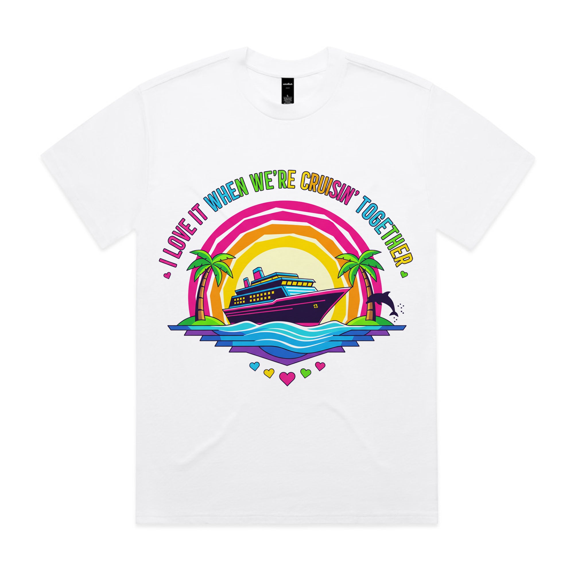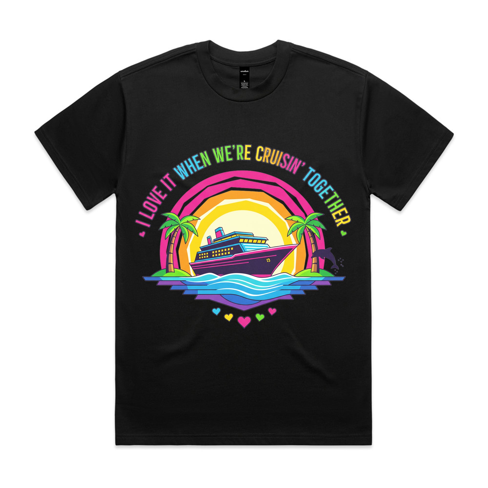 Bright, bold, and full of tropical energy! This fun design features a colorful ship, palm trees, and rainbow tones around a sunset backdrop. A joyful tee for couples, families, or friends who love to cruise — and love being together.
