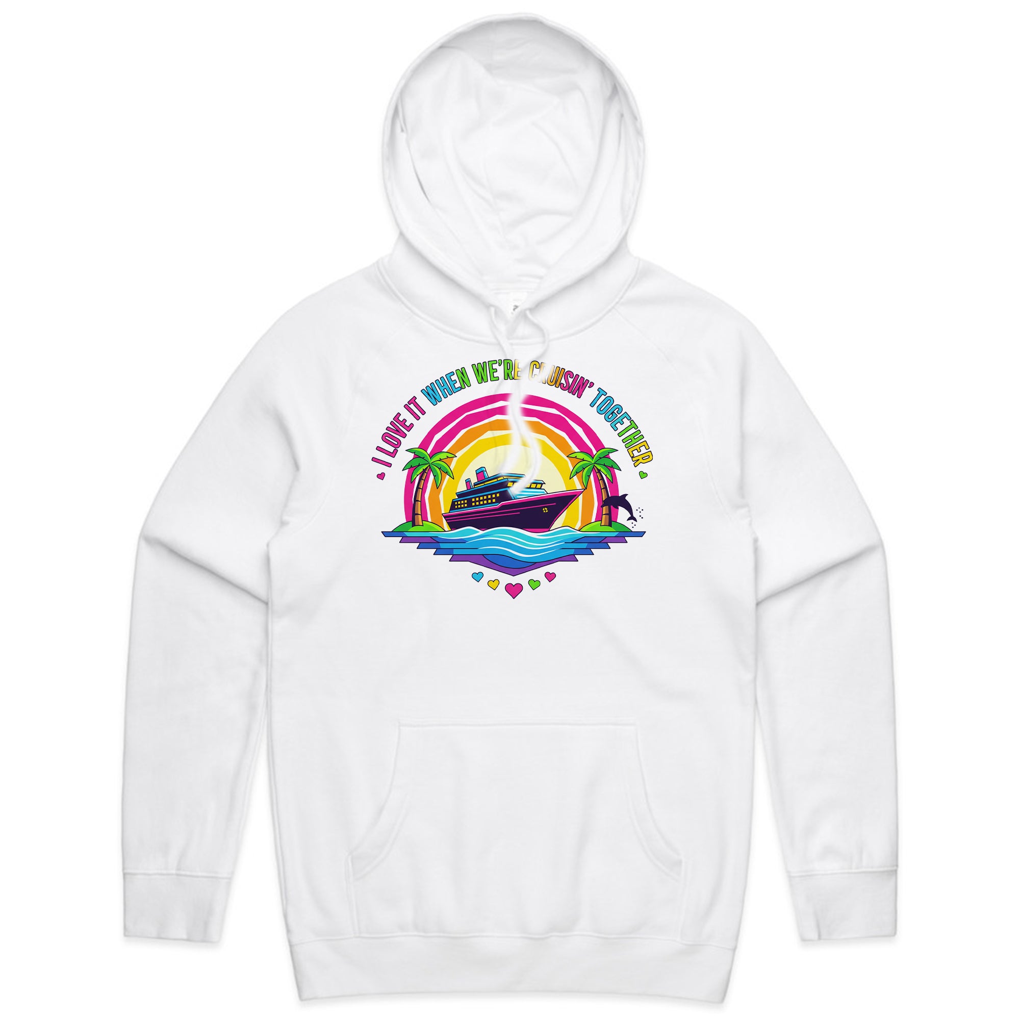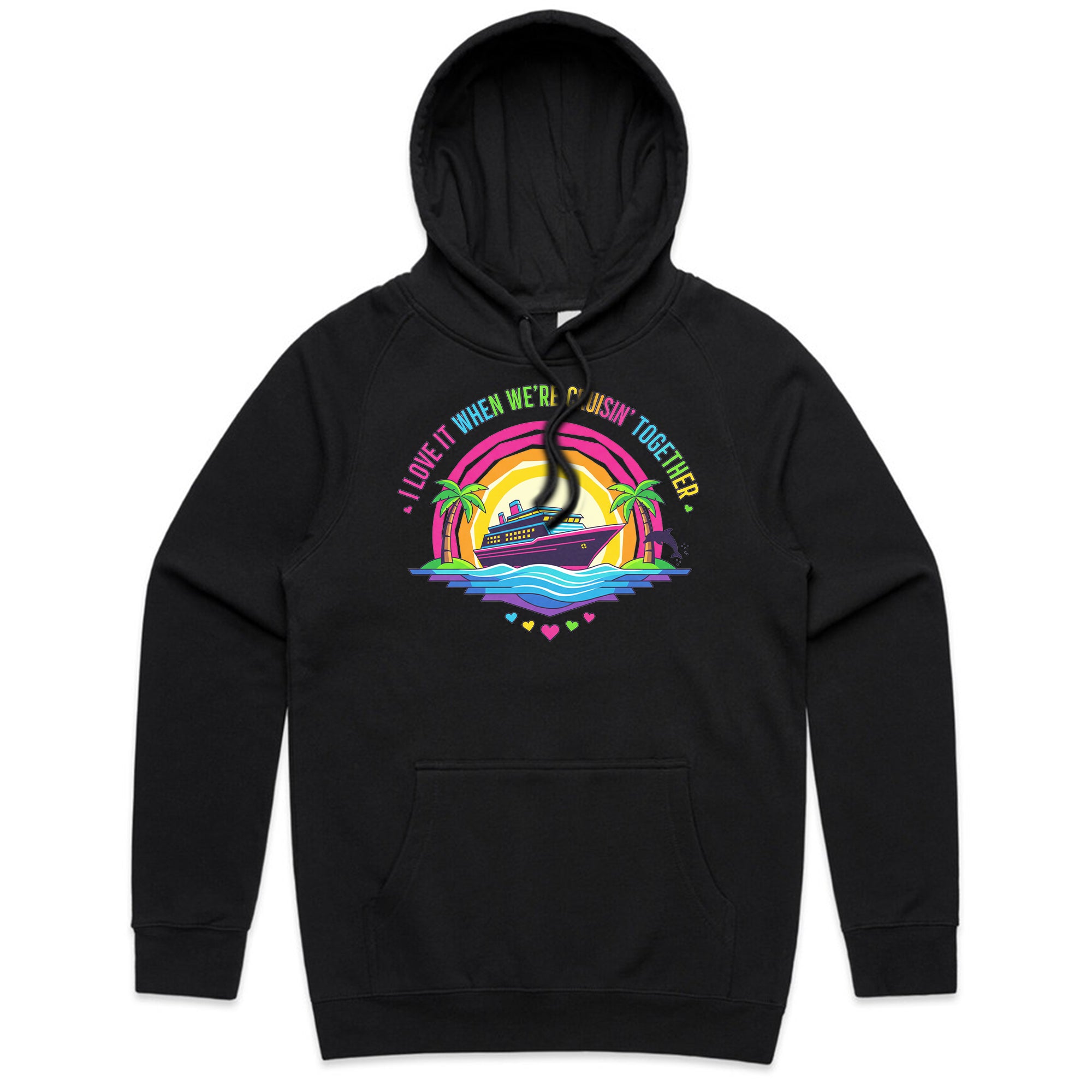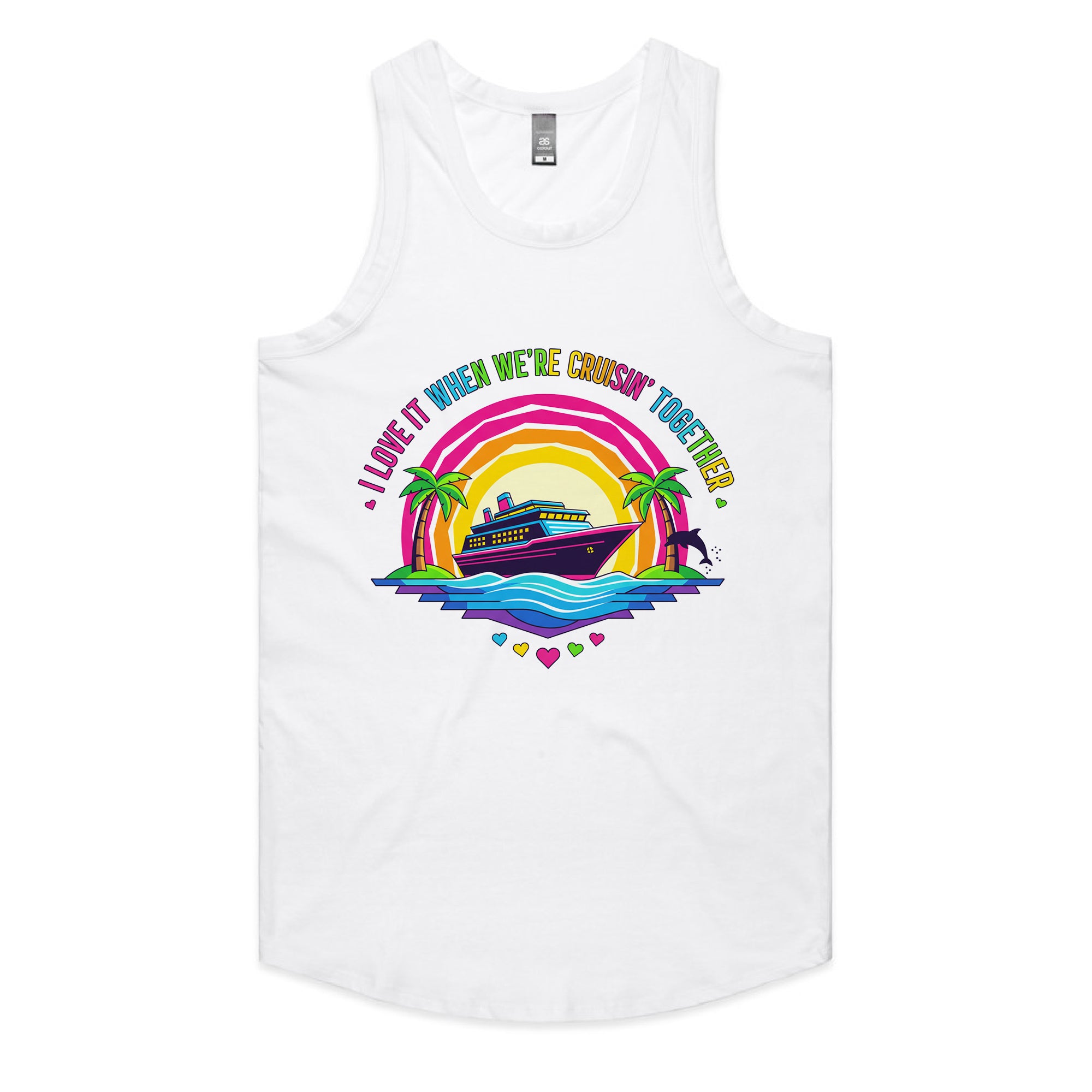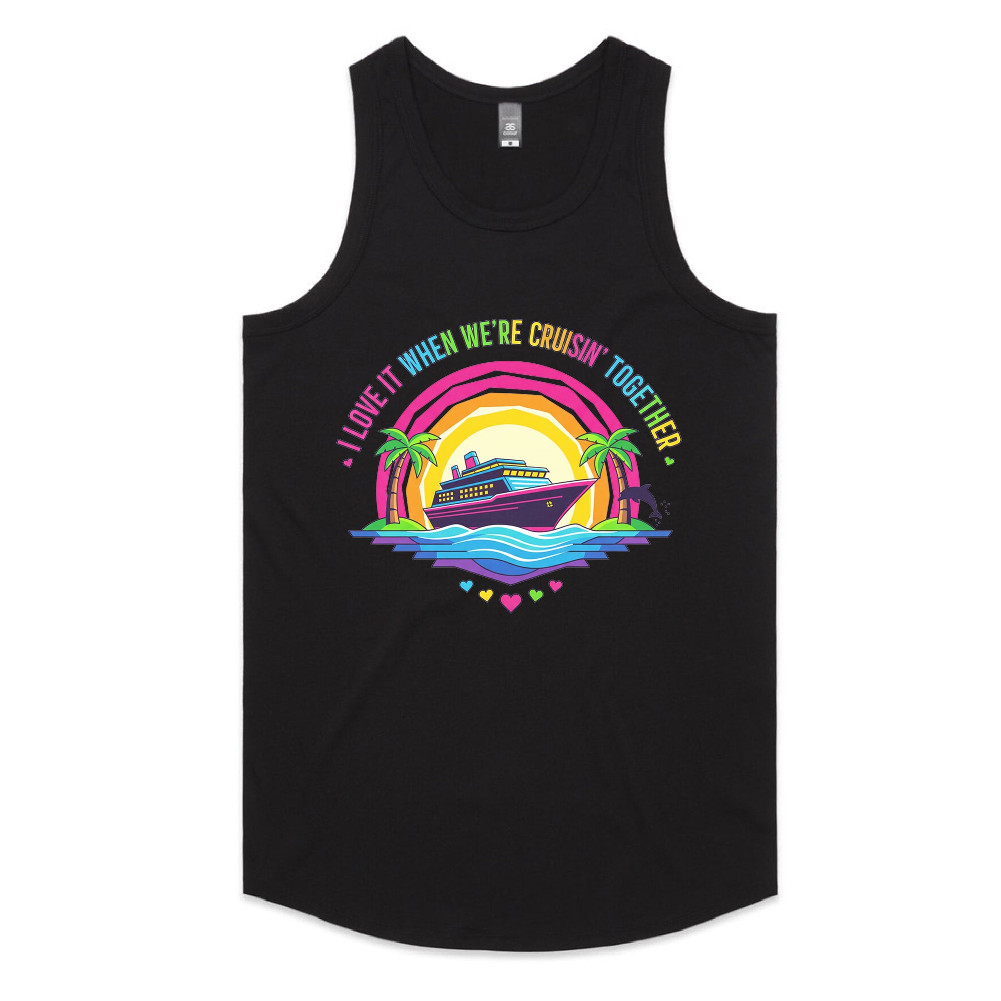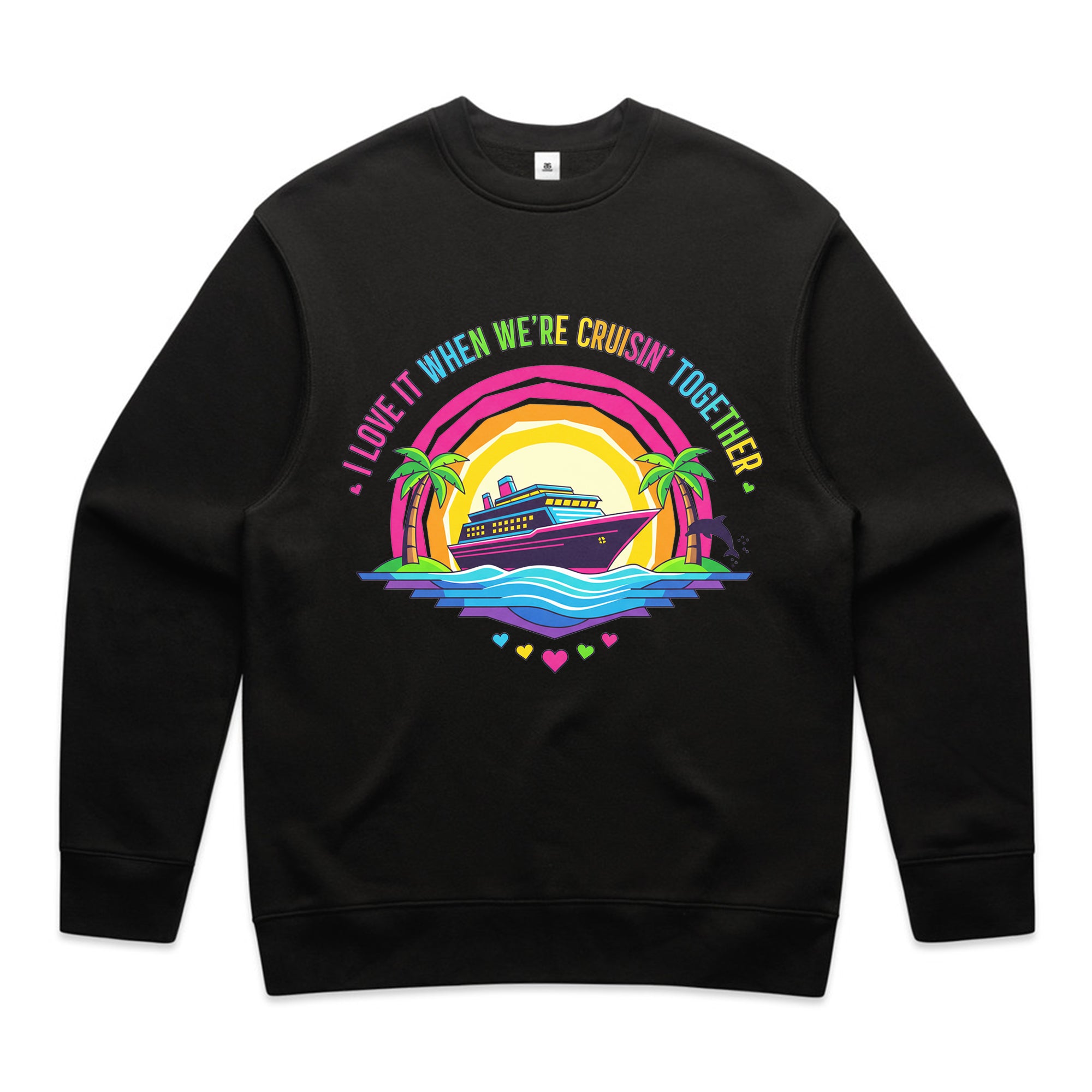 Bright, bold, and full of tropical energy! This fun design features a colorful ship, palm trees, and rainbow tones around a sunset backdrop. A joyful tee for couples, families, or friends who love to cruise — and love being together.