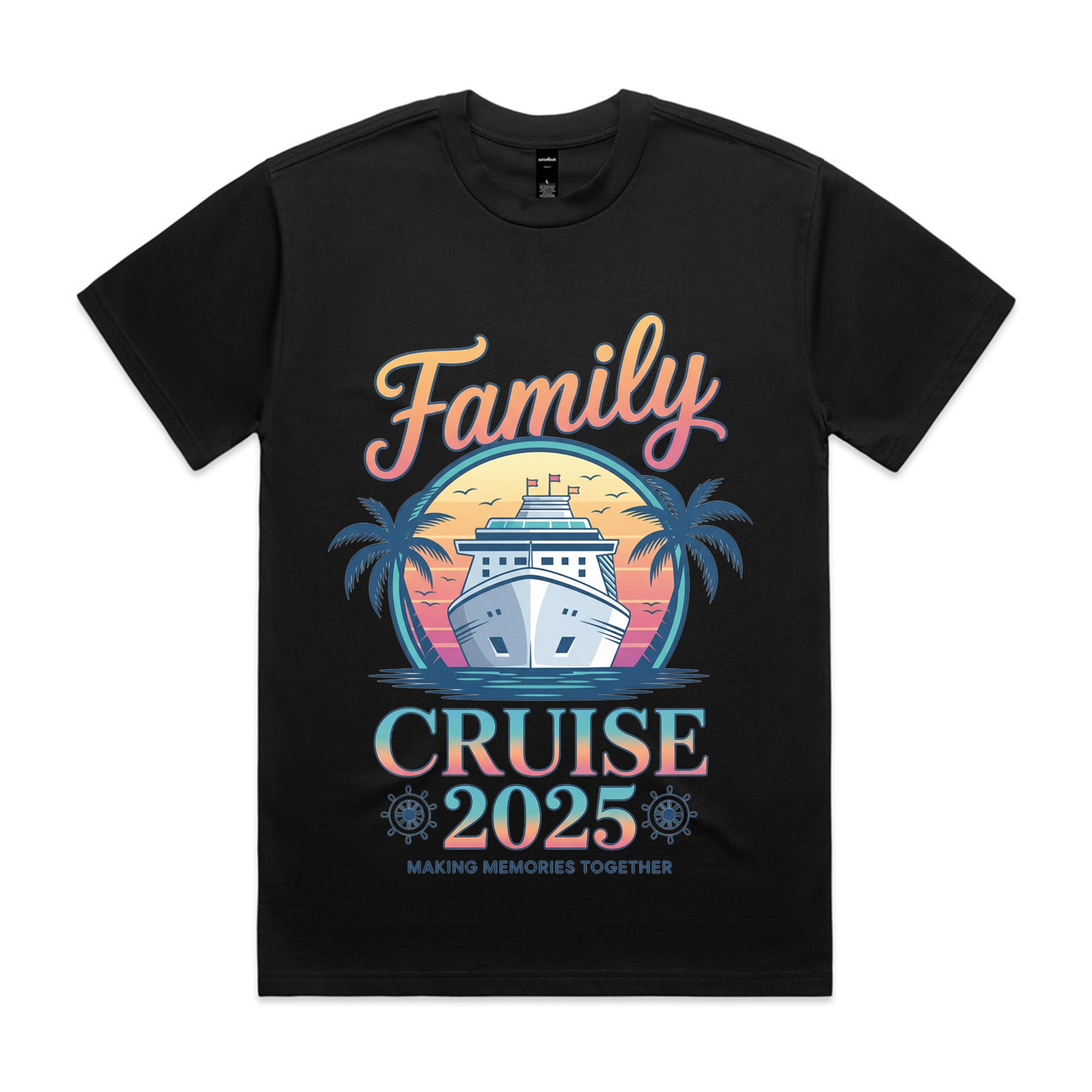Bring everyone together with this colorful family cruise tee. The front design showcases a sleek cruise ship sailing through a pastel sunset with palm trees on each side — a perfect keepsake for your 2025 voyage and family photos.