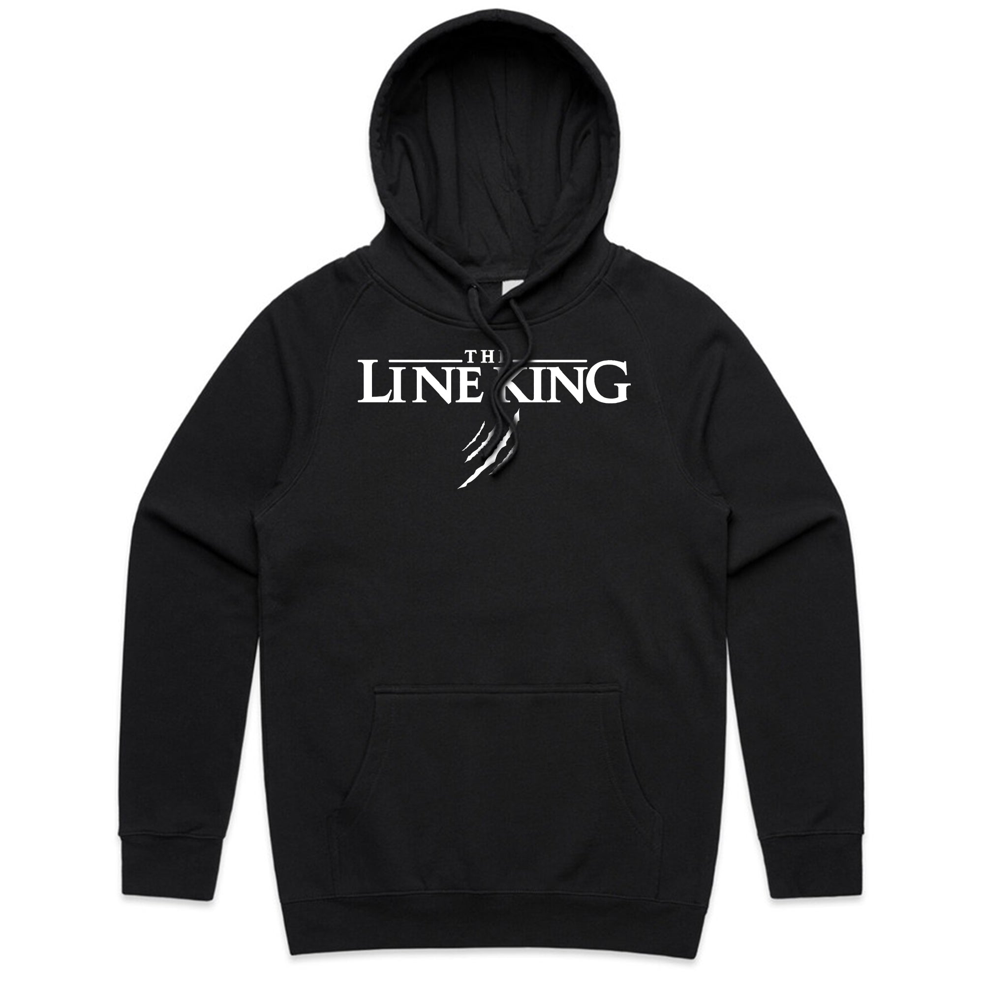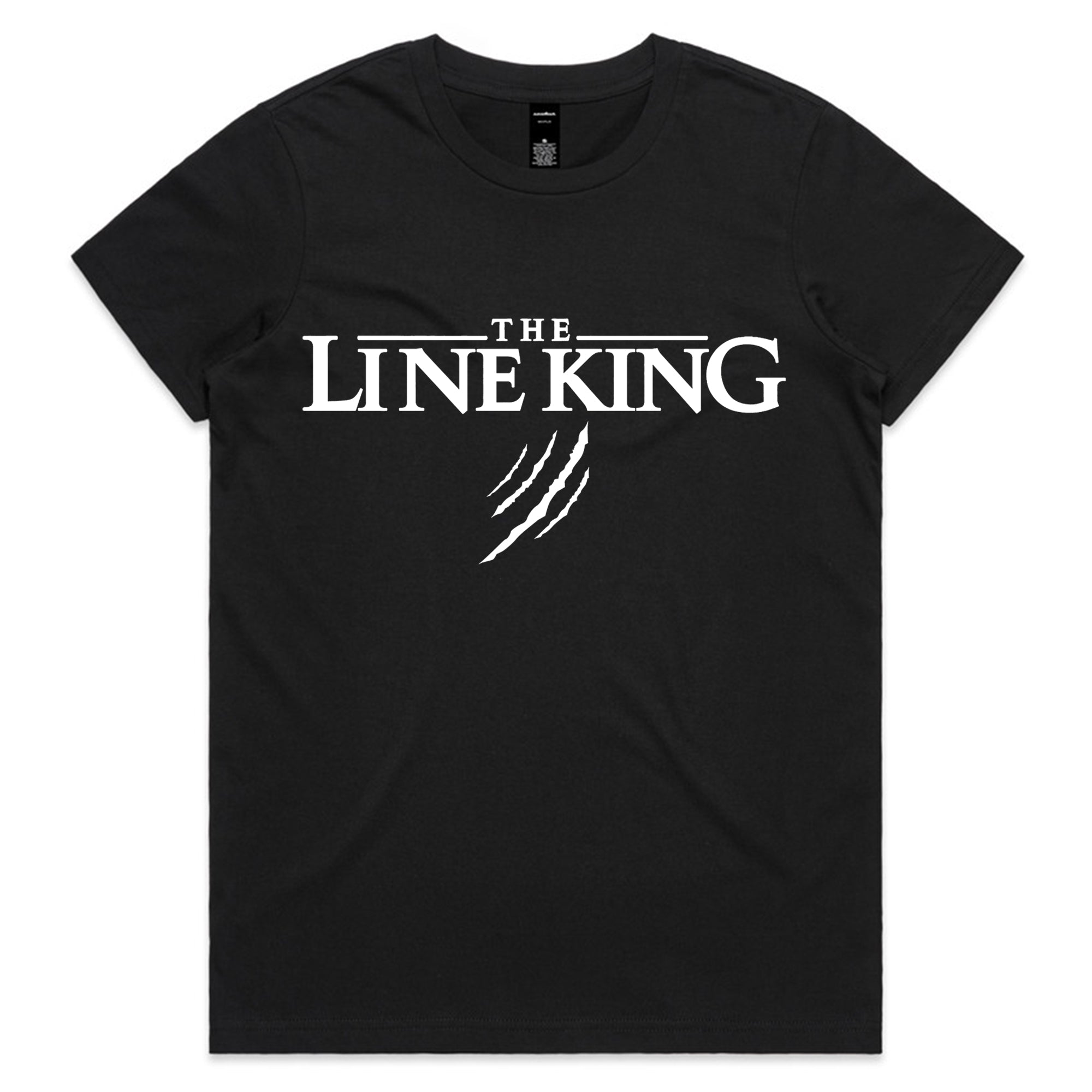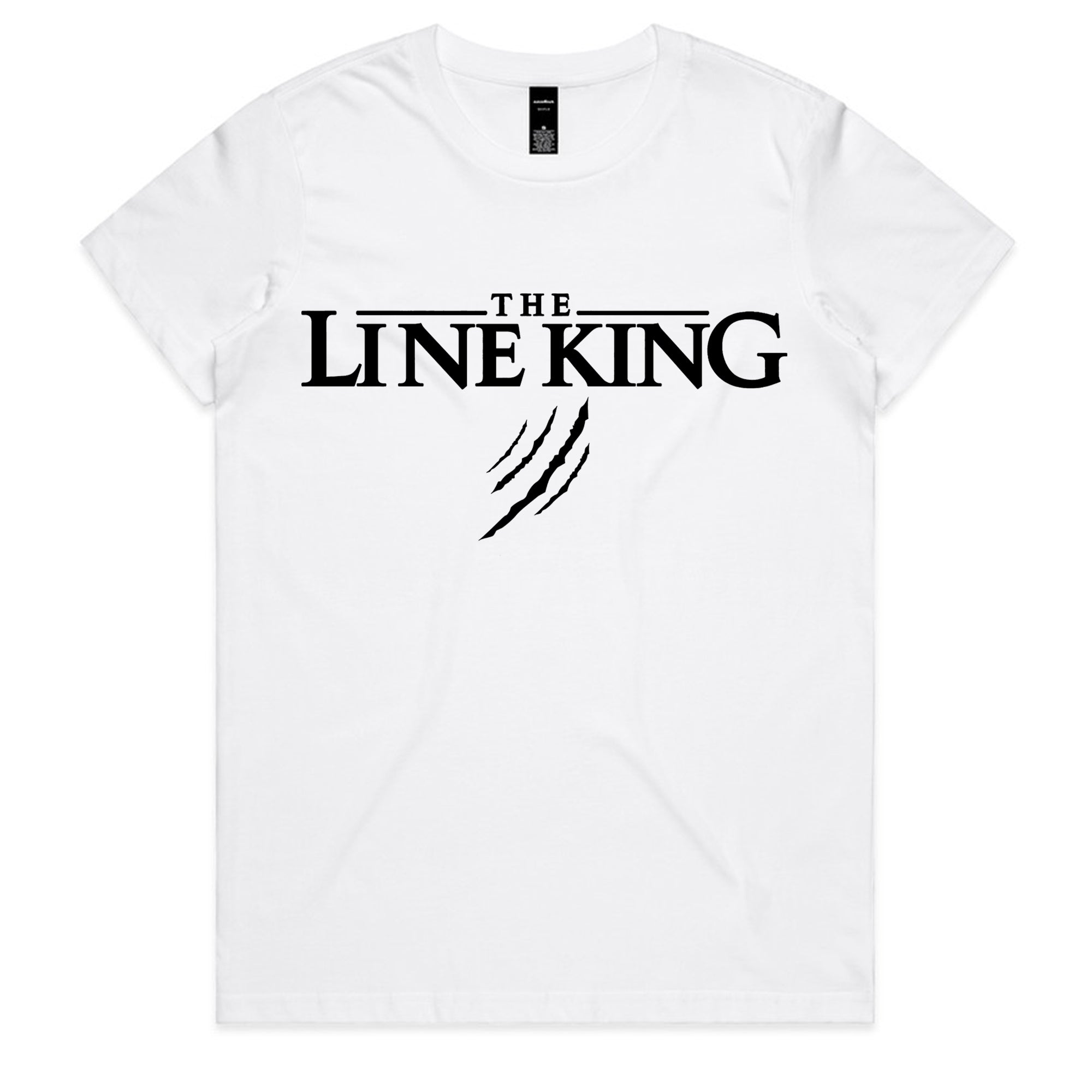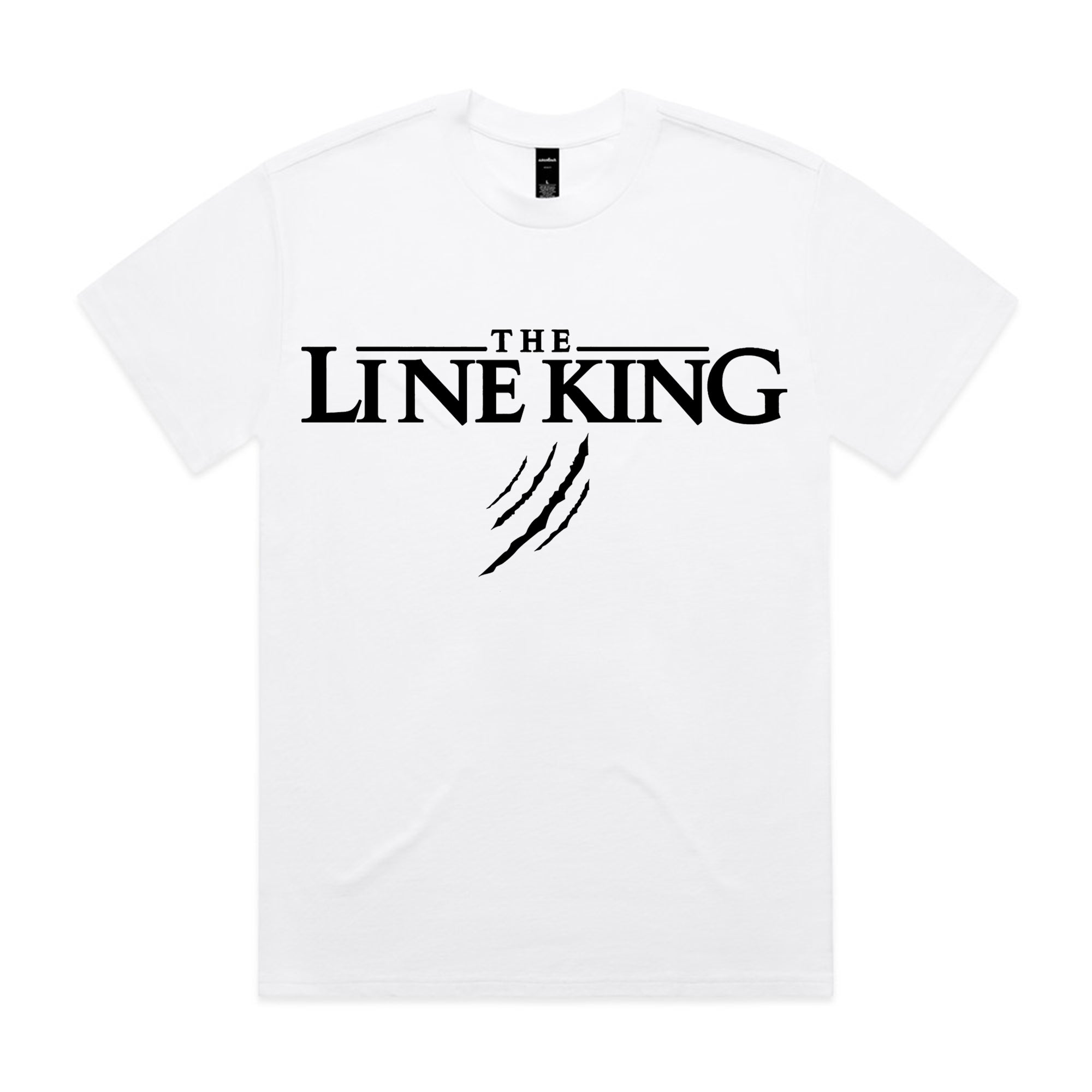 A simple yet striking design parodying a famous movie logo, with the words “The Line King” and claw mark graphics below. The minimal white-on-black print gives it a sleek, iconic look.