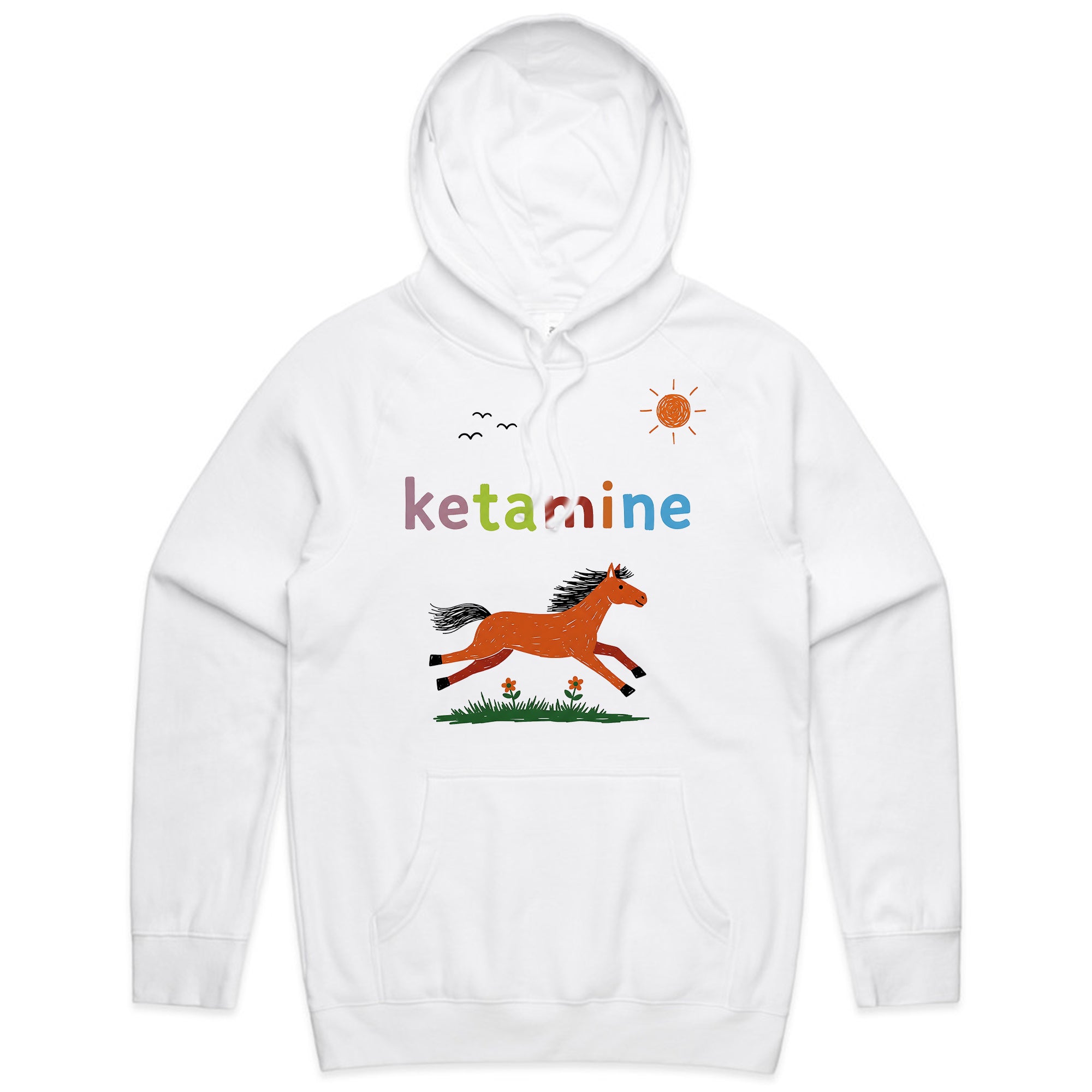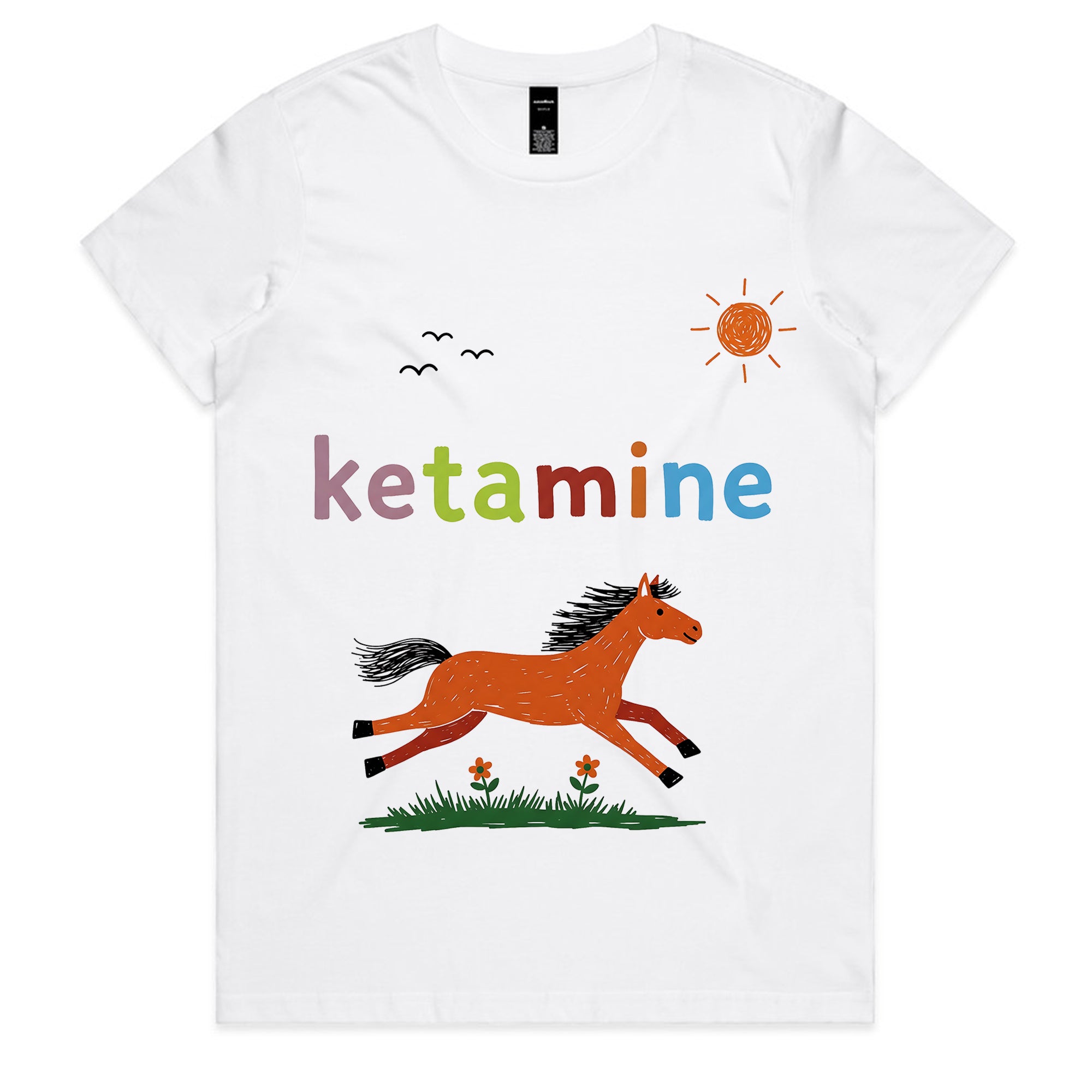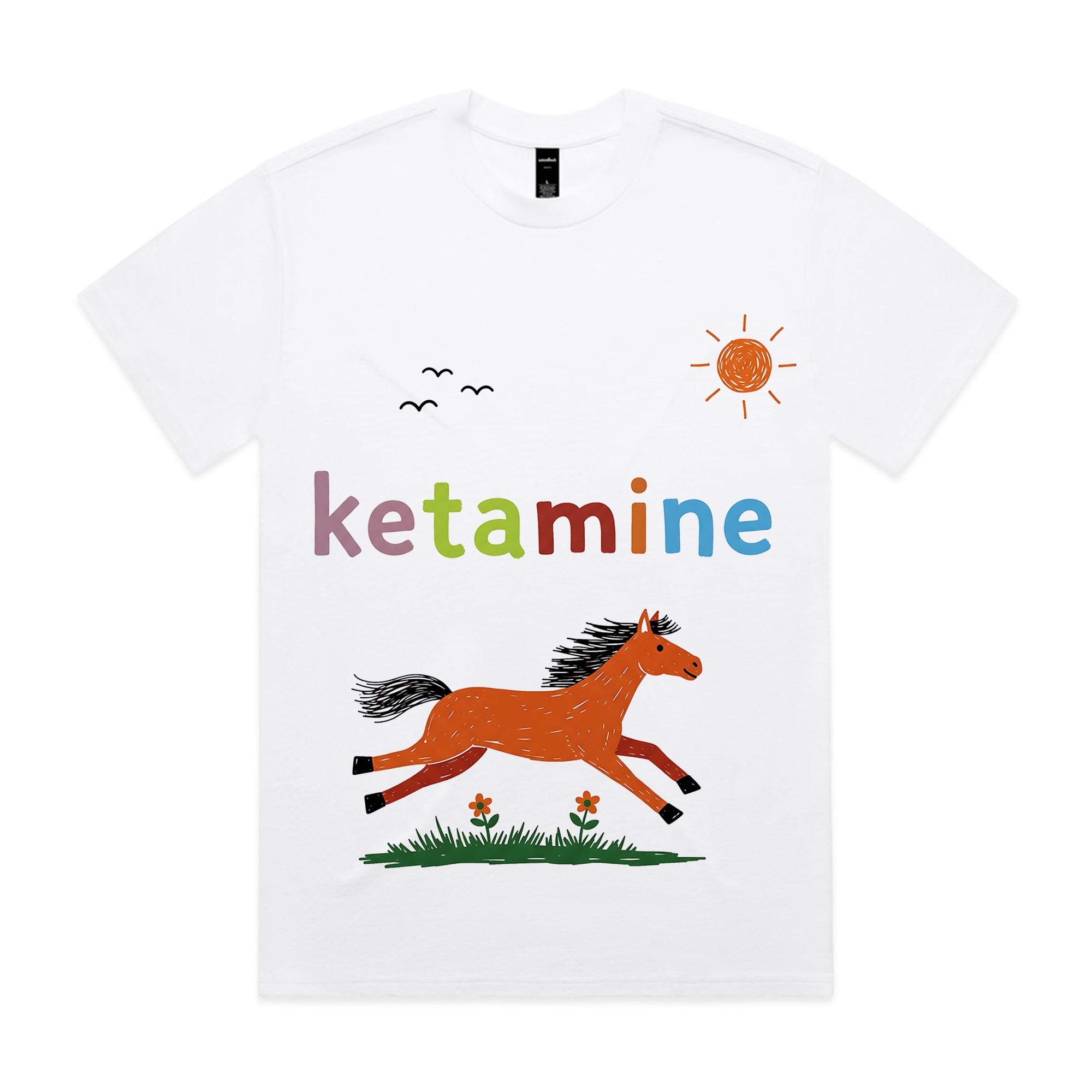 This white T-shirt features a colorful, childlike drawing of a horse galloping under a sunny sky, with the word “ketamine” written in rainbow letters above. The playful, innocent art style contrasts with the adult humor of the text, giving it a quirky and ironic edge.