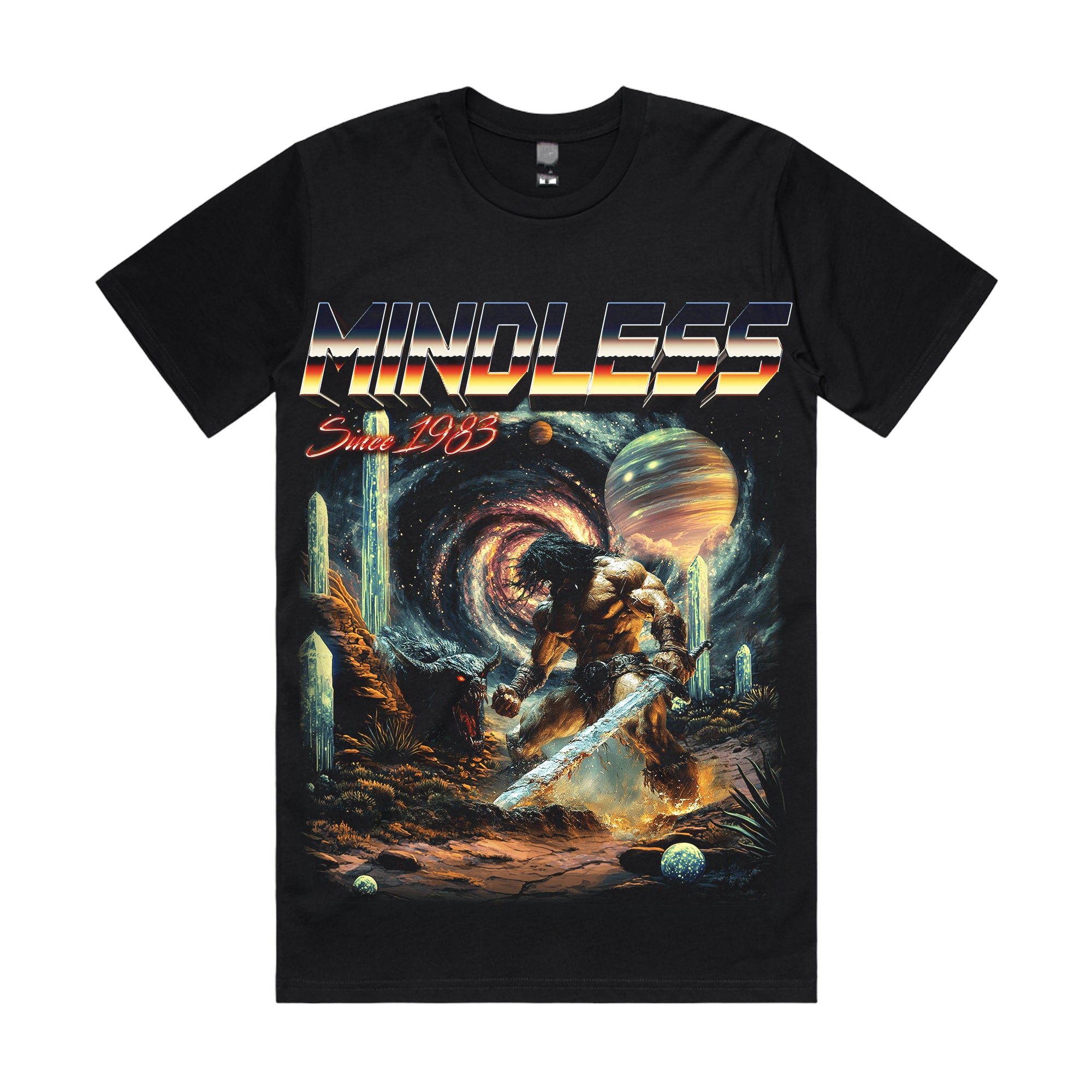 Unleash primal strength across the stars with the "Galactic Barbarian" T-shirt — where sword and stardust collide. This cosmic-fantasy design captures a muscle-bound warrior locked in battle with a space-beast, framed by glowing crystals, planetary rings, and a spiraling galaxy behind. The scorching terrain crackles beneath his feet, while distant planets rise like gods in the sky. The vintage "Mindless – Since 1983" logo, styled in bold 80s chrome-fade gradient, completes this retro-futurist war cry.