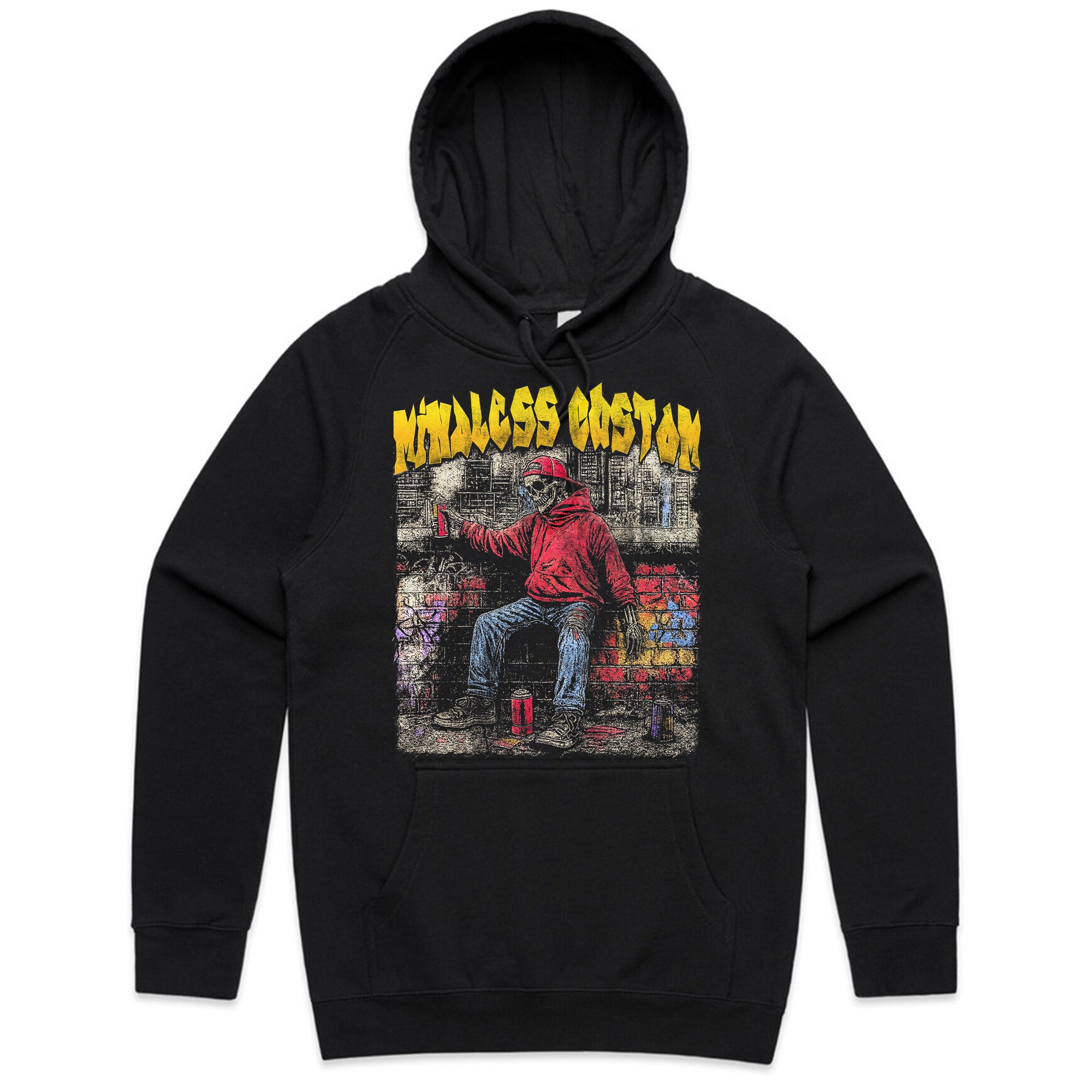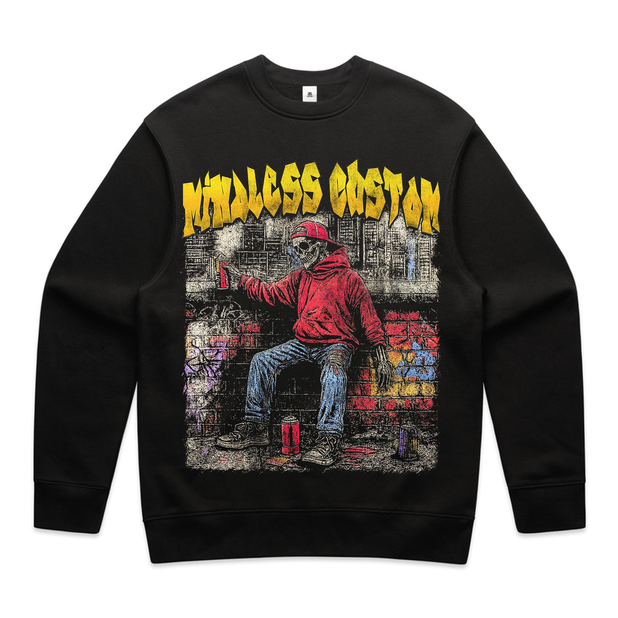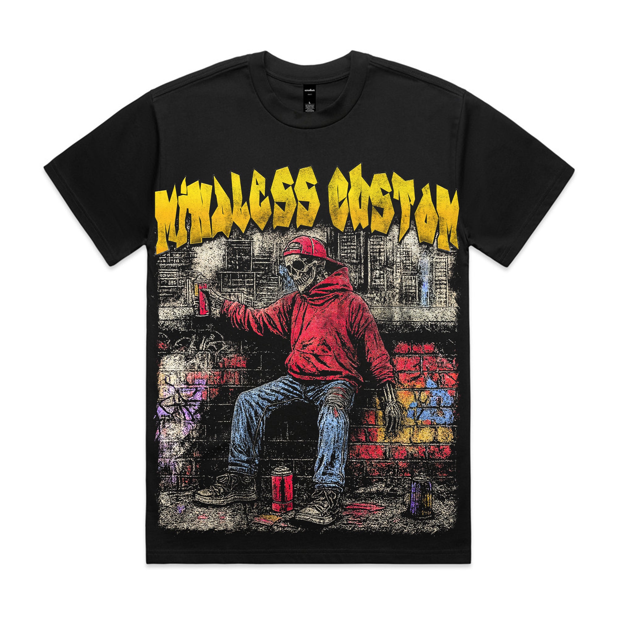 Own the streets with this bold graffiti-inspired design. Featuring a skeleton in a red hoodie spray-painting against a gritty wall, this tee captures the essence of underground art and raw rebellion. The bold yellow “Mindless Custom” lettering explodes across the top, cementing its fearless street identity.