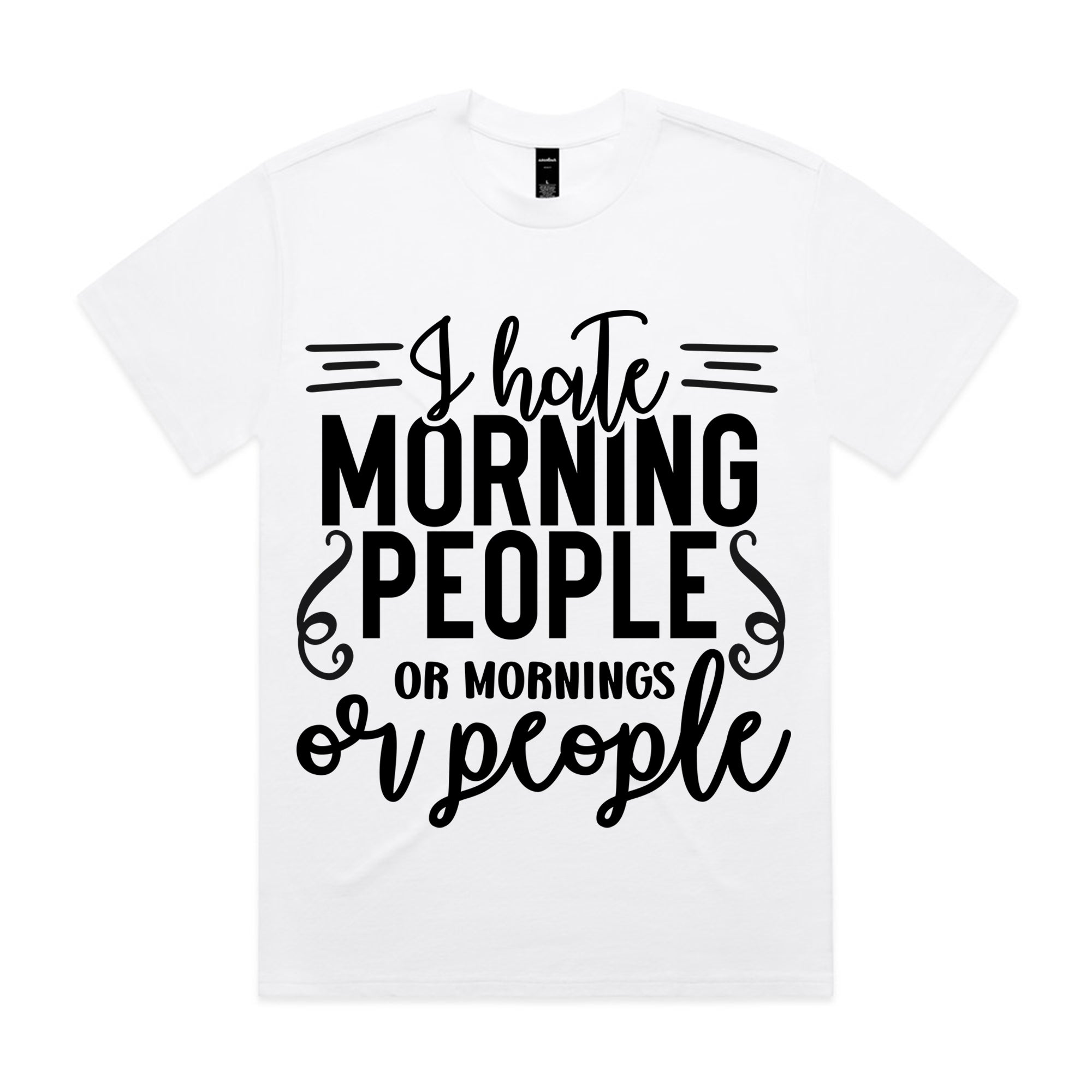 If mornings aren’t your thing, this tee was made for you! With the bold and witty phrase “I Hate Morning People or Mornings or People”, this shirt perfectly captures the mood of every night owl and coffee-first kind of person.