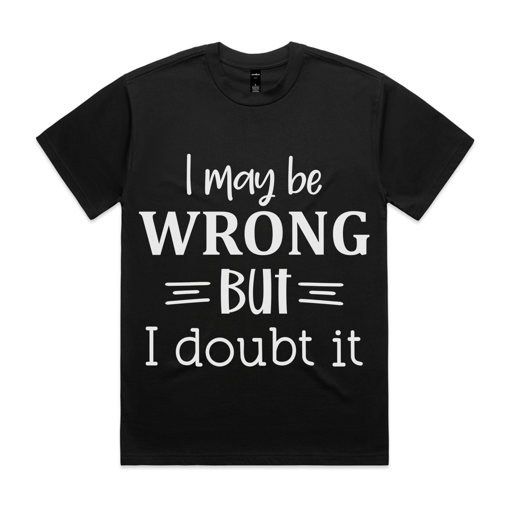 Bring out your confident (and slightly sarcastic) side with this bold graphic tee! Featuring the cheeky phrase “I May Be Wrong, But I Doubt It”, this shirt is perfect for anyone who loves a good laugh and isn’t afraid to show off their self-assured attitude.