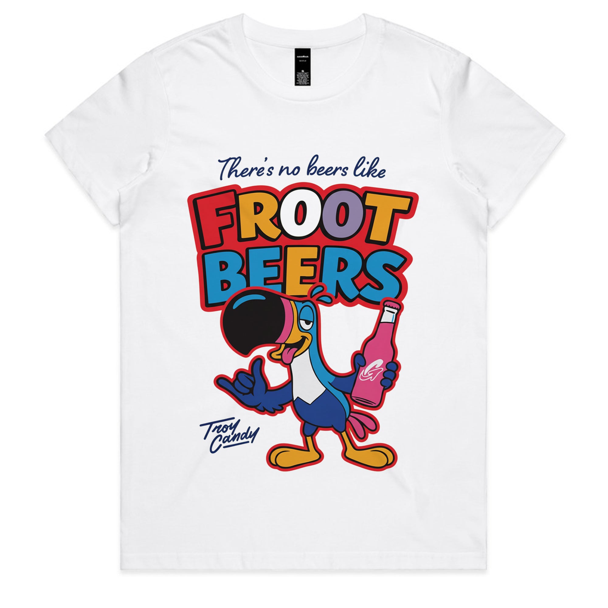 A vibrant, 90s-cartoon style graphic featuring a toucan character holding a pink bottle. The text reads "There's no beers like FROOT BEERS" in a mix of playful fonts and primary colors.