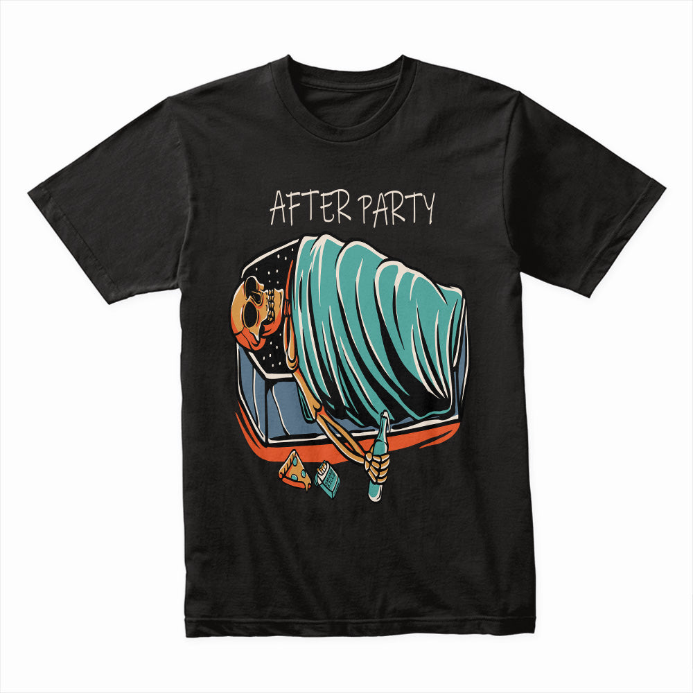 Embrace the ultimate crash with this hilarious and oddly relatable tee. Featuring a skeleton passed out in bed with a slice of pizza, a bottle, and a pack of cigarettes, this design captures the vibe of the wildest parties—dead or alive.