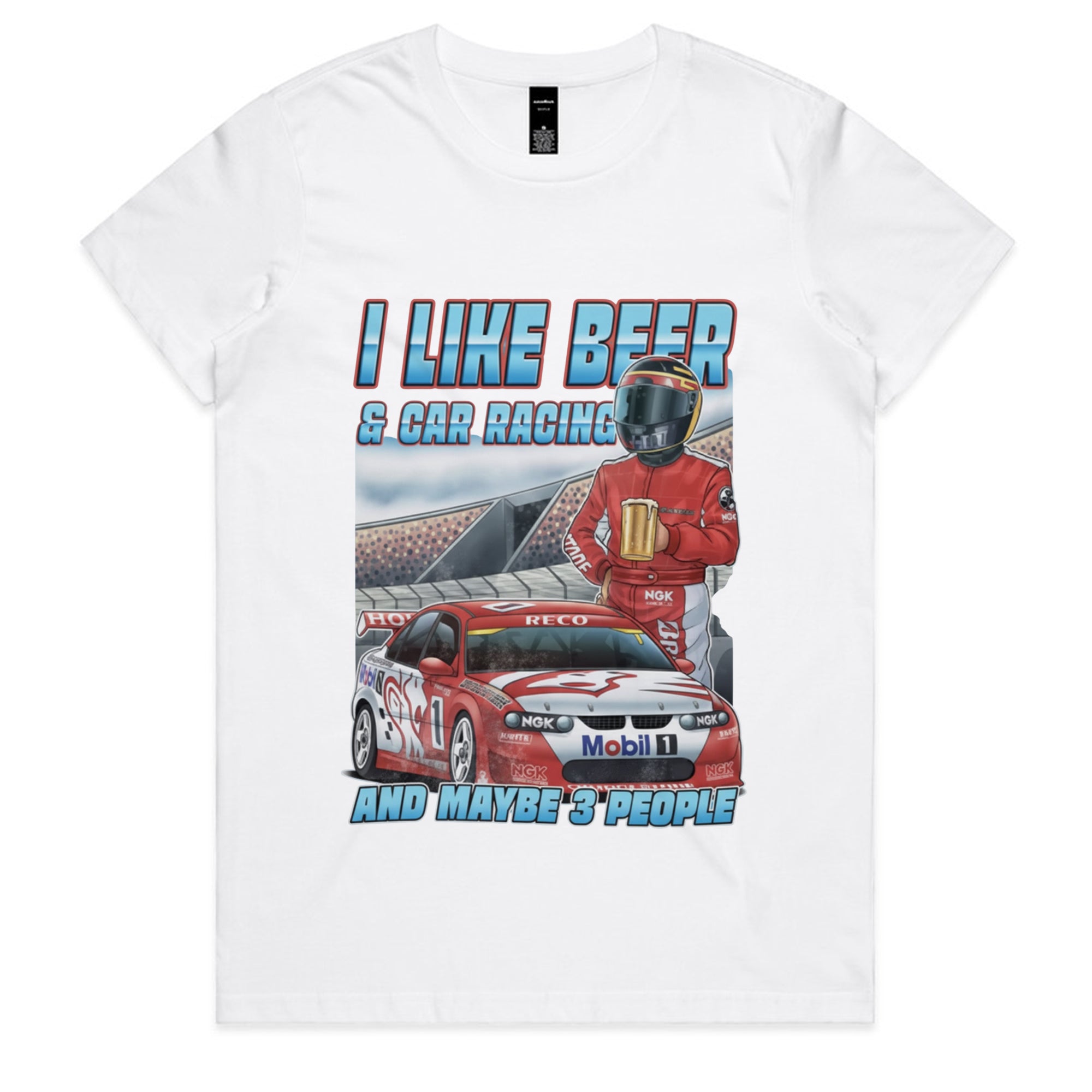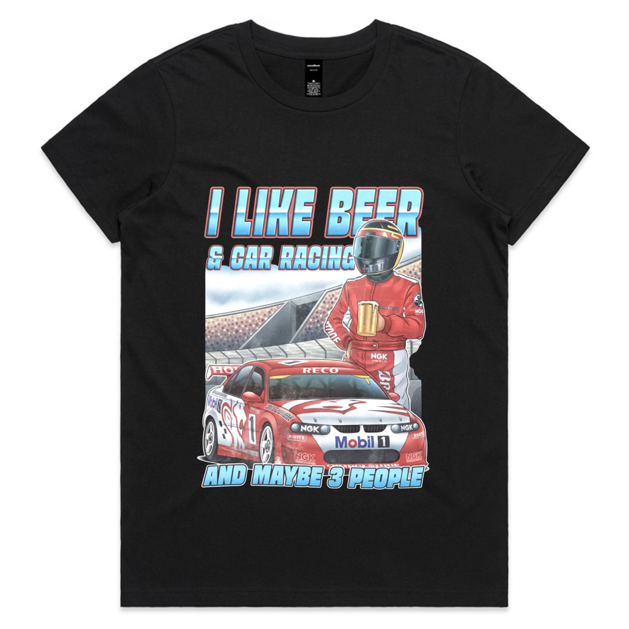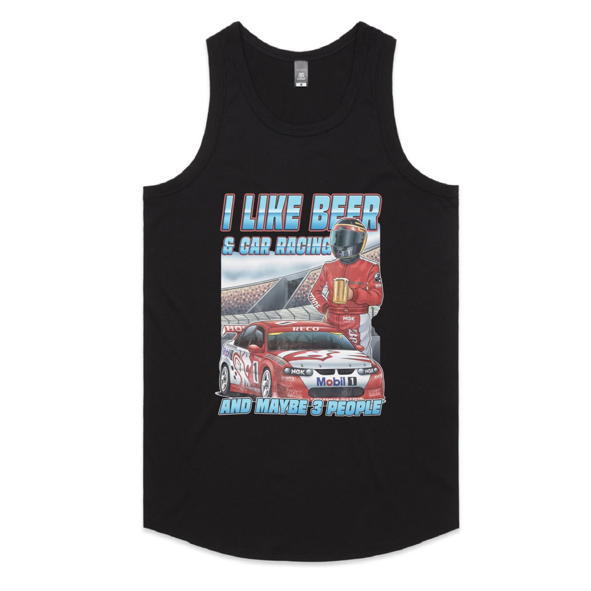 A black tank top featuring a detailed illustration of a red and white race car (number 1) on a track, with a driver in a red suit and helmet holding a frothy mug of beer.