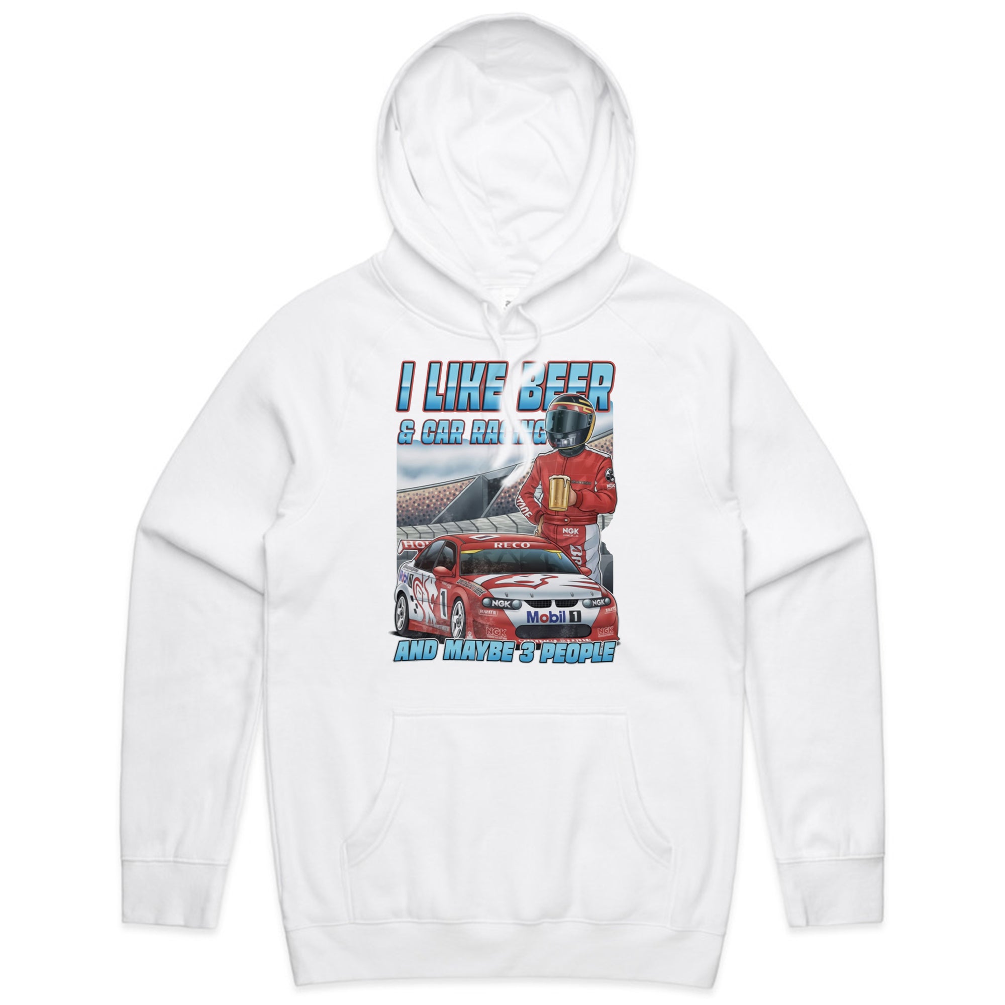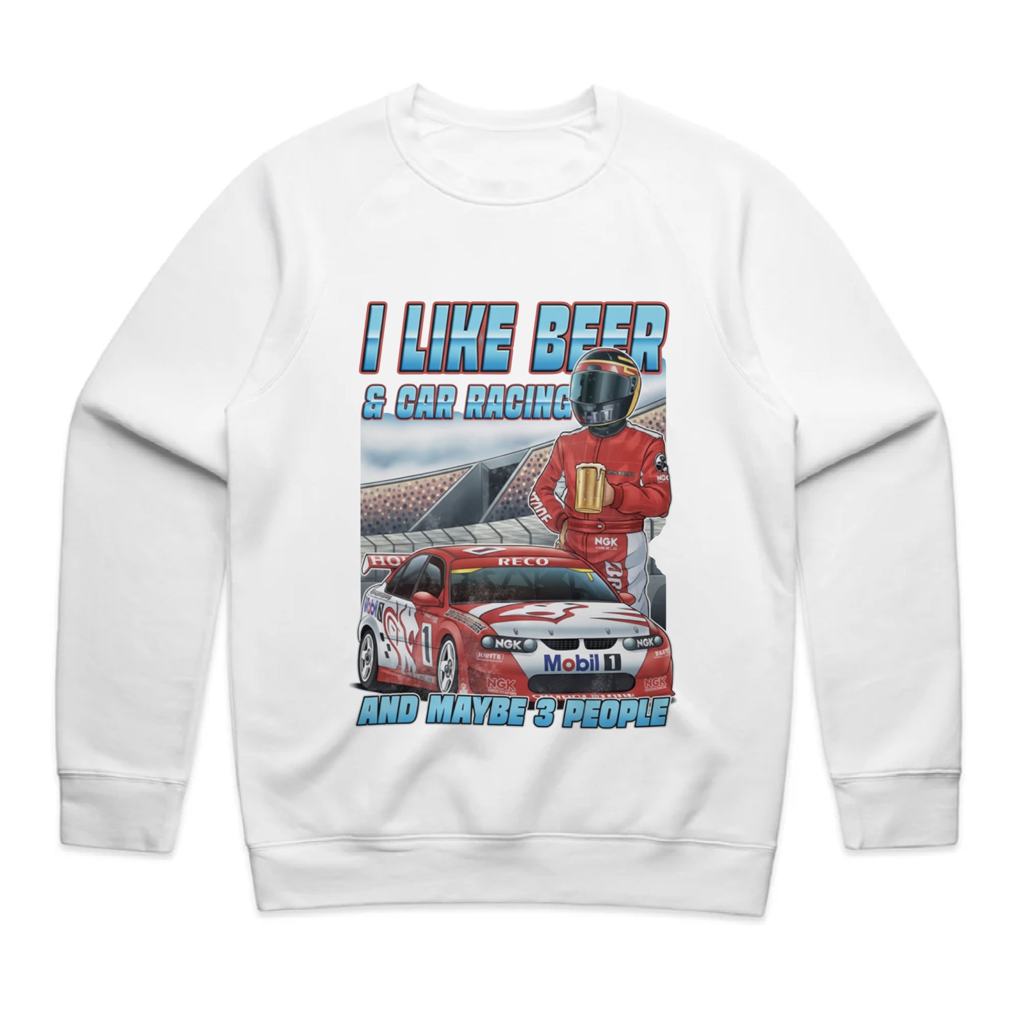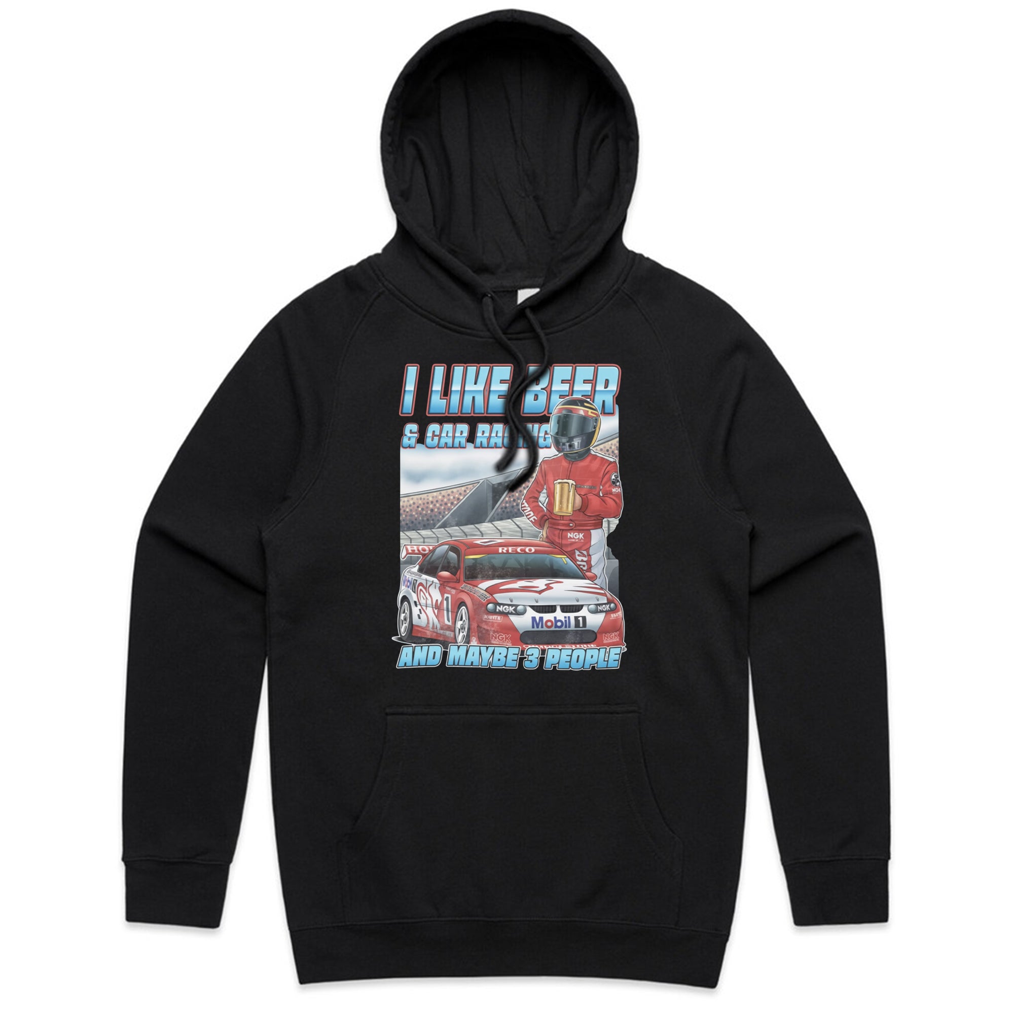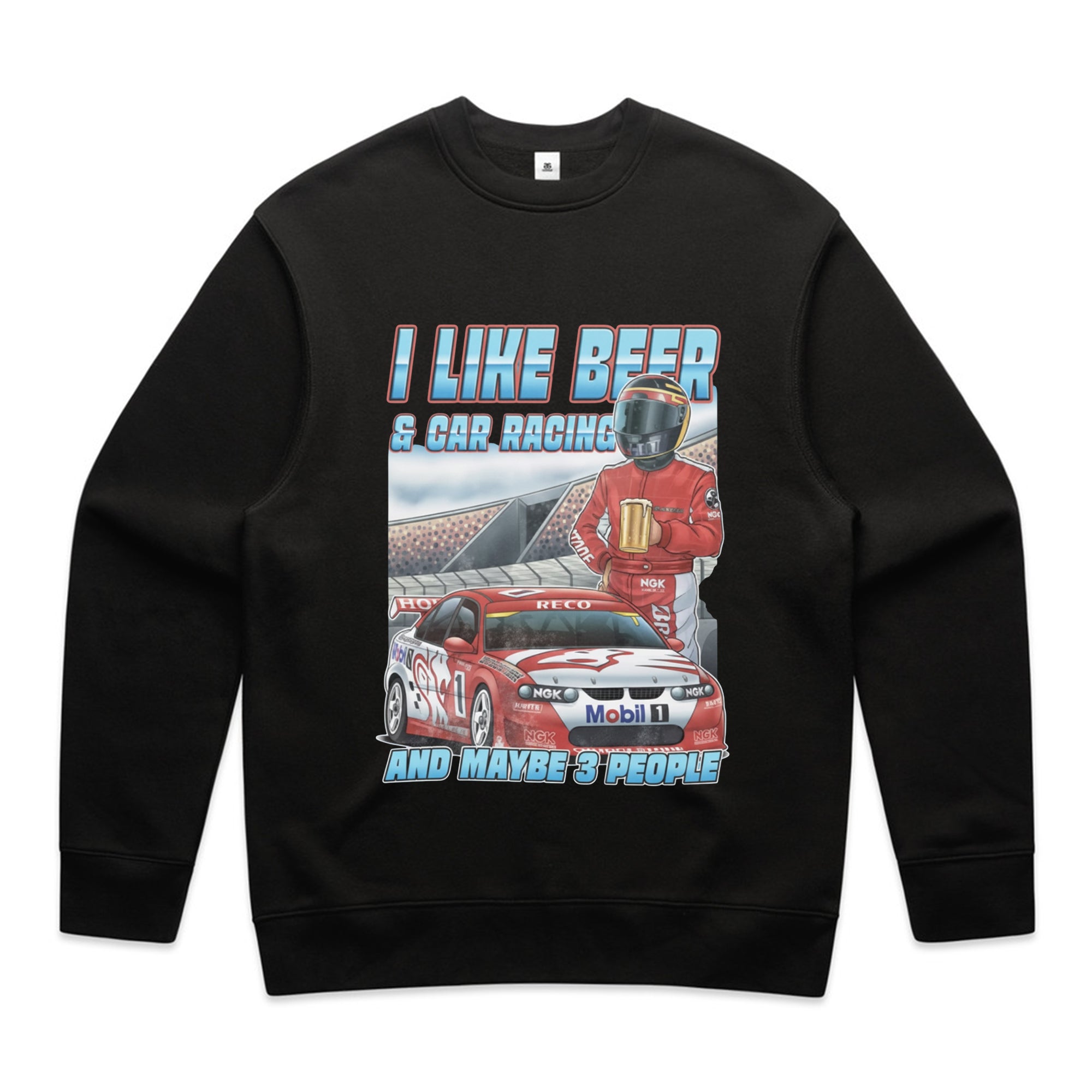 A black tank top featuring a detailed illustration of a red and white race car (number 1) on a track, with a driver in a red suit and helmet holding a frothy mug of beer.