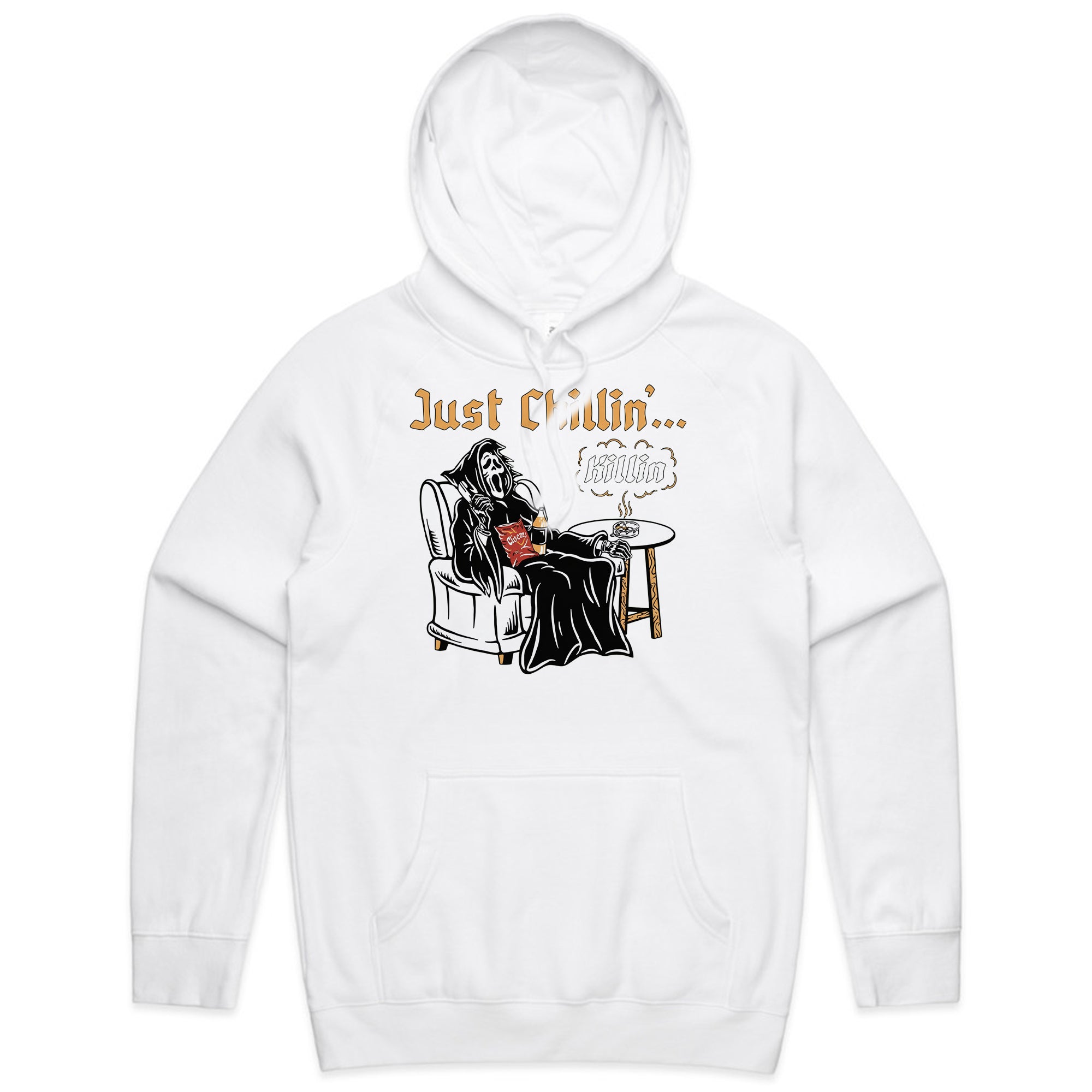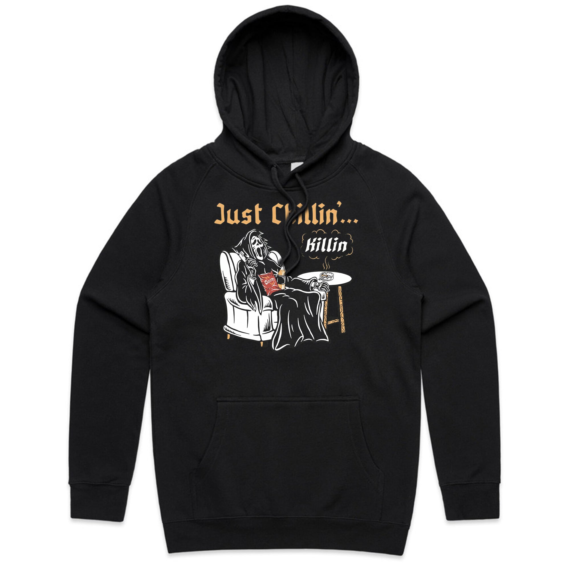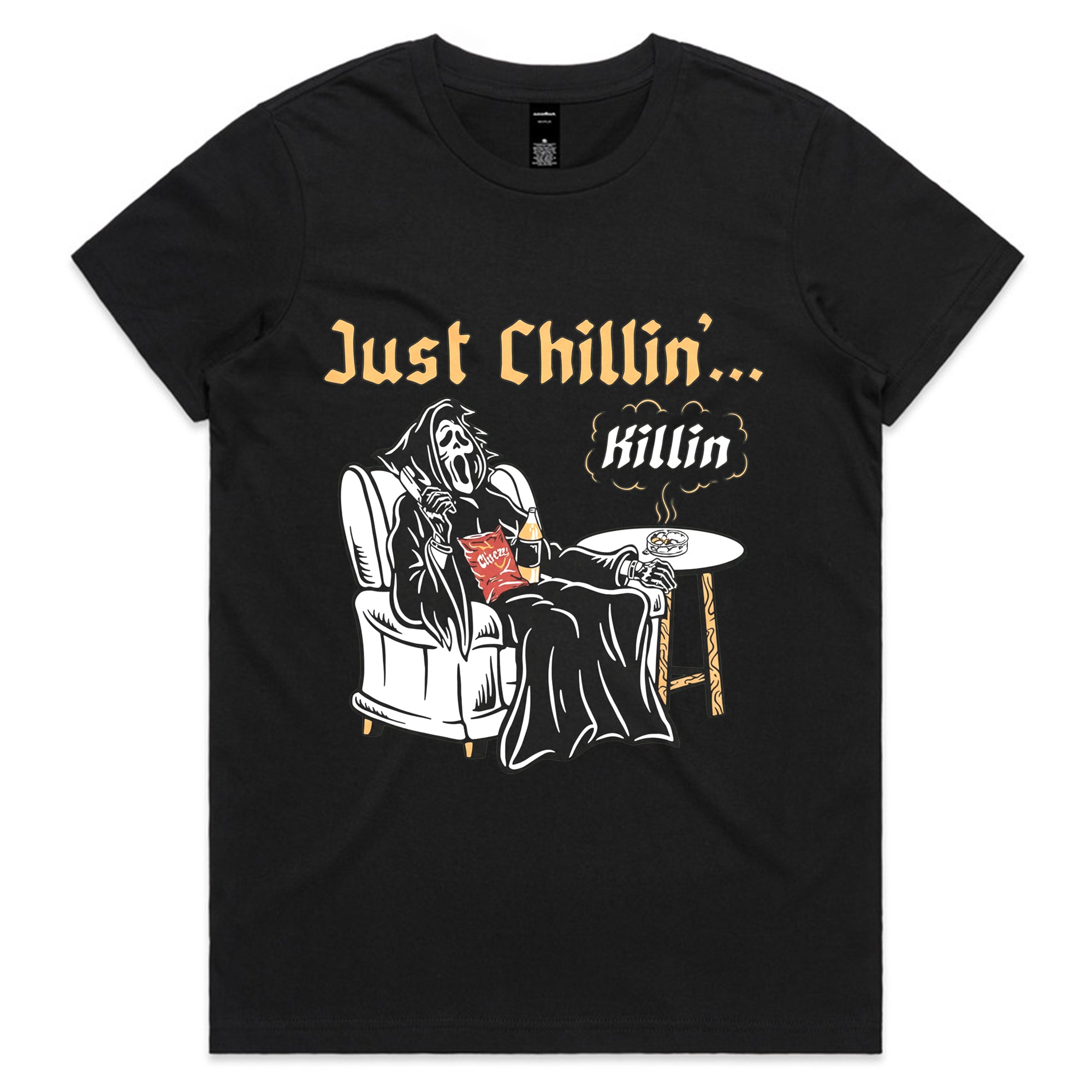 A black T-shirt featuring the Ghostface killer from the movie Scream relaxing in an armchair, holding a phone, a bottle of beer, and a bag of "Cheese" snacks.
