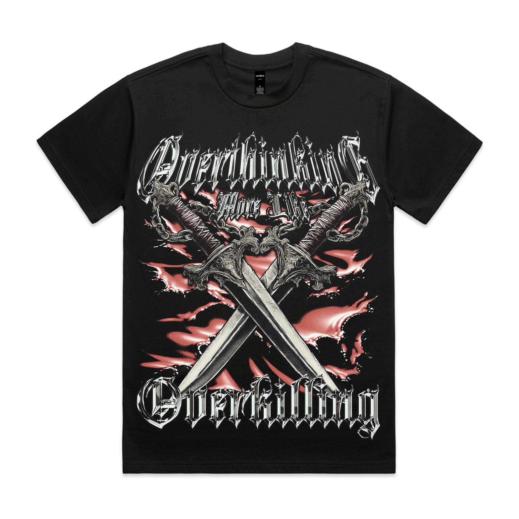 Playful message: “Overthinking? More Like Overkilling” – witty and hardcore