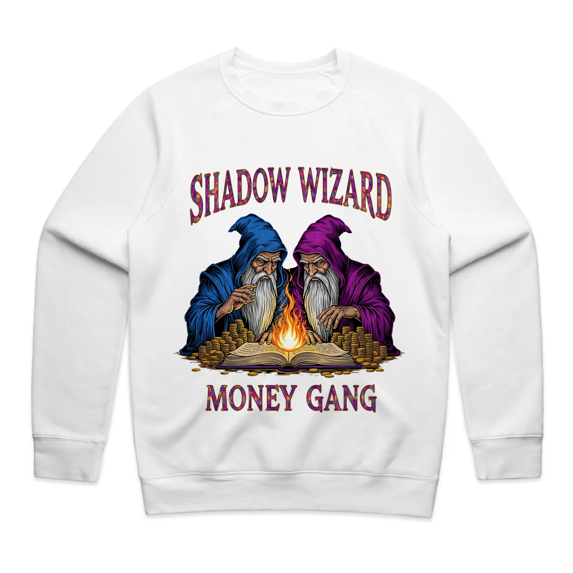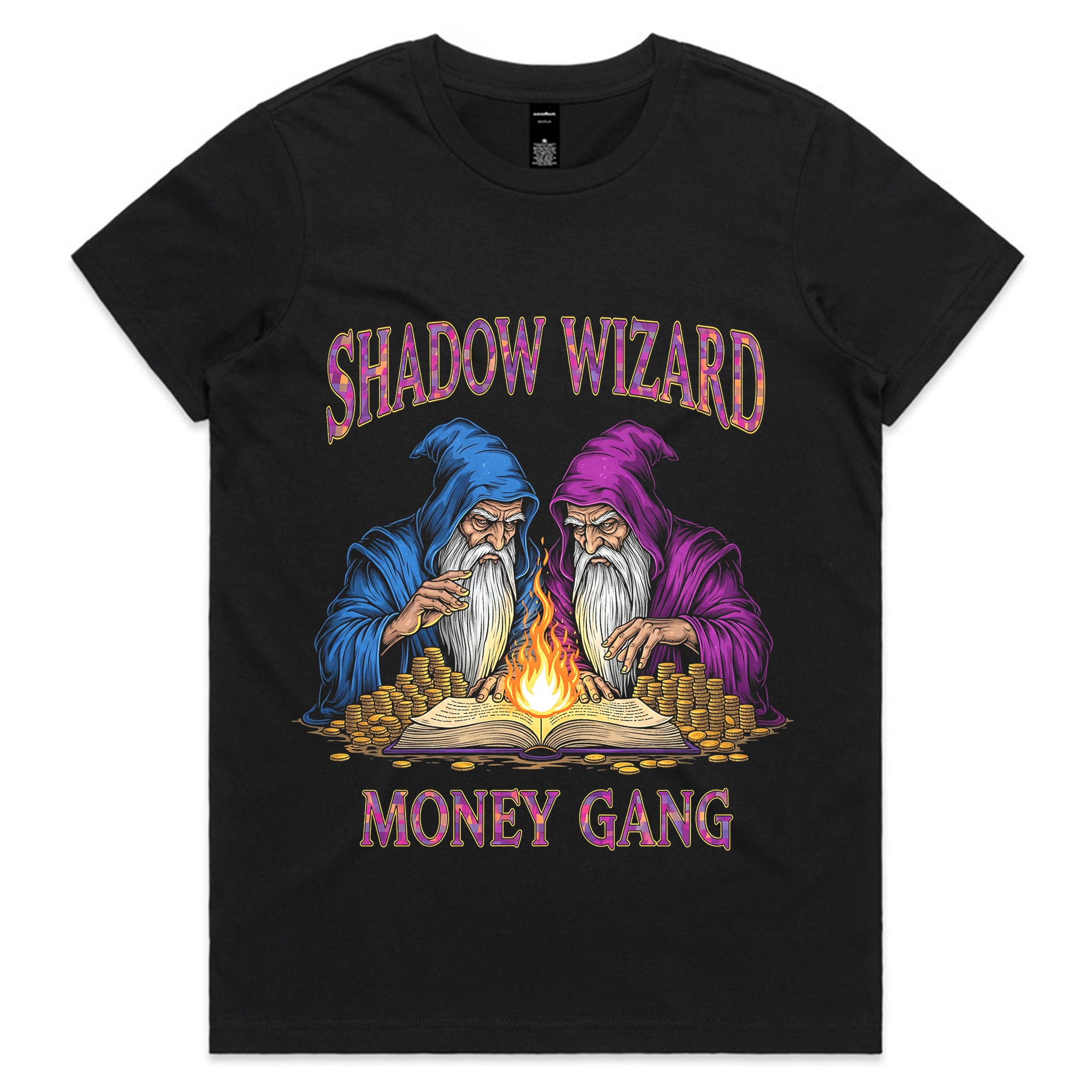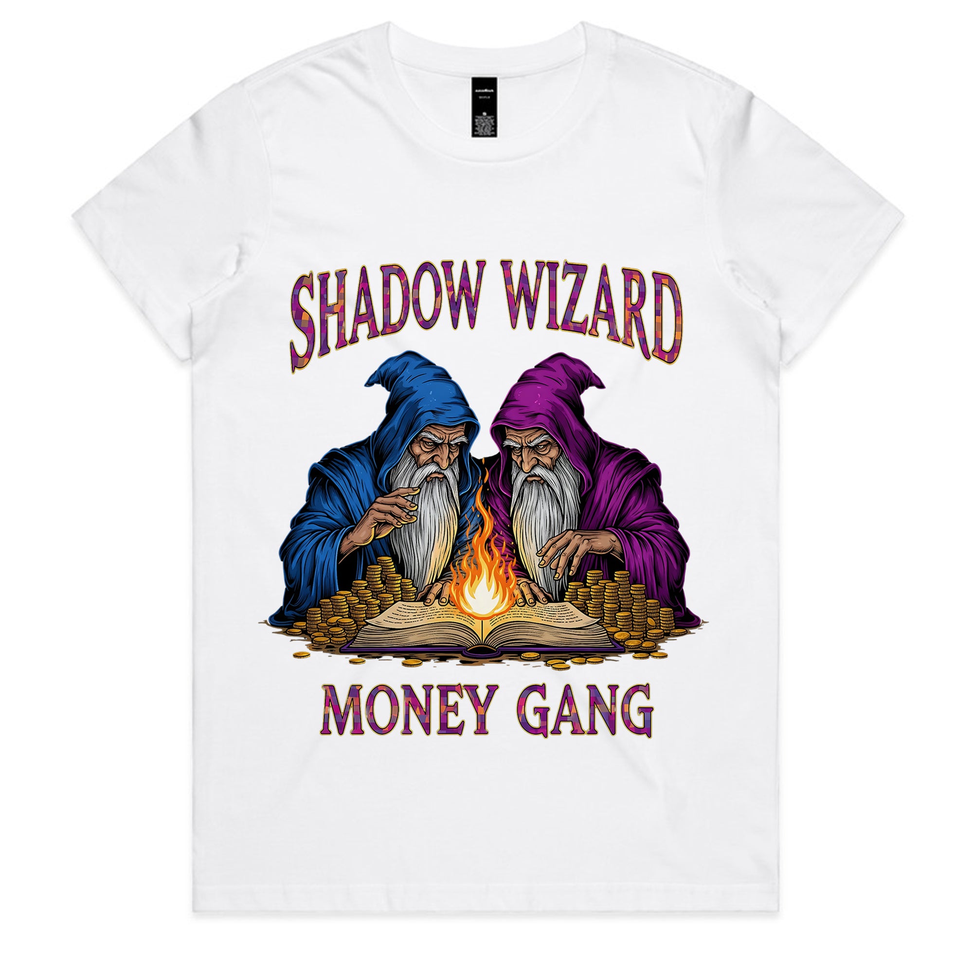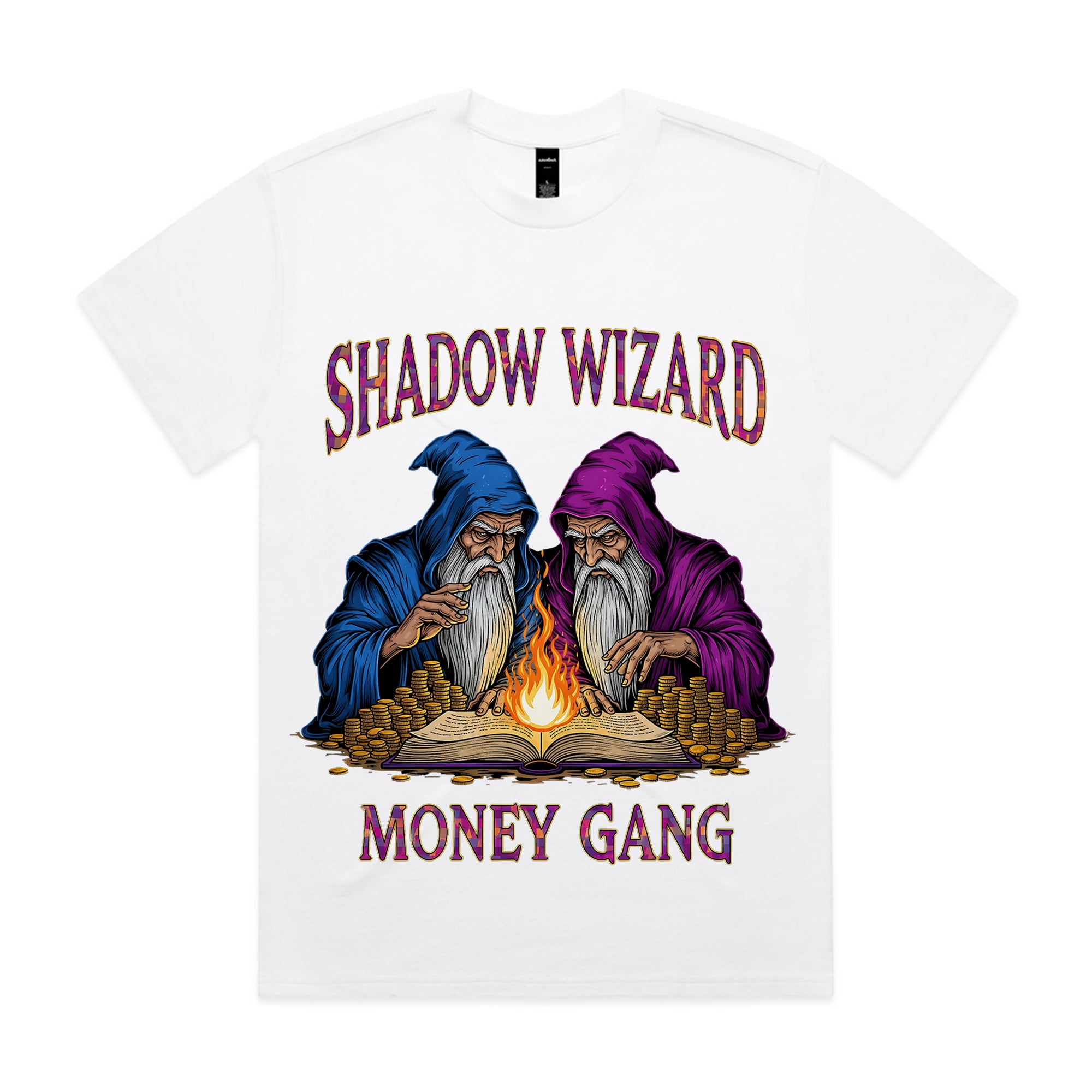 This fantasy-themed shirt shows two wizards in blue and purple robes conjuring fire over a magical book, surrounded by stacks of gold coins. The text “Shadow Wizard Money Gang” appears in colorful, stylized letters. The artwork gives off mystical yet comical vibes — perfect for fans of fantasy humor.