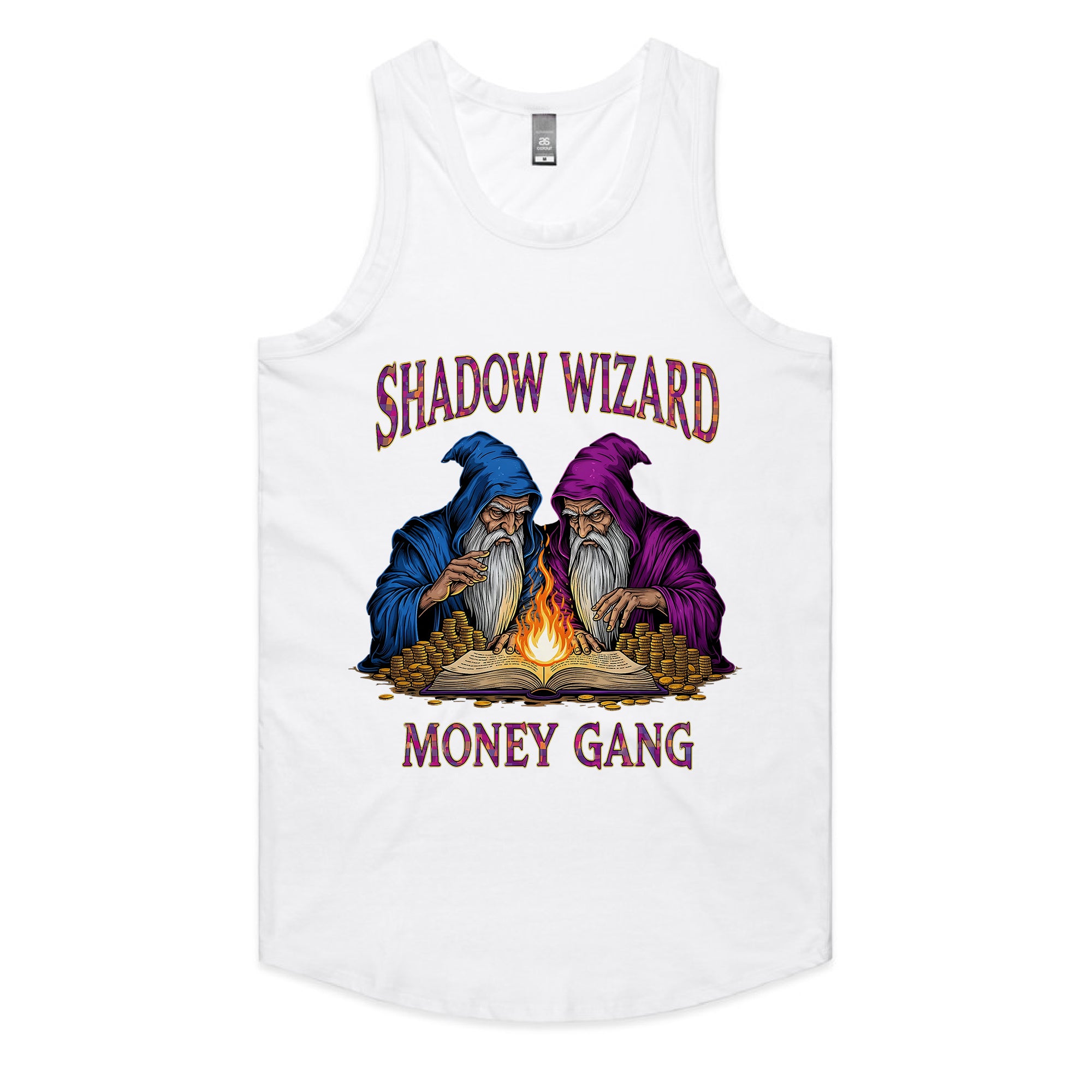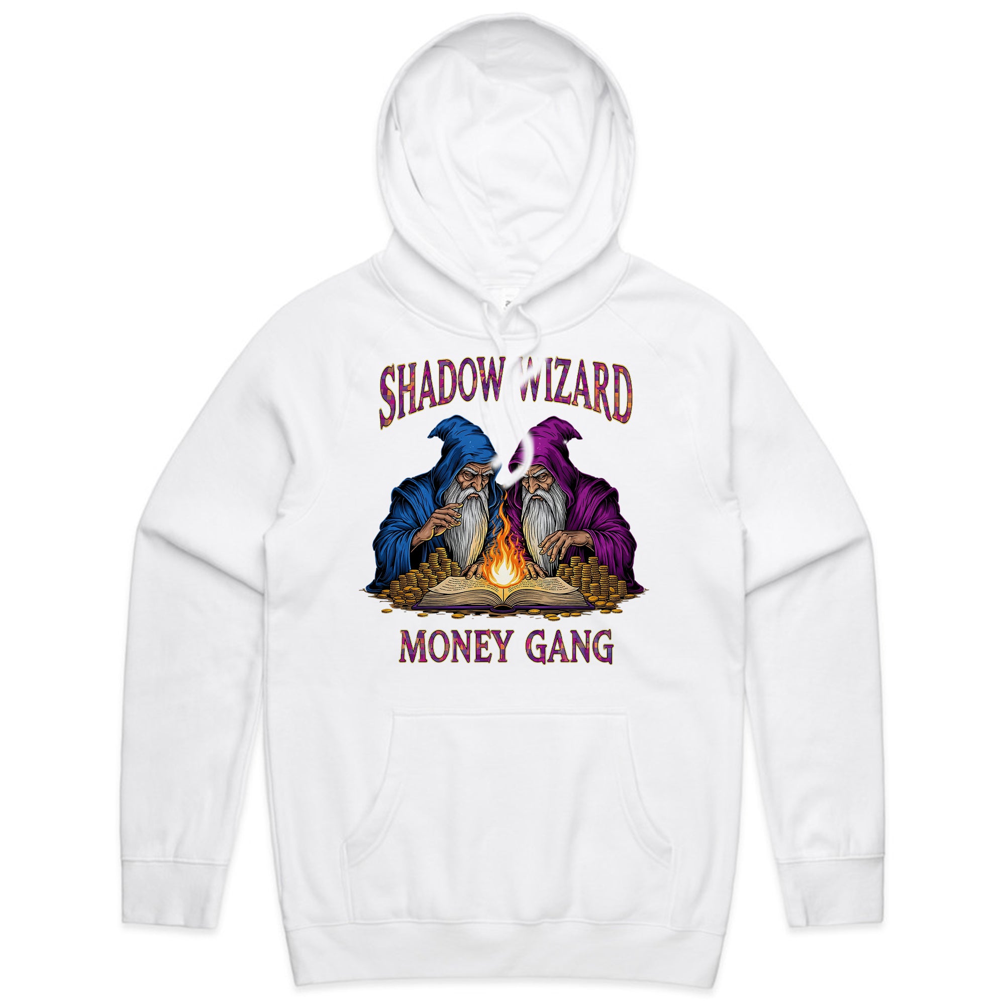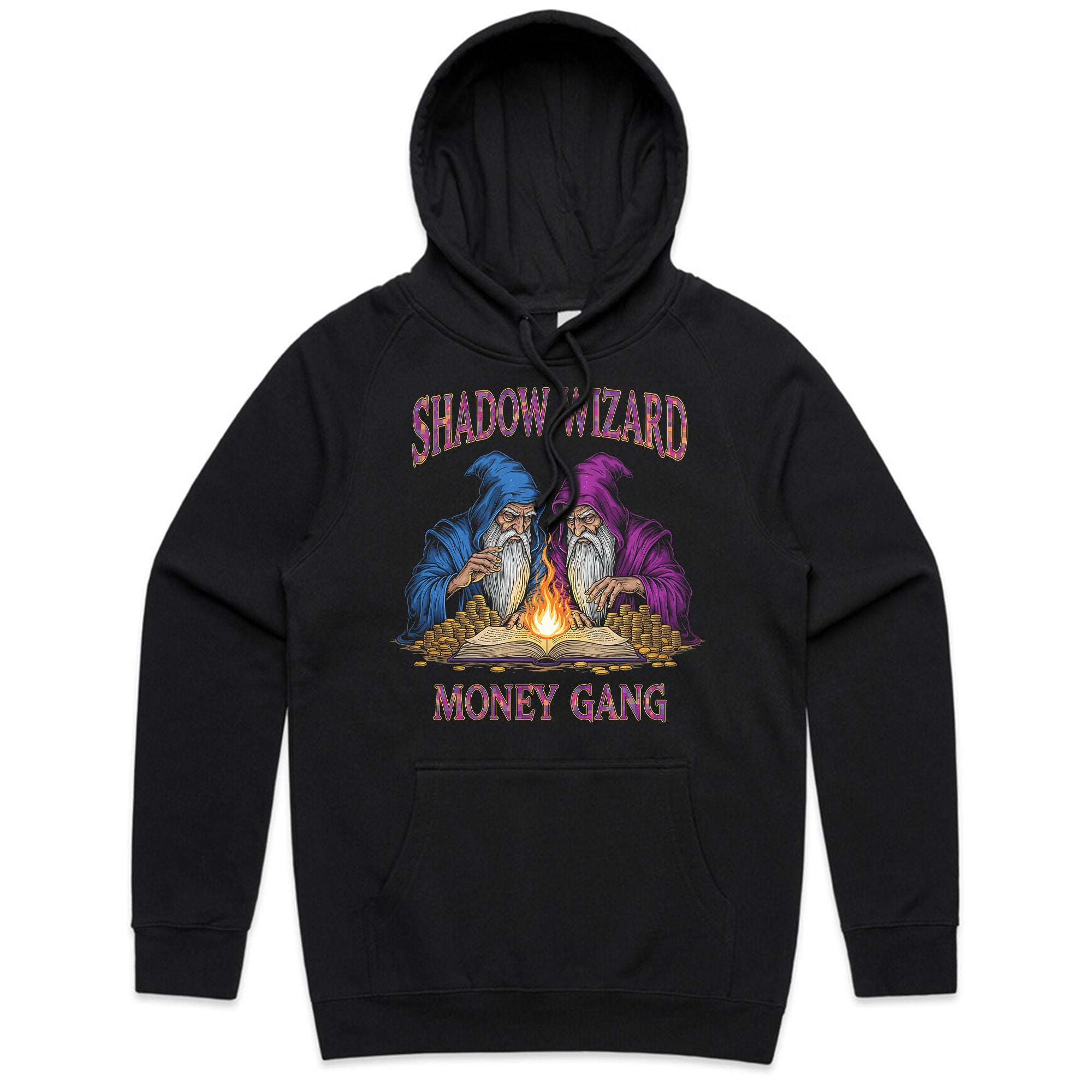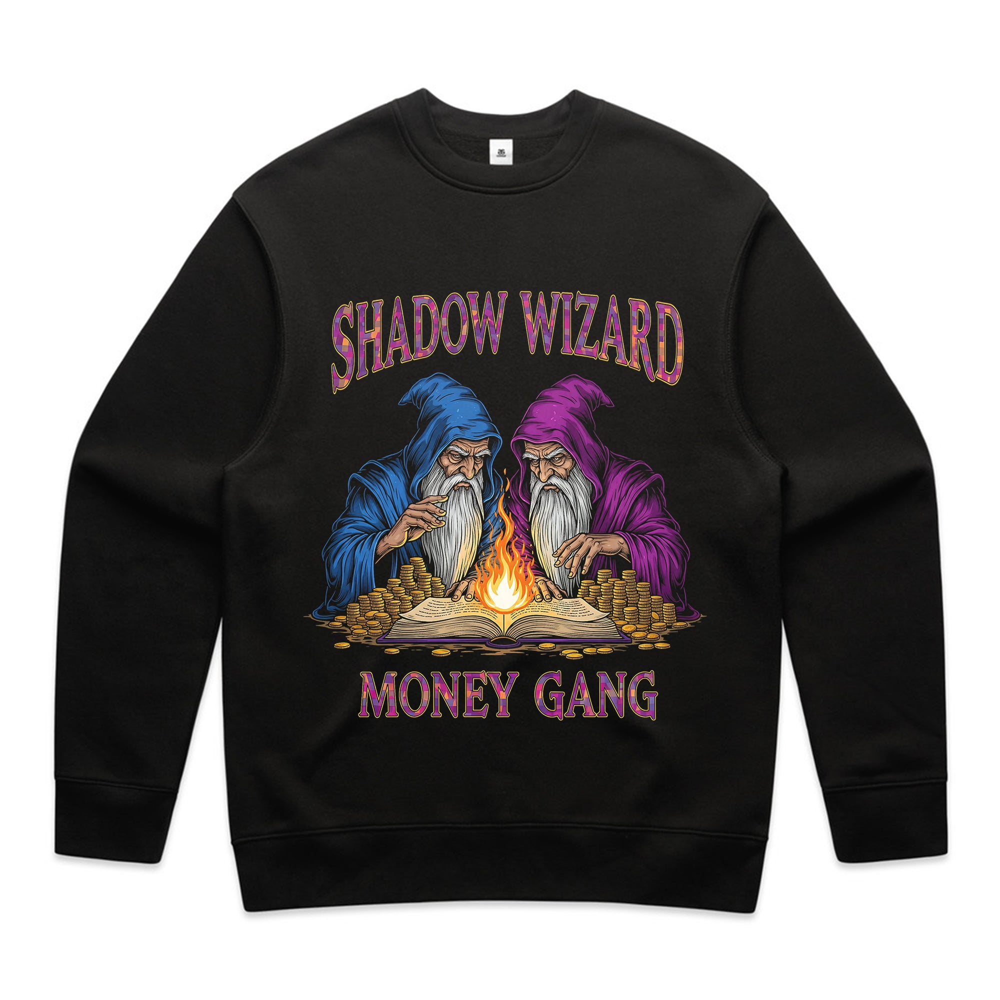 This fantasy-themed shirt shows two wizards in blue and purple robes conjuring fire over a magical book, surrounded by stacks of gold coins. The text “Shadow Wizard Money Gang” appears in colorful, stylized letters. The artwork gives off mystical yet comical vibes — perfect for fans of fantasy humor.
