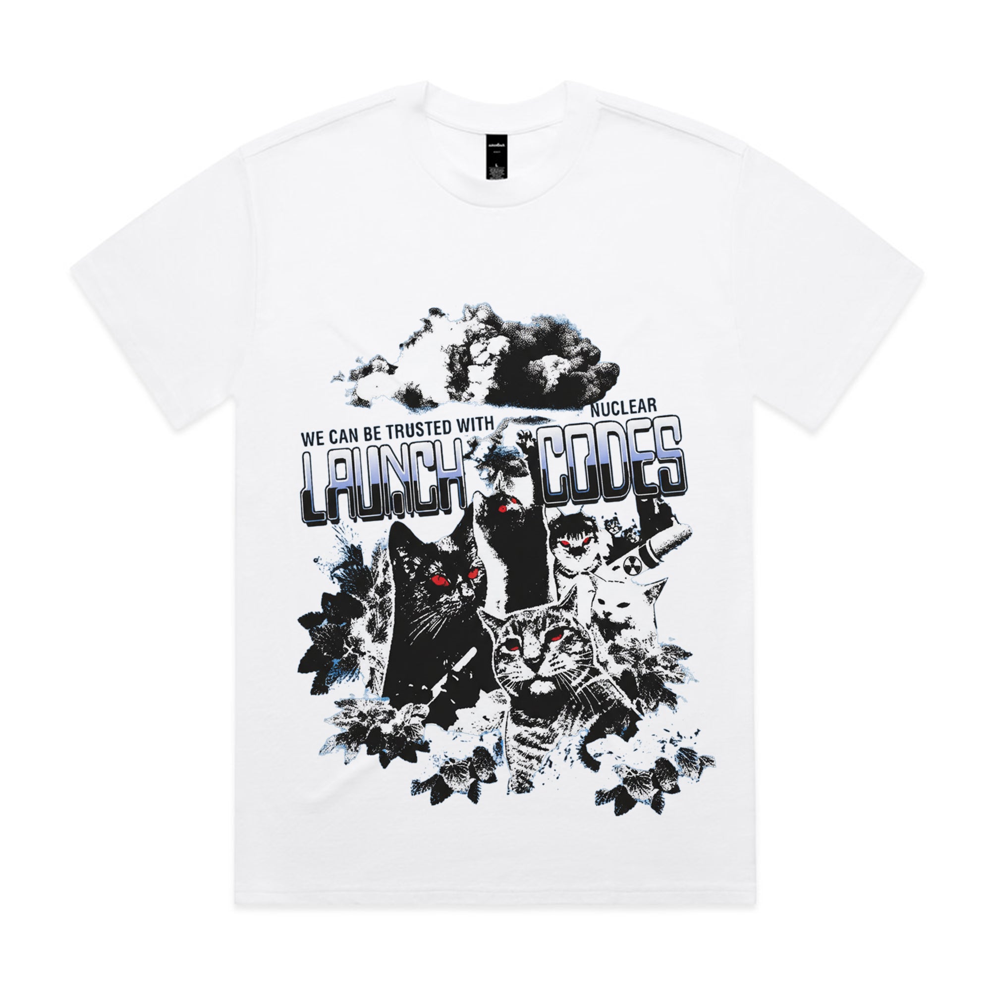 This design combines humor and chaos with a group of mischievous cats and a massive explosion in the background. The text reads “We can be trusted with nuclear launch codes.” The black, white, and gray tones with pops of red give it a rebellious and bold aesthetic.